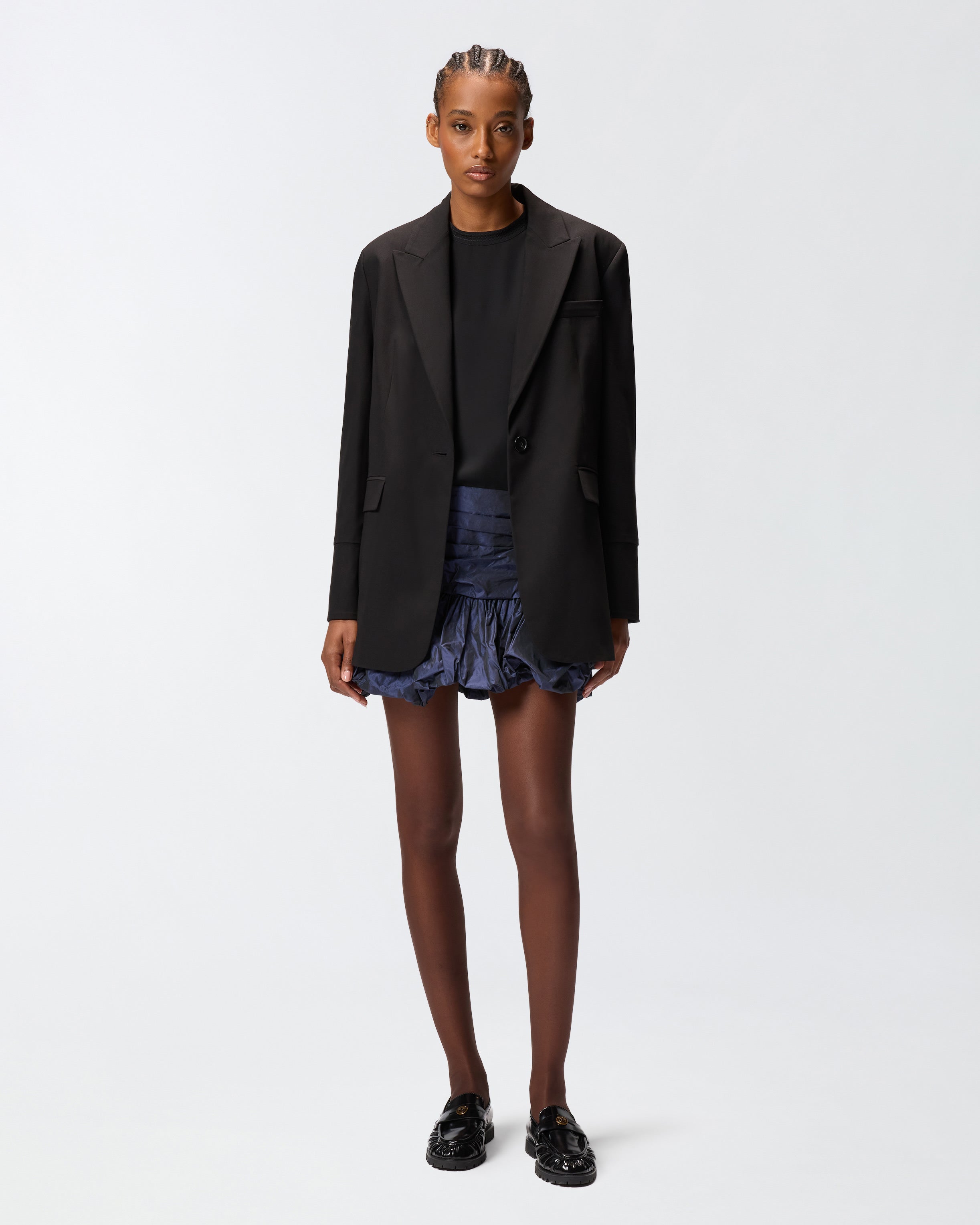 Miniskirt with draped band and zip on the back, made of taffeta. The fabric, light and shiny, creates iridescent reflections and blends perfectly with the soft and dynamic volume that distinguishes the garment. The studied cuts and contemporary lines of this short skirt are enriched by distinctive details, such as the balloon-effect hem and the draped bands. Overall, the final look is spectacular and impactful, also accentuated by the slightly crinkled fabric.