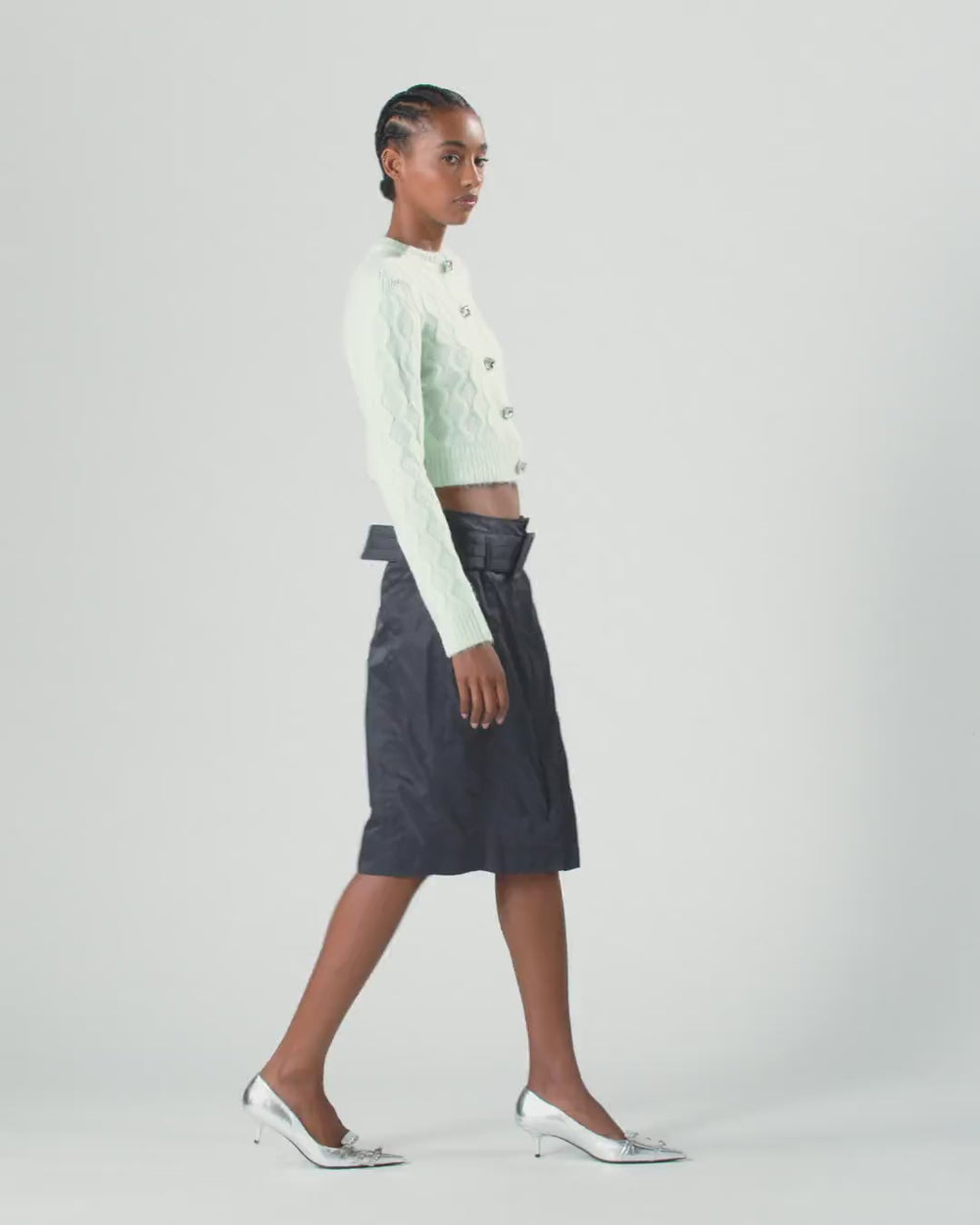 Bleistiftrock aus mattem technischem Stoff mit mattem Effekt und breitem Gürtel samt rechteckiger Schnalle, die die hohe Taille hervorhebt. Das Modell ist mit verschiedenen geometrischen Nähten versehen, die an die Welt des Sports erinnern. Praktisch, vielseitig und originell wird dieser Bleistiftrock zum Must-have der Herbst-Winter-Saison. Tragen Sie den Rock zu einem schlichten Top oder entscheiden Sie sich für eine elegantere Bluse. Dieses Kleidungsstück passt sich jedem Anlass perfekt an.