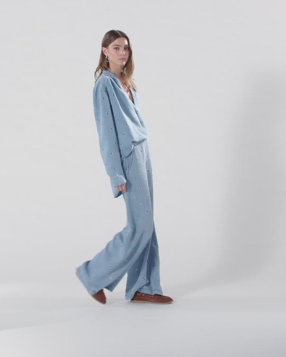 Bluse mit weicher Silhouette, langen Ärmeln, abgerundetem Saum und Stehkragen, der sich in einen tiefen V-Ausschnitt öffnet. Das Modell zeichnet sich durch seine besondere Verarbeitung aus: Der Stoff aus leichtem und fließendem Denim aus reinem Lyocell zeichnet sich durch einen geschickt gebleichten Effekt aus und ist vollständig mit kleinen Metallösen verziert, die einen raffinierten Perforationseffekt erzeugen. Verleihen Sie Ihrem Tageslook ein originelles Statement, indem Sie die Bluse mit der passenden Jeans kombinieren. - BELLICOSO BLOUSE