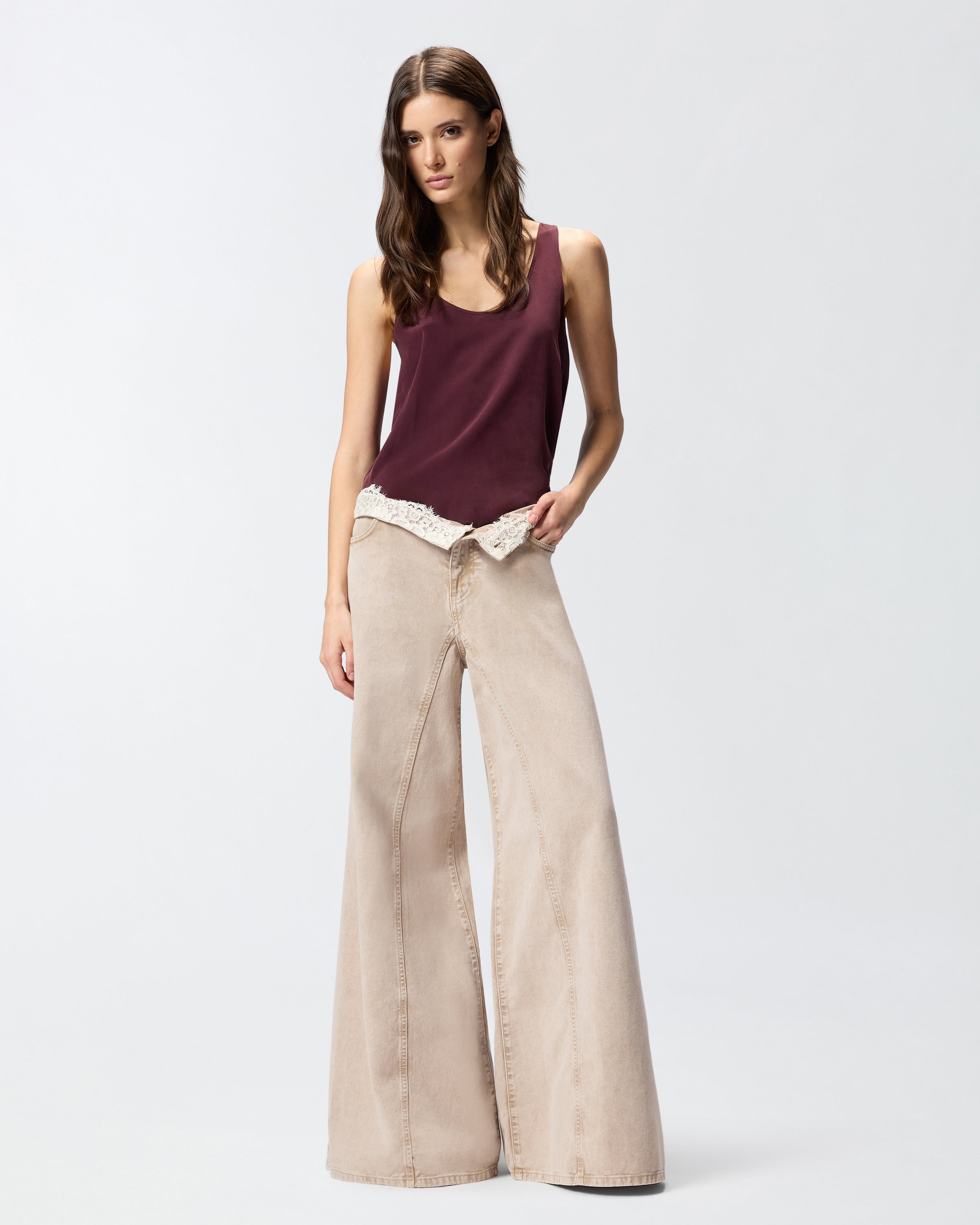 Five-Pocket-Jeans mit Super Wide Leg aus braunem Bull Denim in Baumwolle mit auffälligem Bleicheffekt, die sich durch eine Innenseite aus cremefarbener Spitze auszeichnet. Mit Reißverschluss und Innenknopf kann das Modell auf zwei Arten getragen werden: entweder mit hoher Taille für einen einfarbigen Look oder mit umgeschlagener Taille mit sichtbarer Spitze für einen raffinierten Hauch von Originalität im reinen Stil von PINKO. - WINONA WIDE LEG WAIST DOWN