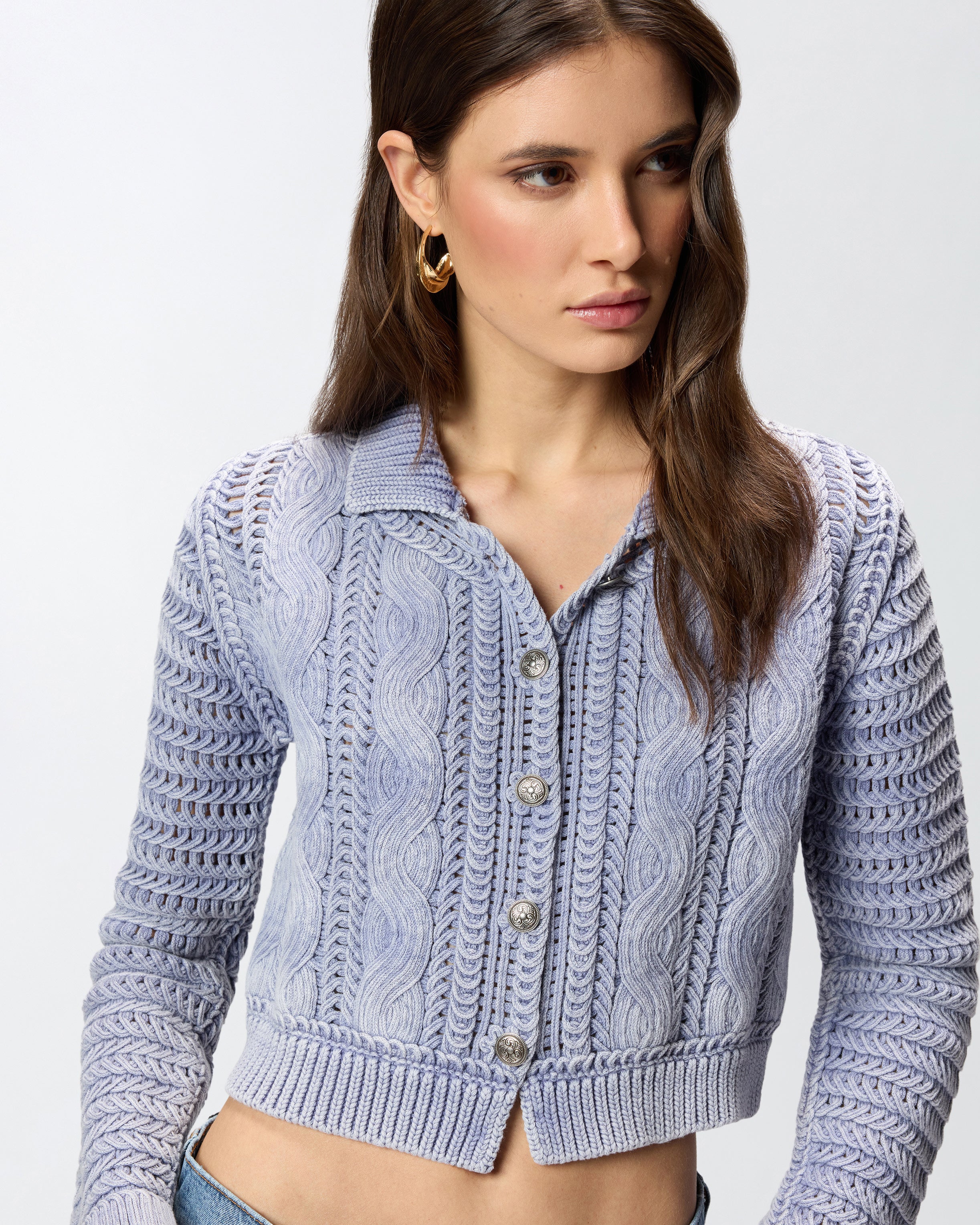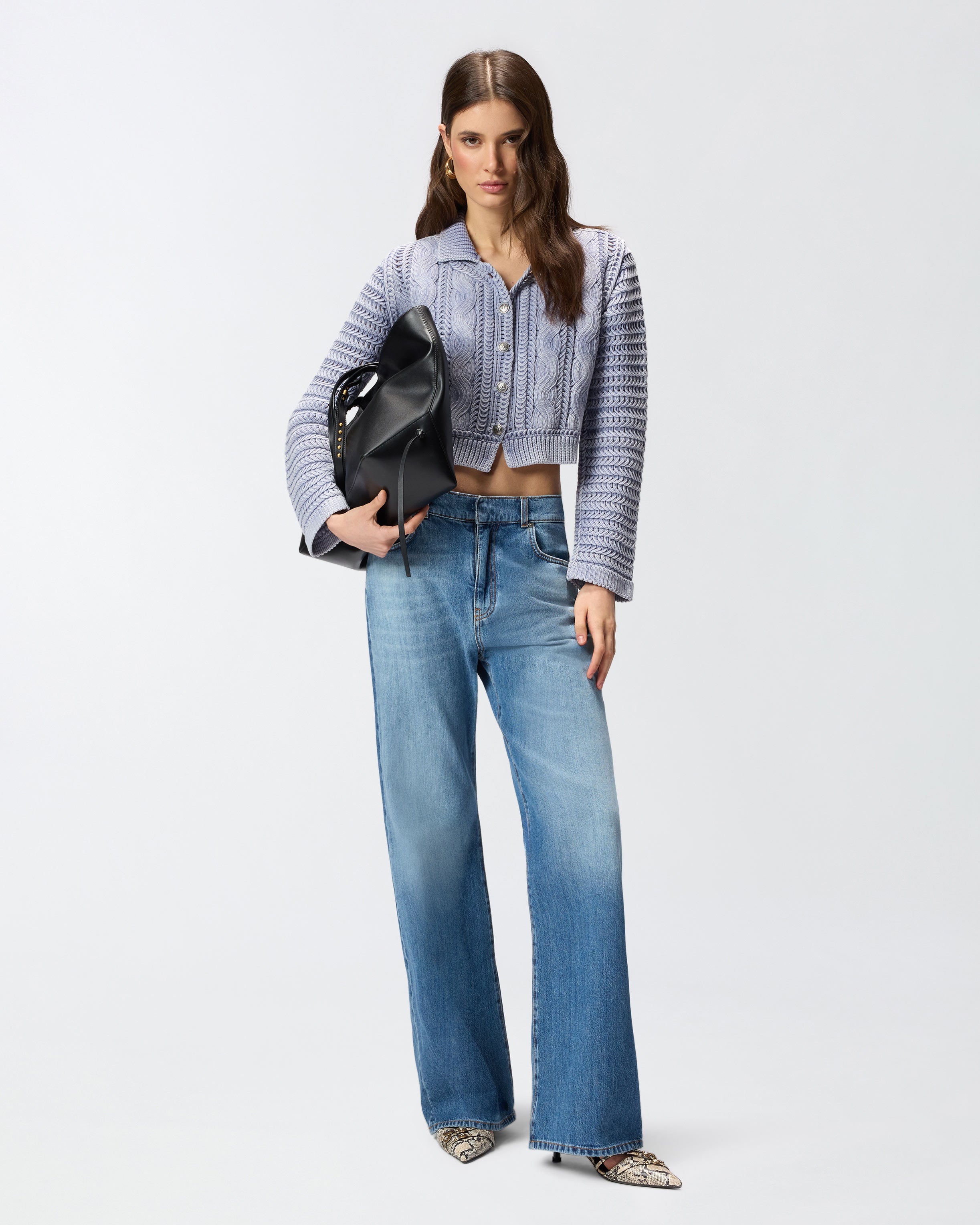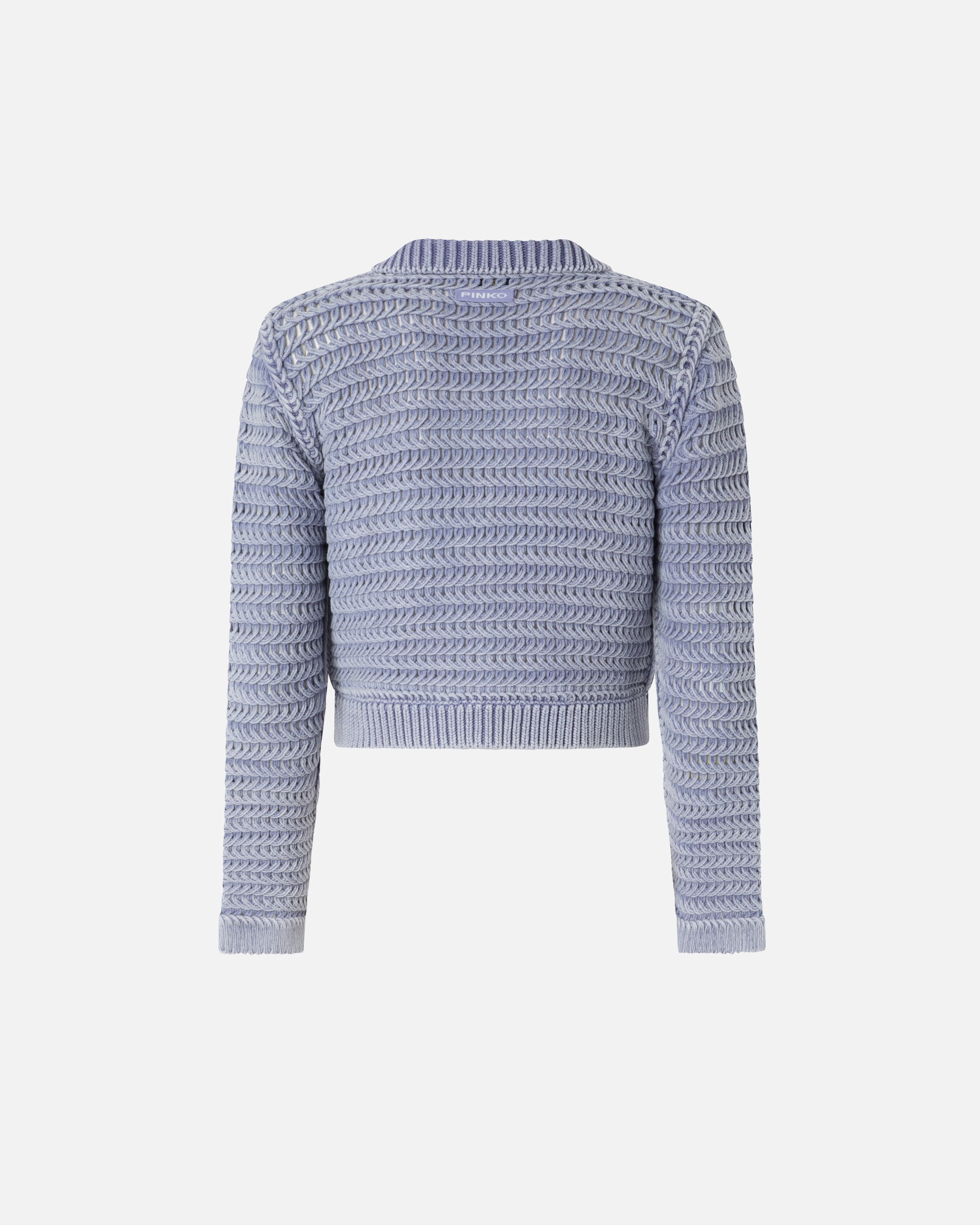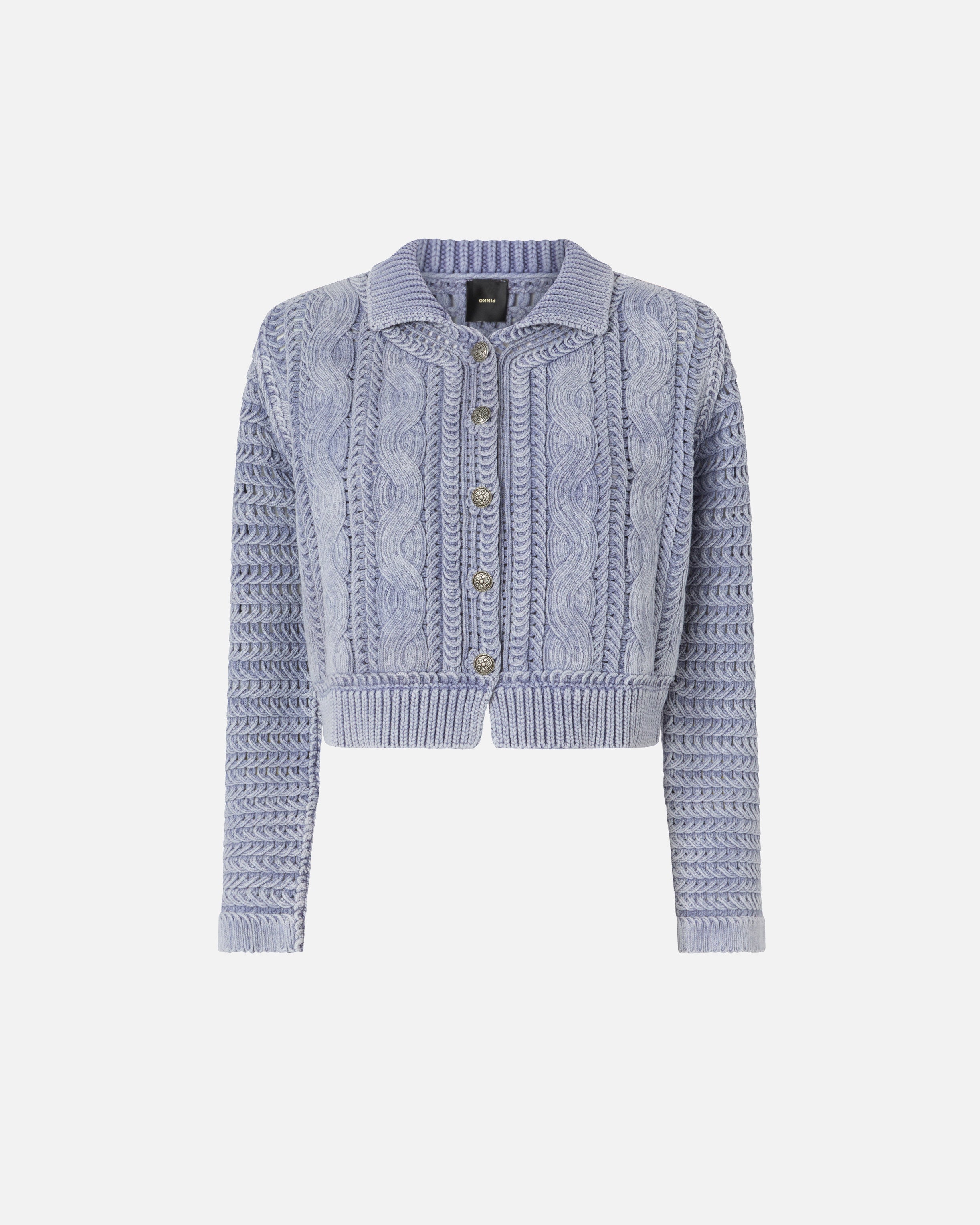 Cropped-Cardigan aus Garn in reiner Baumwolle mit einer Mischung aus grober Strick- und Zopfverarbeitung am Hauptteil und einer feineren Rippstrickverarbeitung am Kragen und am Saum. Die Stückfärbung des Stoffes erzeugt für jedes Modell einzigartige unregelmäßige Farbnuancen und verleiht ihm einen Vintage-Look, während die Knöpfe des vorderen Verschlusses mit einem raffinierten geometrischen Muster verziert sind. Abgerundet wird der Pullover durch die Etikette mit dem PINKO-Logo in Jacquard als Lettering auf der Rückseite.