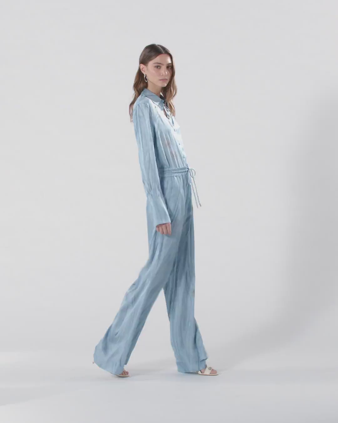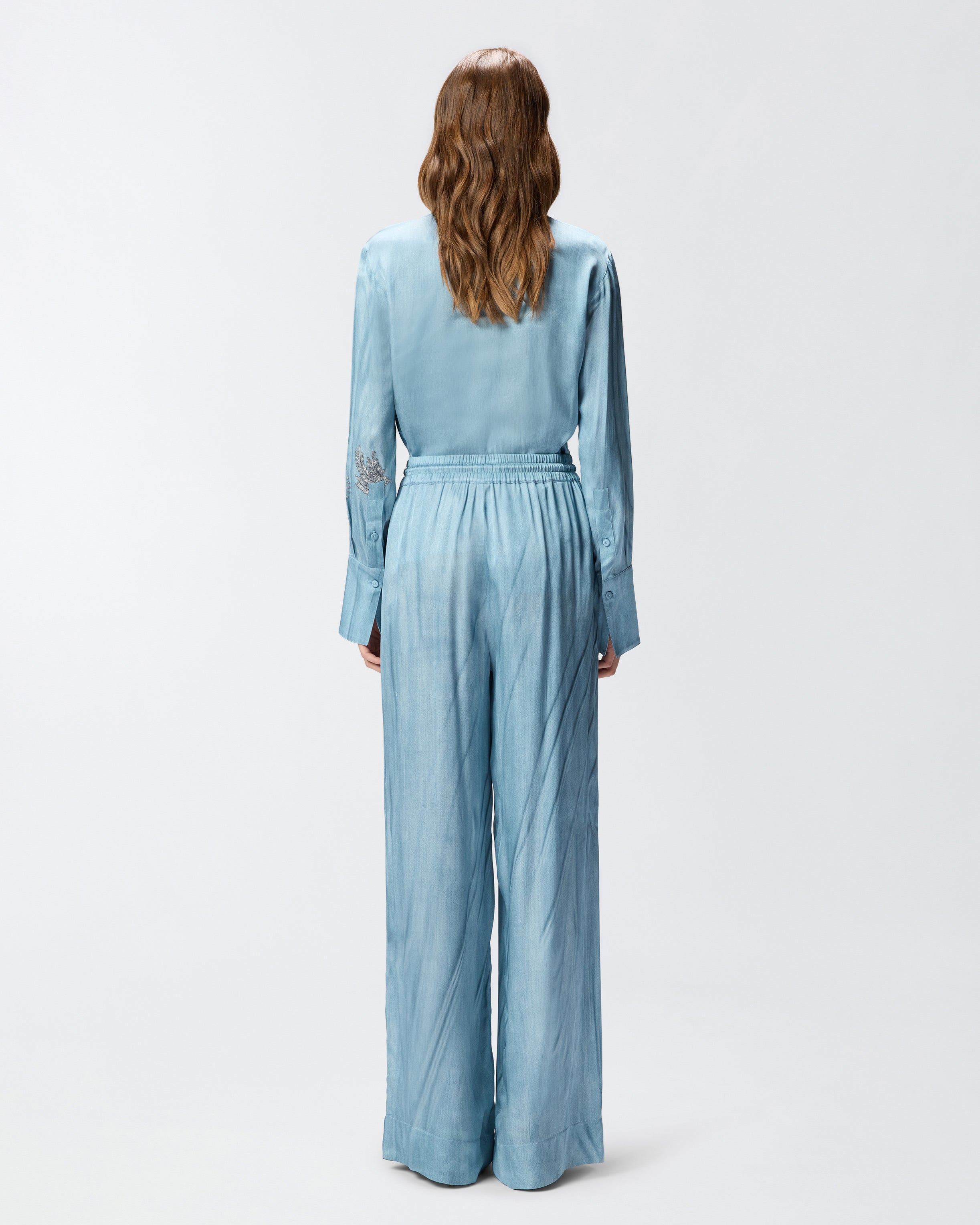 Hose mit weitem, geradem Bein und elastischem Bund mit Tunnelzug. Das Modell besteht aus fließendem Viskose-Satin, auf dem ein Trompe-l 'œil-Print mit farblosem und drapiertem Denim-Effekt angebracht ist, der durch ein Muster mit Schmucknadeln am Bein abgerundet wird. Verwandeln Sie Ihr Outfit in ein Kunstwerk und tragen Sie diese Hose mit dem passenden Hemd für einen originellen Total Look, mit dem Sie nicht unbemerkt bleiben werden. - RIKKY TROUSERS
