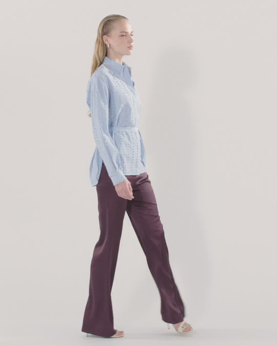 Oversize-Bluse aus garngefärbtem Popeline in Baumwolle mit klassischem Kragen, langen Ärmeln mit Knöpfen an den Manschetten, verdecktem Verschluss an der Vorderseite, wobei der erste Knopf sichtbar ist, und Taillengürtel, der nach Belieben verstellt und gebunden werden kann. Das Modell zeichnet sich durch das typische vertikale Streifenmuster in Weiß und Blau aus, das von einem zusätzlichen Streifenmuster überragt wird, bei dem kleine Metallelemente in Form eines Würfels und von Hand bestickte Kristalle mit Einfassung abwechseln, die auch entlang des gesamten Kragenrandes angebracht sind. Dank des Aufeinandertreffens der Vielseitigkeit des Musters und der Kostbarkeit der Verzierung wird dieses Kleidungsstück zu Ihrem Ass im Ärmel, um immer unterschiedliche Looks zusammenzustellen, je nach Stil und Anlass. - CARLEY SHIRT