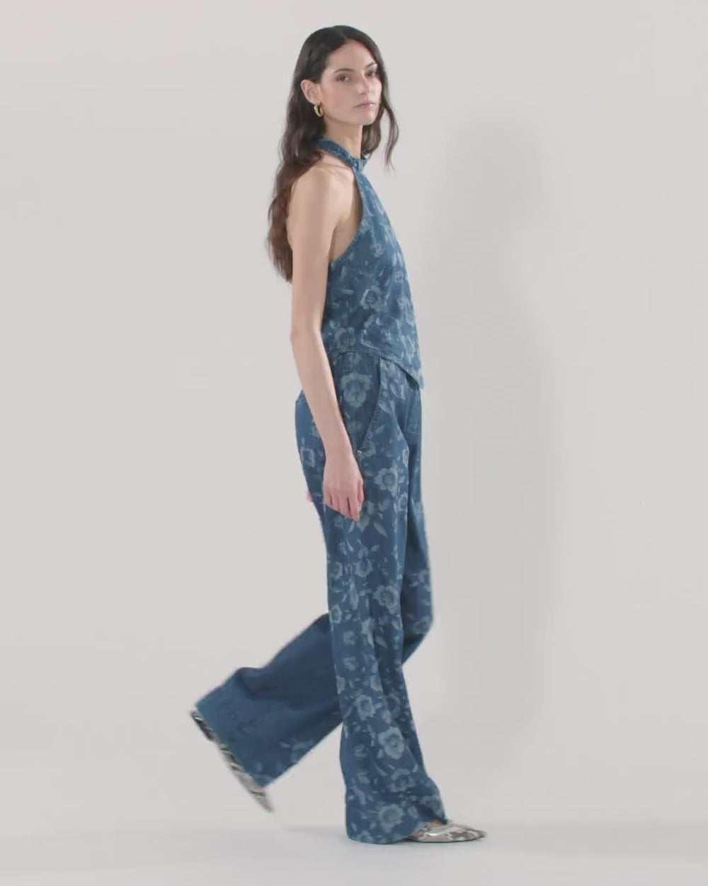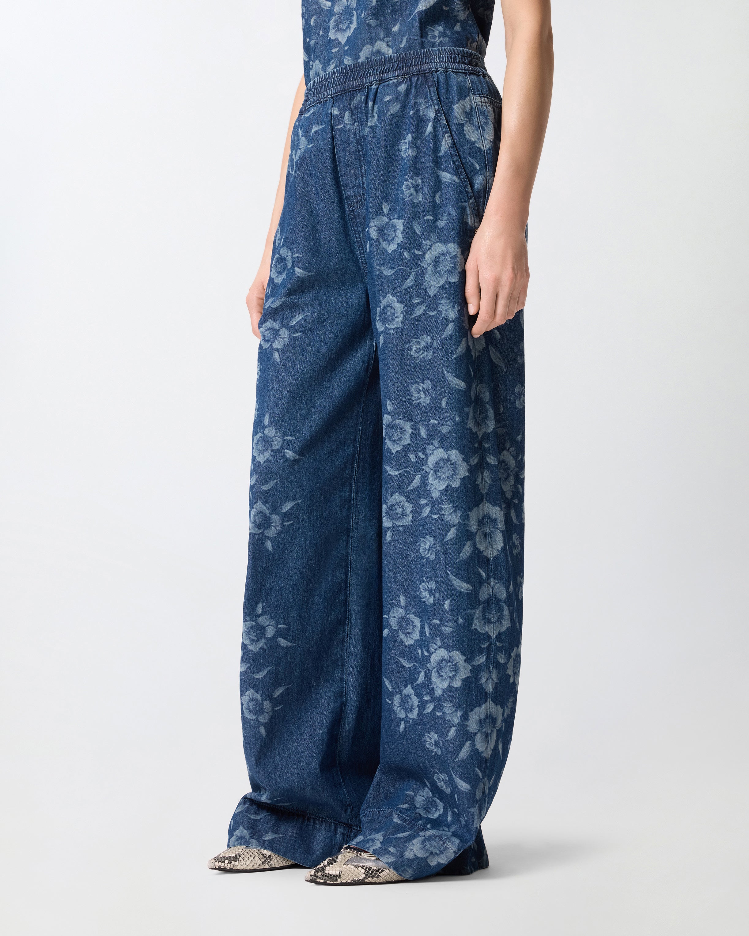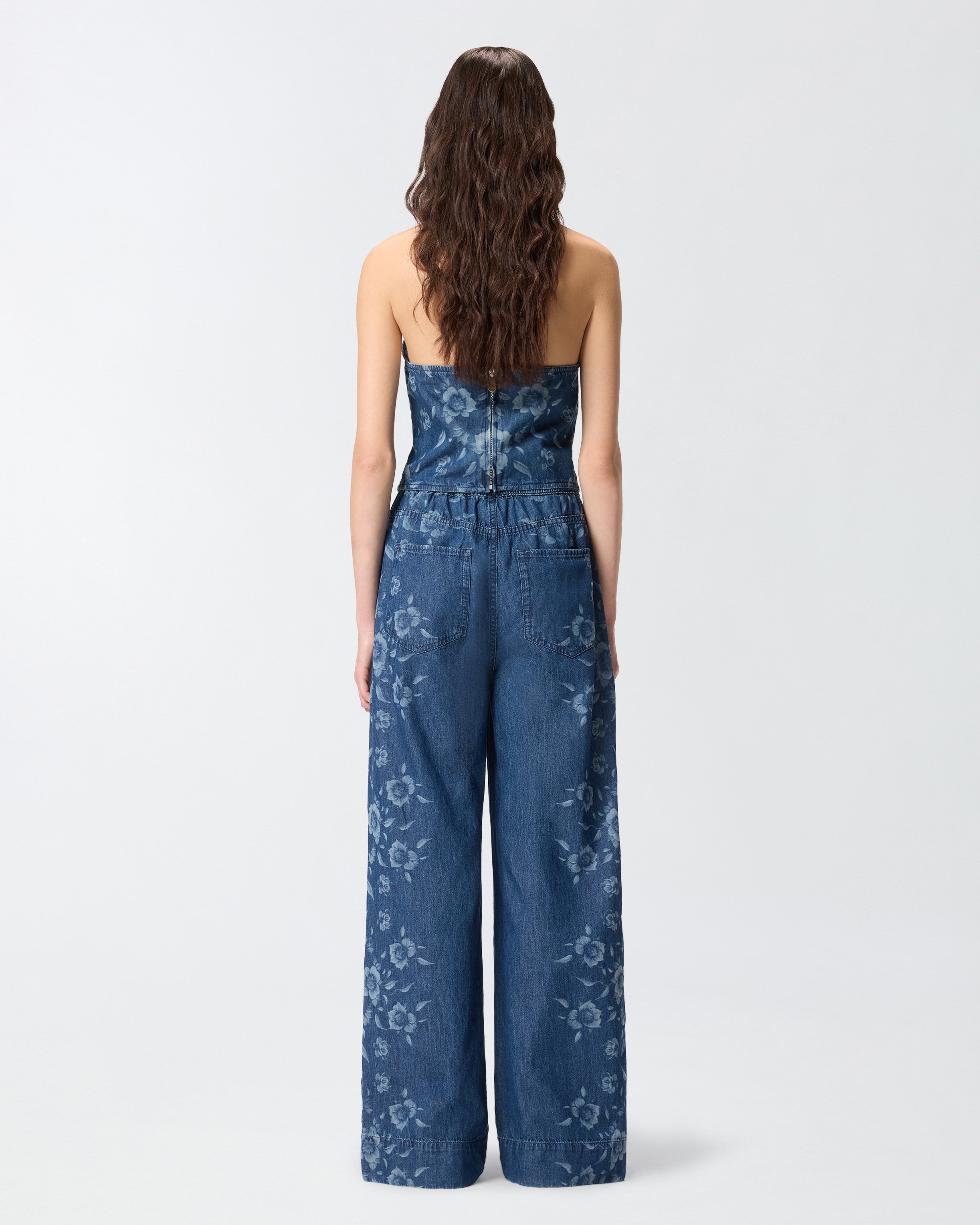 Hose mit leicht ausgestelltem Bein aus leichtem Denim in reiner Baumwolle mit einer abgesetzten Laserverarbeitung, die ein elegantes Blumenmuster entstehen lässt. Das Modell ist mit einem praktischen elastischen Bund, zwei Seitentaschen und zwei aufgesetzten Gesäßtaschen ausgestattet, von denen eine mit dem ikonischen Logo der Marke in Form eines Letterings versehen ist. Diese Jeans ist eine Neuinterpretation eines Klassikers der Damengarderobe im Stil von PINKO und passt perfekt zum passenden Oberteil, sodass ein raffinierter Total-Denim-Look entsteht, oder zu einem weißen T-Shirt für ein lässiges, aber raffiniertes Outfit.