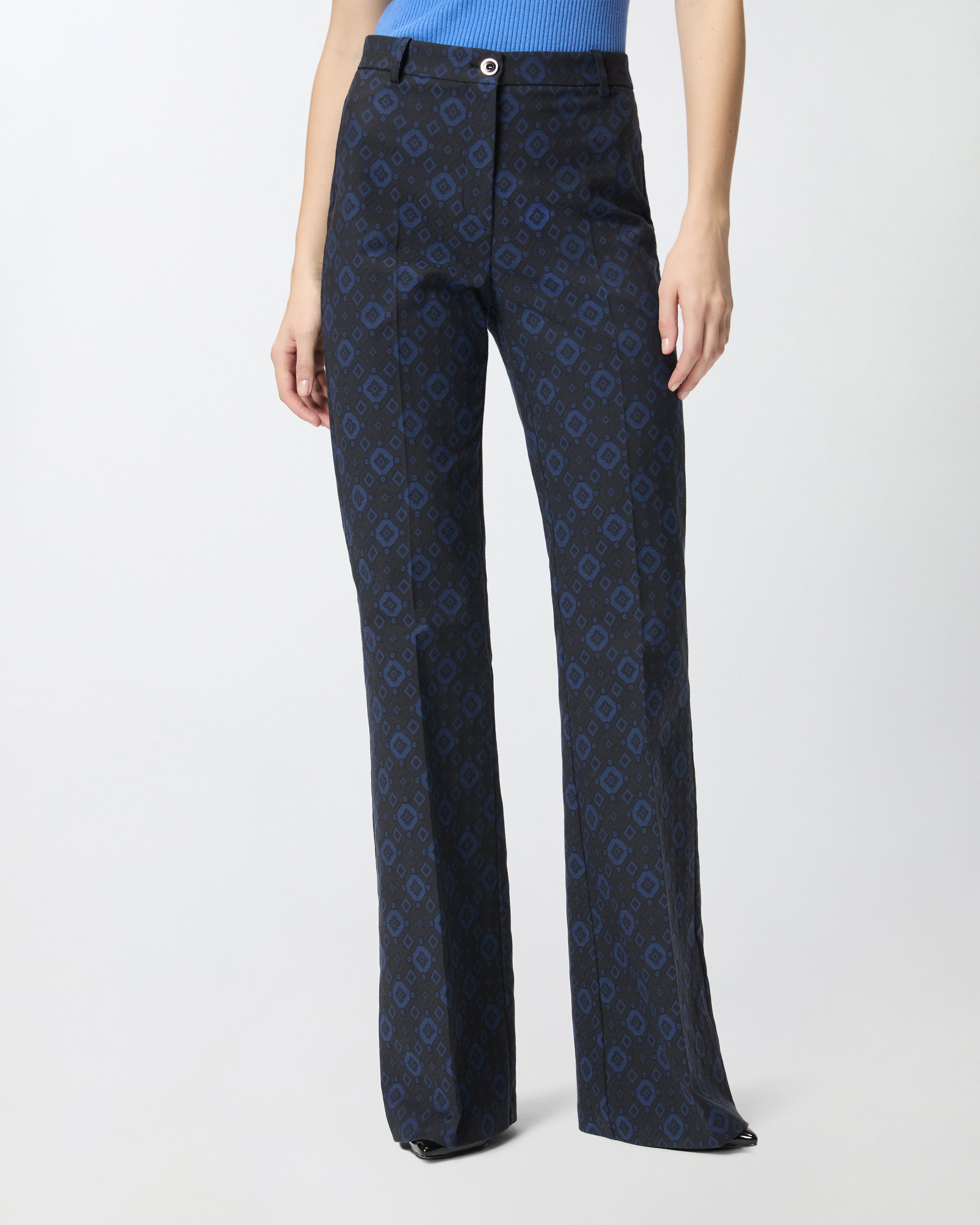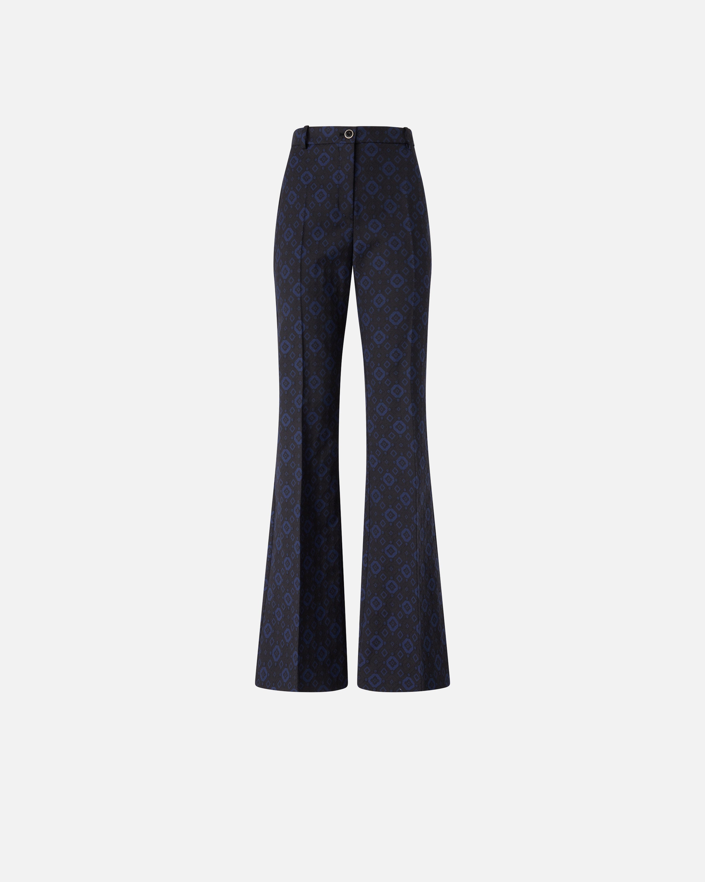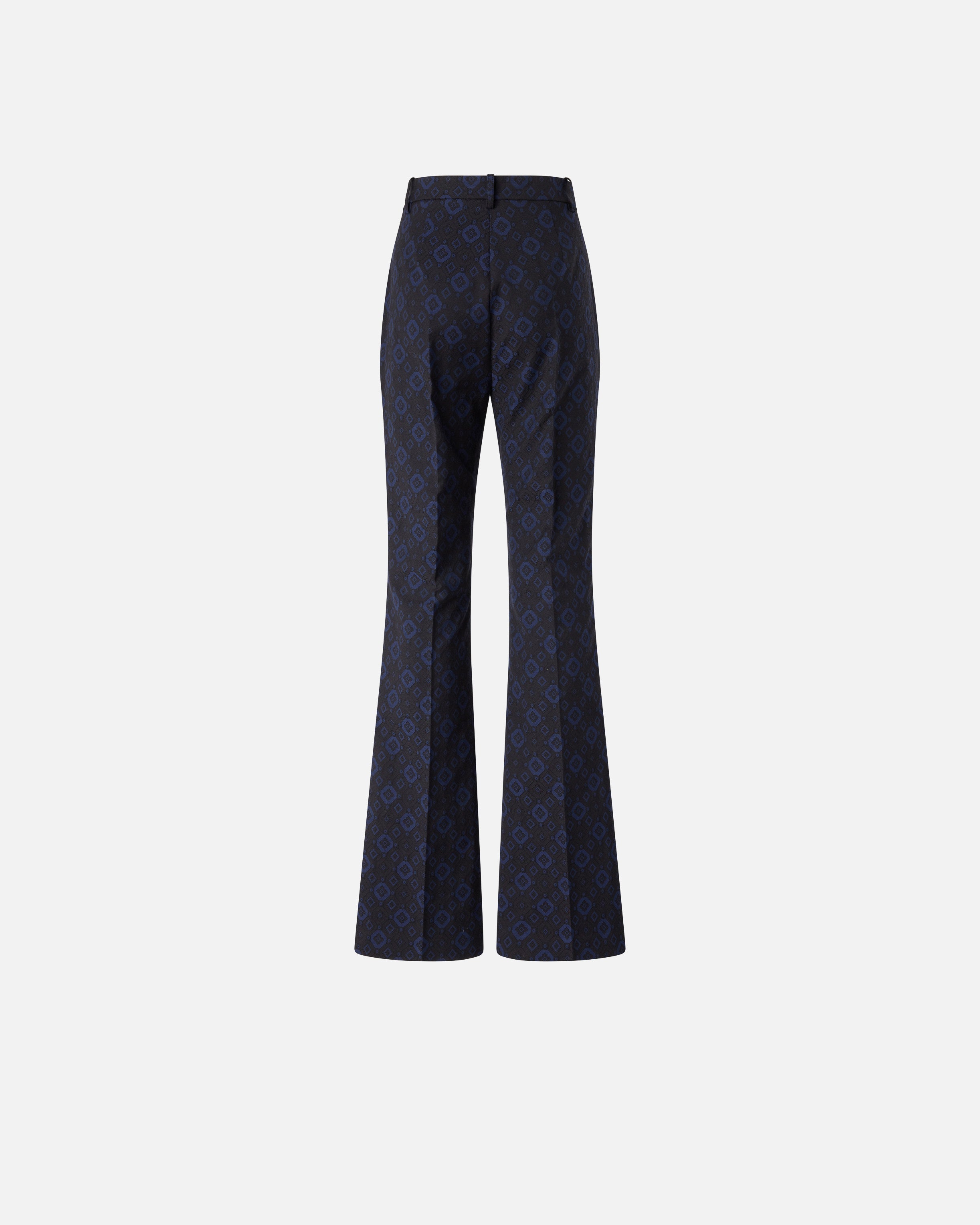 Diese Hose besteht aus Jacquard in einem Baumwollmix mit Stretchanteil und ist mit einem eleganten Mikromuster mit geometrischen und floralen Formen verziert. Das Kleidungsstück mit ausgestellter Linie, die die Figur betont, hat Gürtelschlaufen und eine raffinierte Bügelfalte in der Mitte vorne und hinten entlang des Beins. Das Innenfutter sorgt für mehr Tragekomfort. Kombinieren Sie diese Hose mit der passenden Jacke, um einen idealen femininen Total Look für besondere Anlässe zu kreieren, oder tragen Sie ihn mit einem lässigeren Oberteil für ein zusammengesetztes Outfit.
