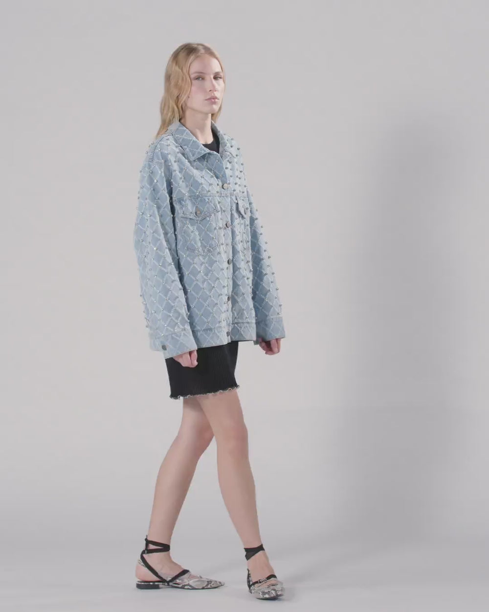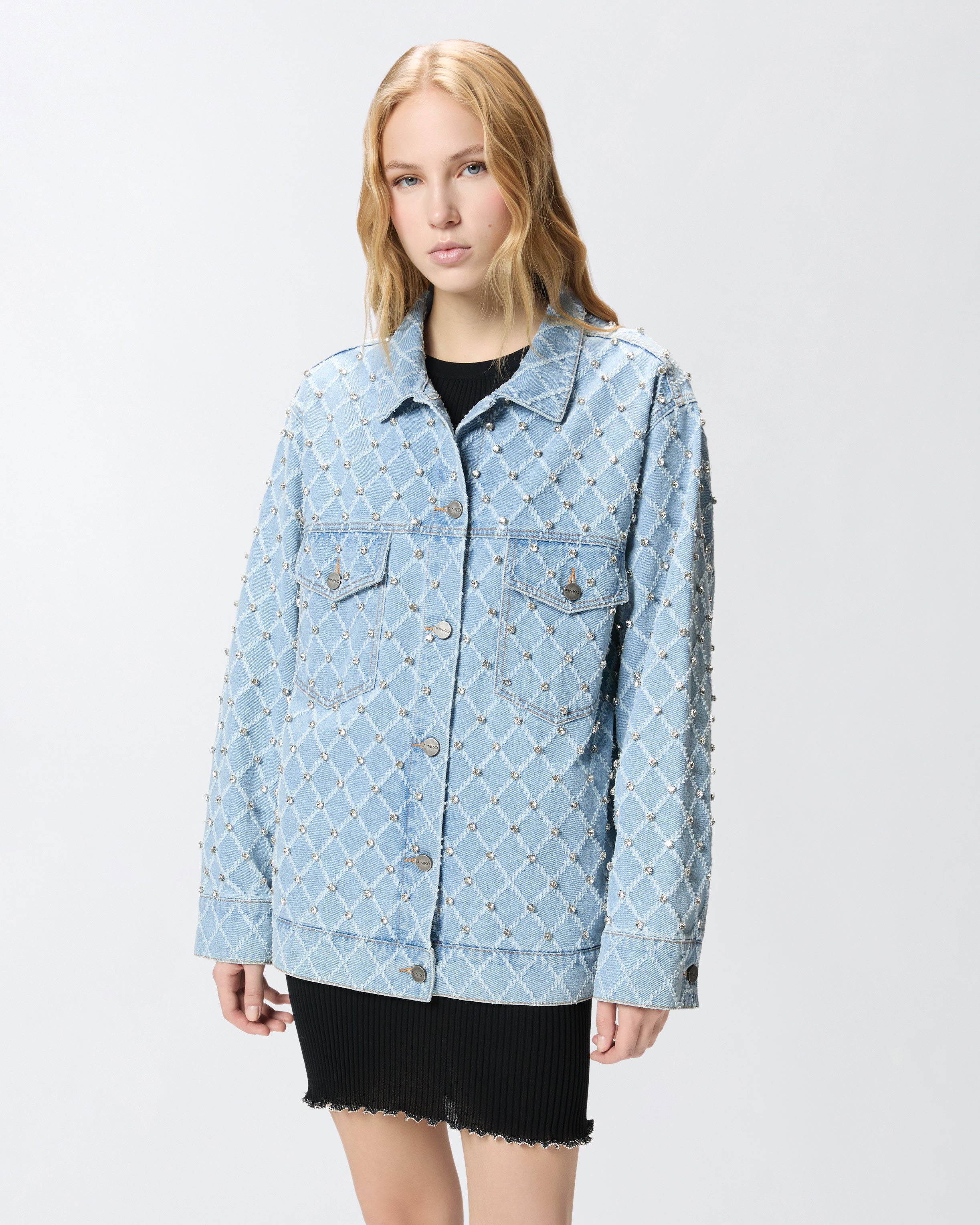 Jacke aus Denim in reiner Baumwolle mit Hemdkragen, aufgesetzten Taschen vorne mit Patte und Knopf sowie Manschetten mit Knöpfen. Das Modell setzt auf ein modernes Spiel der Kontraste, wie es nur PINKO kann: Der Minimalismus des Designs wird mit dem leicht kontrastierenden, lasergeschnittenen Rautenmuster kombiniert, das mit leuchtenden, händisch aufgestickten Strasssteinen verziert ist. Tragen Sie dieses Kleidungsstück mit den passenden Jeans und machen Sie sich bereit, Ihre Alltagslooks zum Leuchten zu bringen! Das Model ist 177cm groß und trägt Größe 40. - PIFFERAIO OVERSHIRT