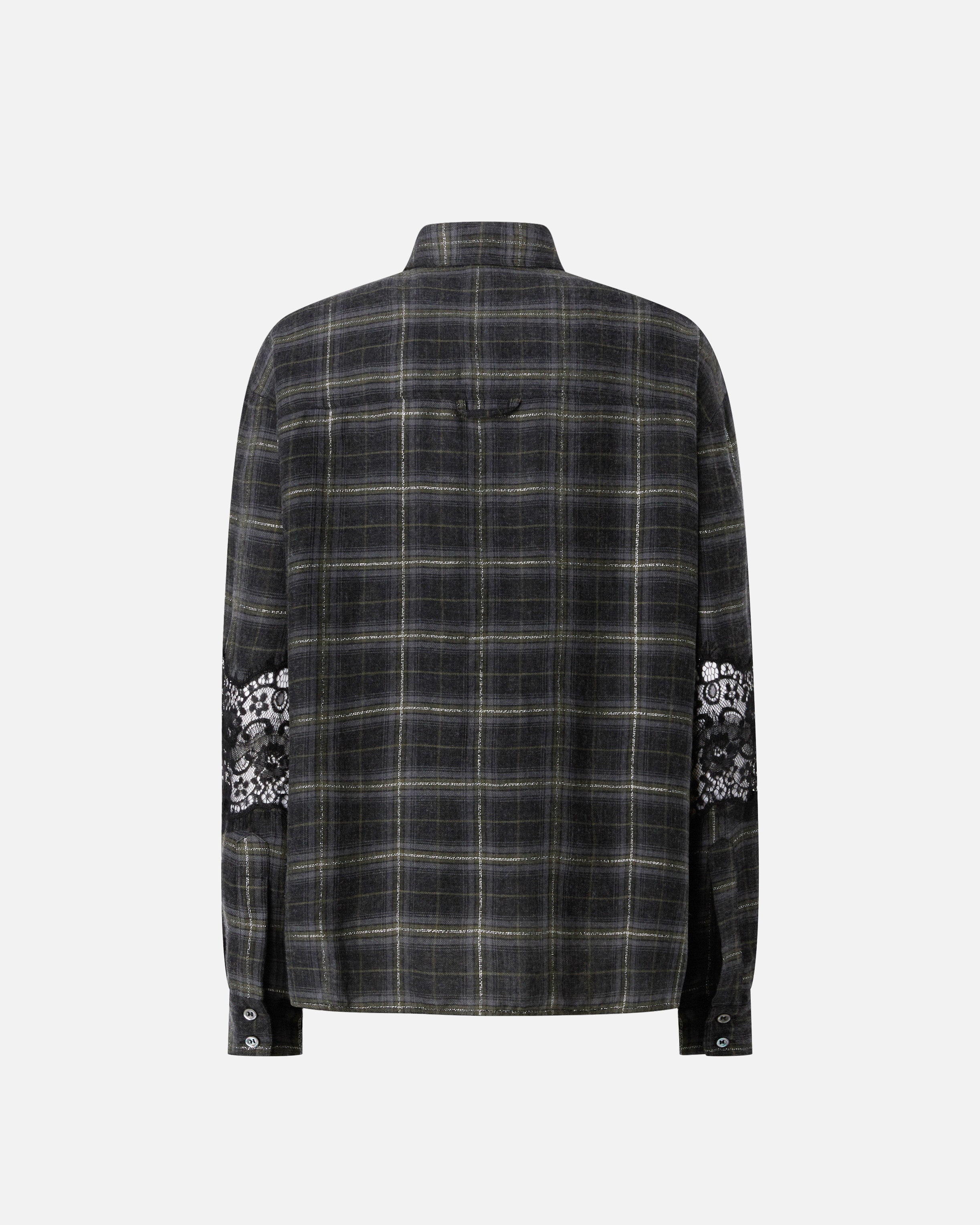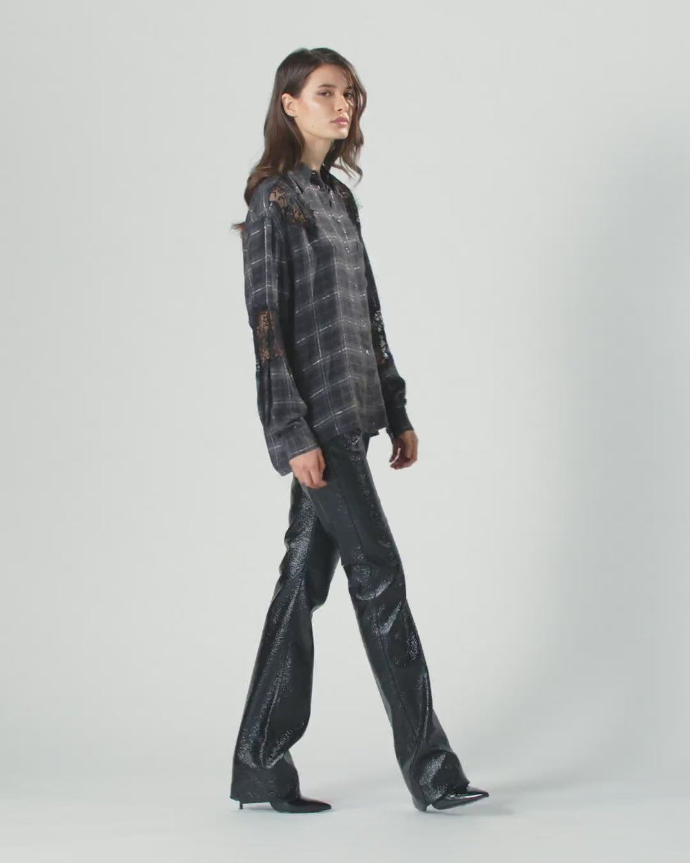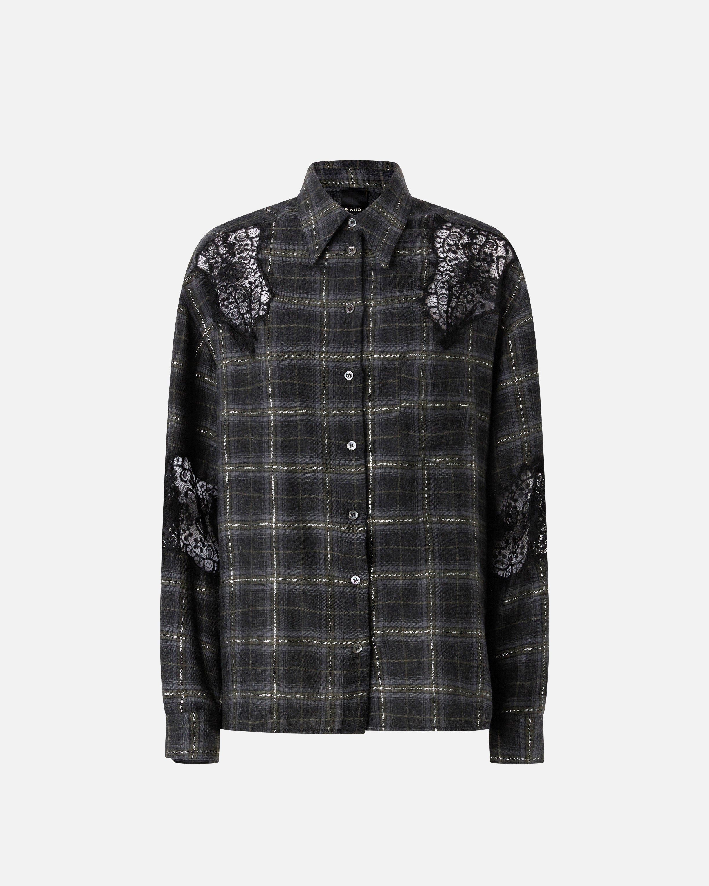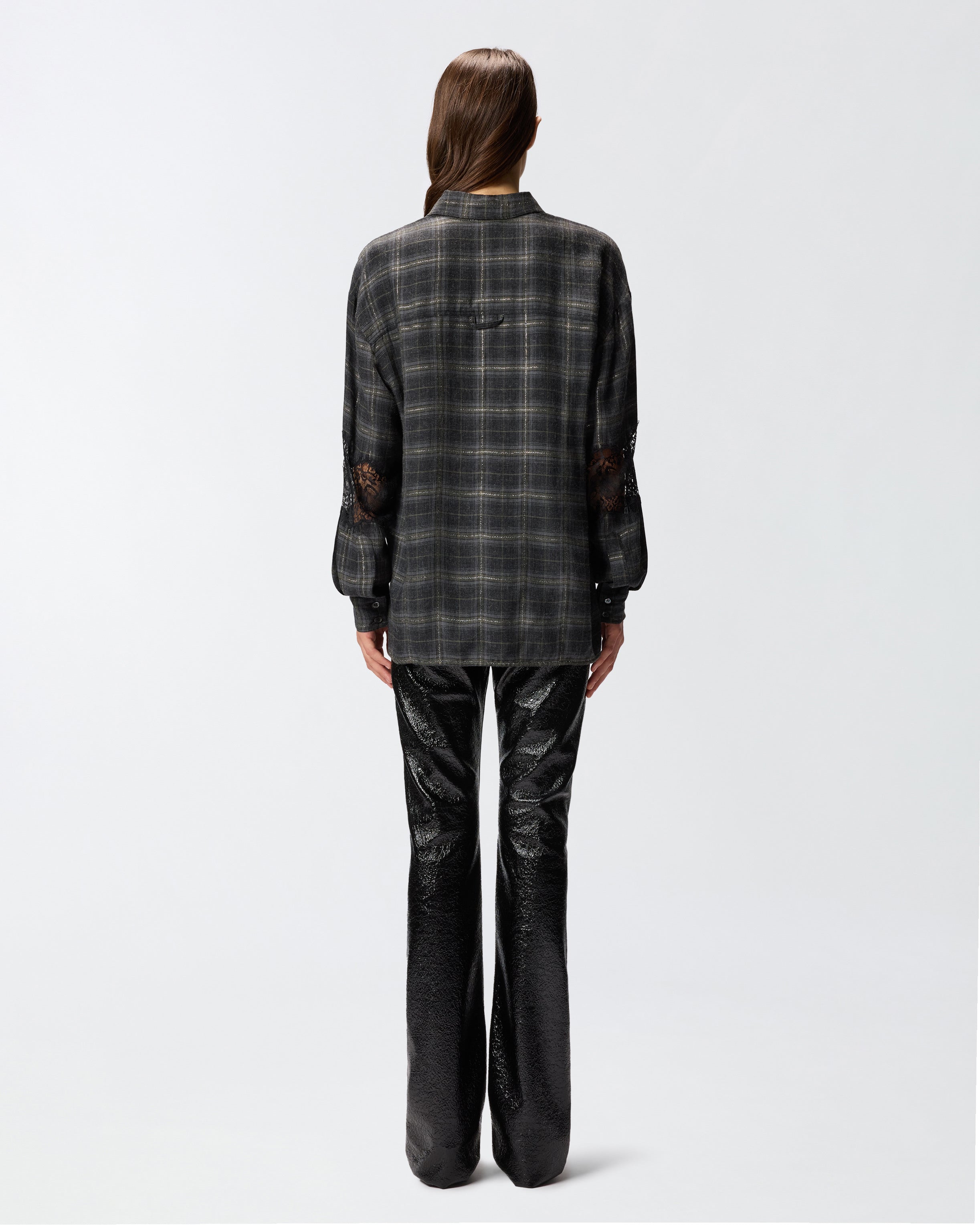 Bluse mit bequemer Passform aus einem Stoff mit warmer und umhüllender Haptik, der sich der Körperform anpasst. Auf dem Modell wechselt ein Karomuster mit Streifen aus Metallic-Garn und raffinierten Spitzeneinsätzen ab, die von Dessous inspiriert sind. Kombinieren Sie dieses fließende und vielseitige Modell mit einer bequemen Jeans für Ihre Off-Duty-Momente.