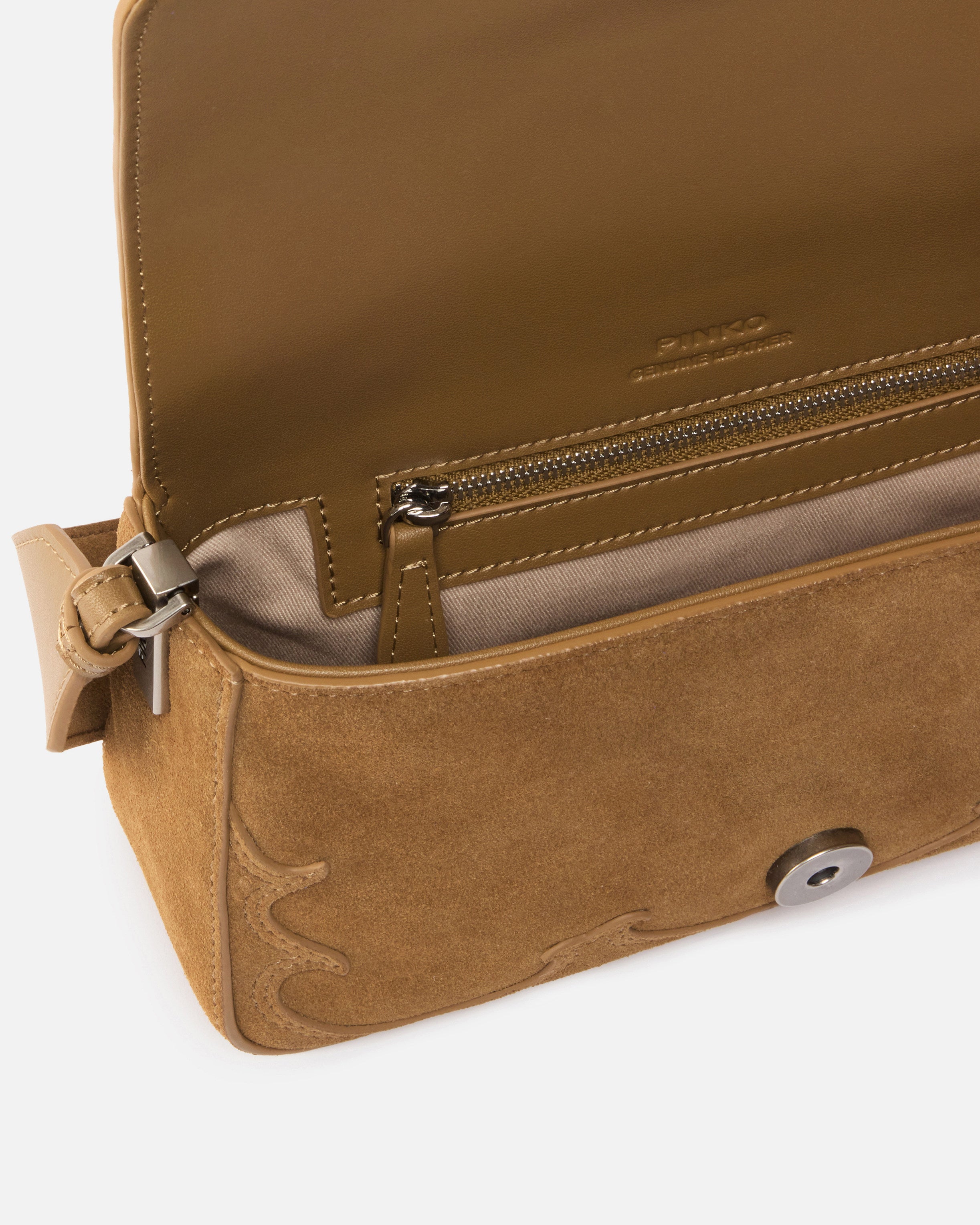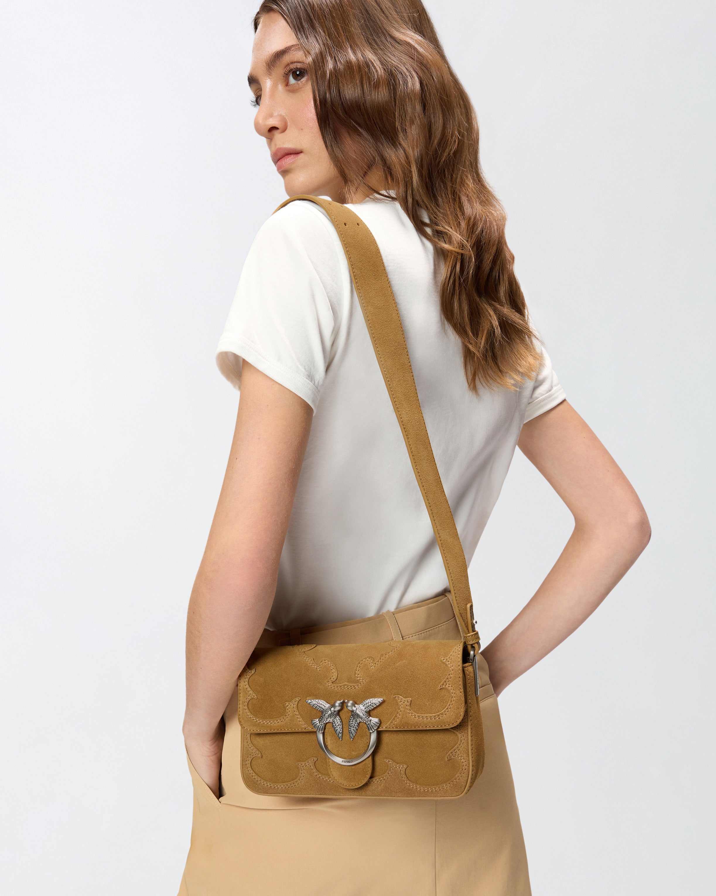 Kleine Schultertasche Mini Love Bag One Slouchy aus weichem Veloursleder mit eleganten Intarsien an Körper und Patte. Das äußerst raffinierte und gleichzeitig praktische Modell verfügt über einen breiteren, abnehmbaren Schulterriemen aus Veloursleder sowie über einen schmaleren, abnehmbaren Schulterriemen aus Leder, mit denen es über der Schulter oder als Umhängetasche getragen werden kann, und ist mit einem Verschluss ausgestattet, der durch eine zeitlose Schnalle mit dem Logo Love Birds Diamond Cut ergänzt wird. Das Innere der Tasche ist mit Baumwollgewebe gefüttert und hat ein Seitenfach mit Reißverschluss. Aktivieren Sie Ihre PINKO-Tasche: Halten Sie Ihr Smartphone an die Love-Birds-Stickerei auf der Rückseite der Tasche, um die Echtheit Ihres Produkts zu überprüfen und um ein personalisiertes Erlebnis zu genießen!