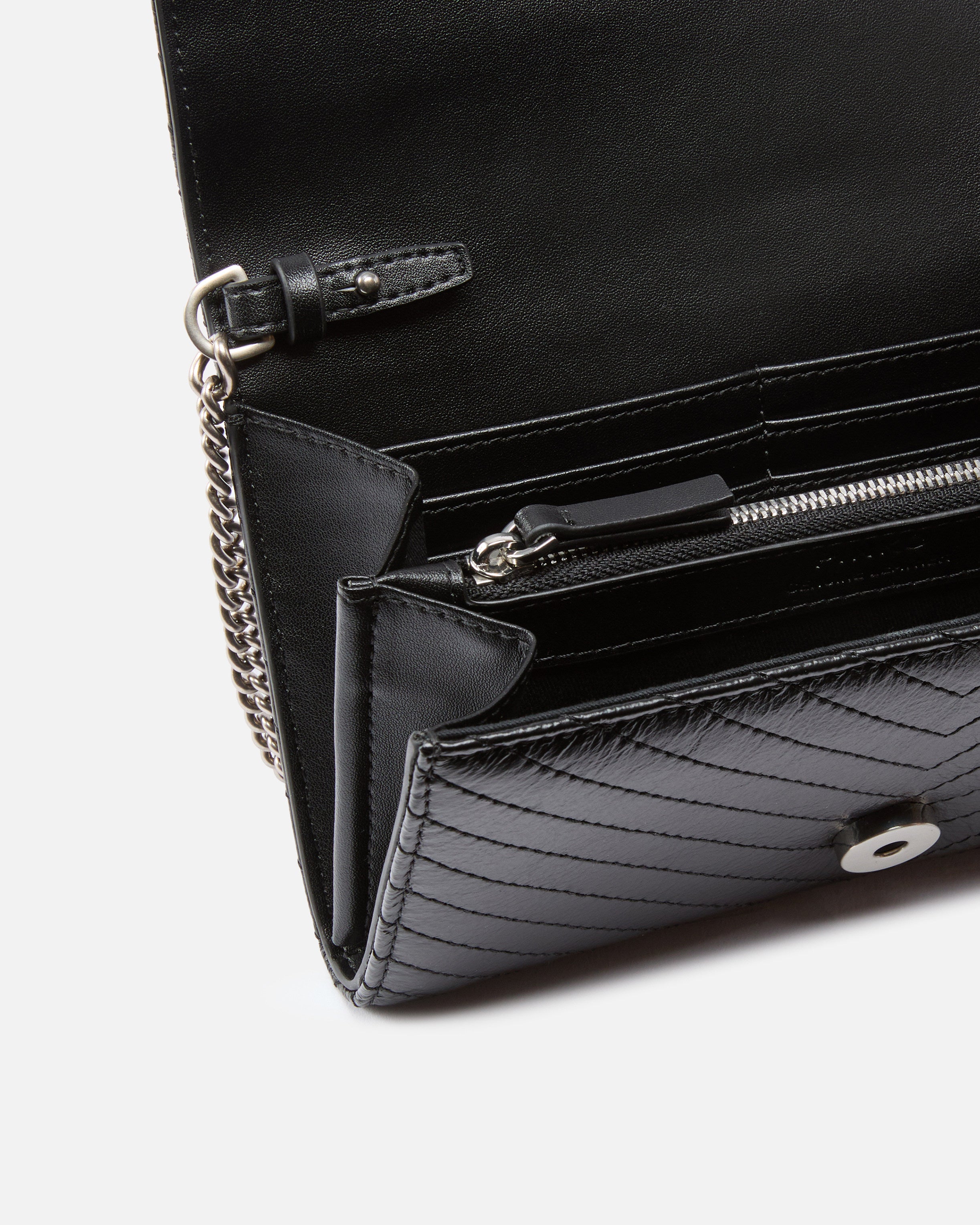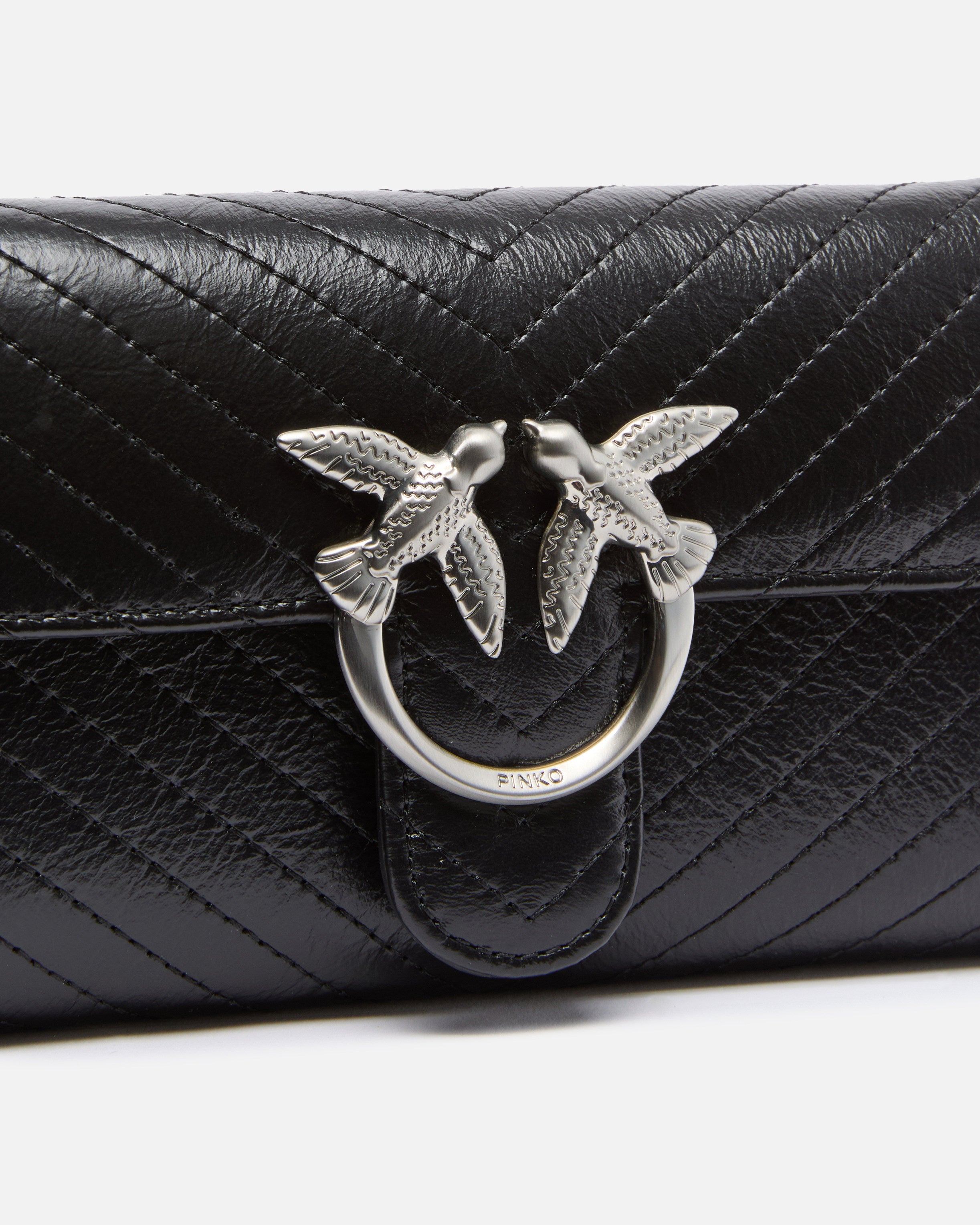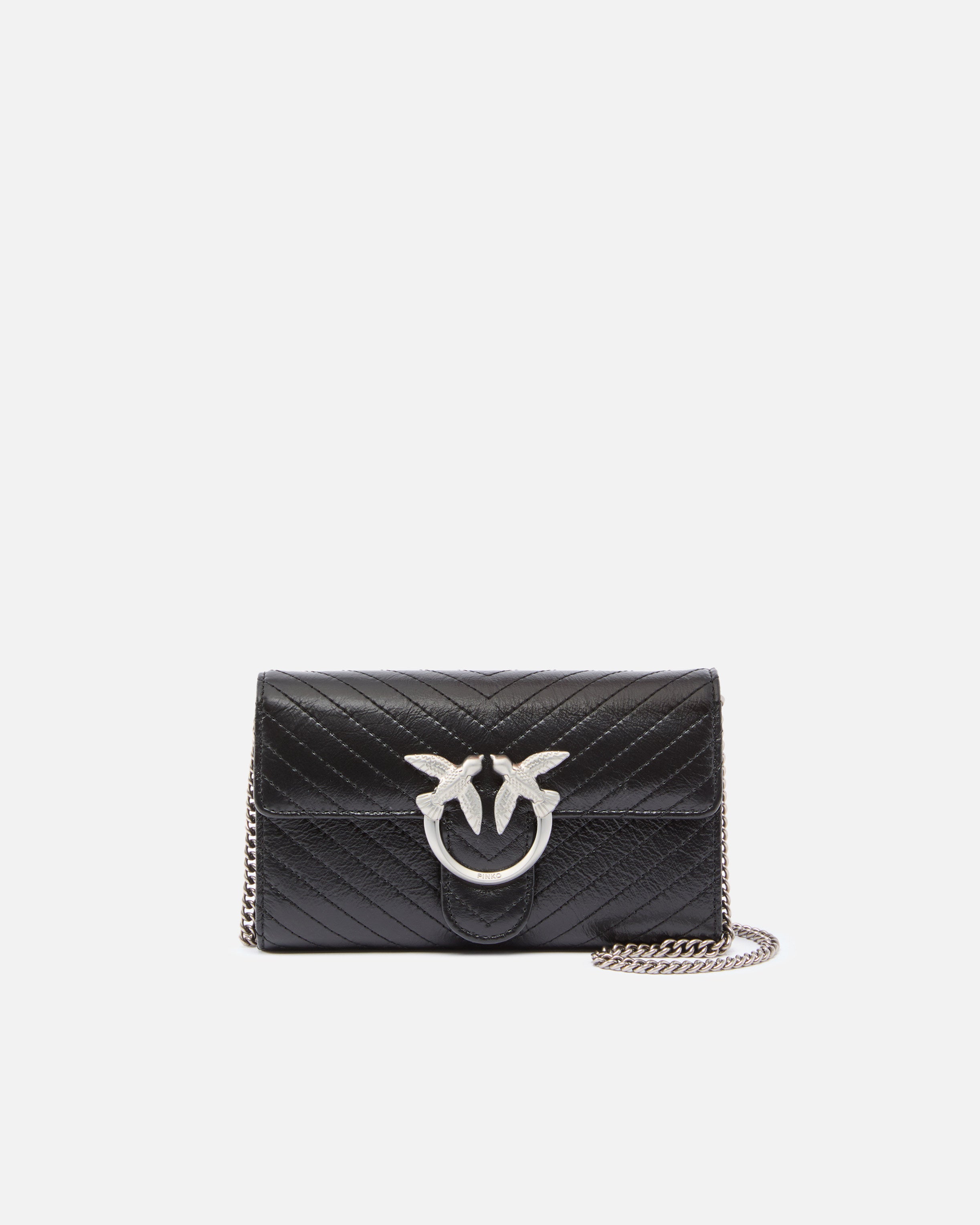 Kleine Umhängetasche Love Bag One aus Leder mit Nähten mit Matelassé-Effekt. Mit einem raffinierten, verstellbaren Schulterriemen in Form einer Kette ist das Modell äußerst vielseitig und praktisch. Die Schnalle mit Logo Love Birds Diamond Cut aus Metall mit Galvanisierung in Mattsilber rundet den Verschluss im Stil von PINKO ab. Innenfutter aus Baumwolle mit Reißverschlusstasche zur sicheren Aufbewahrung Ihrer wichtigsten Utensilien. Aktivieren Sie Ihre PINKO-Tasche: Halten Sie Ihr Smartphone an die Love-Birds-Stickerei auf der Rückseite der Tasche, um die Echtheit Ihres Produkts zu überprüfen und um ein personalisiertes Erlebnis zu genießen!