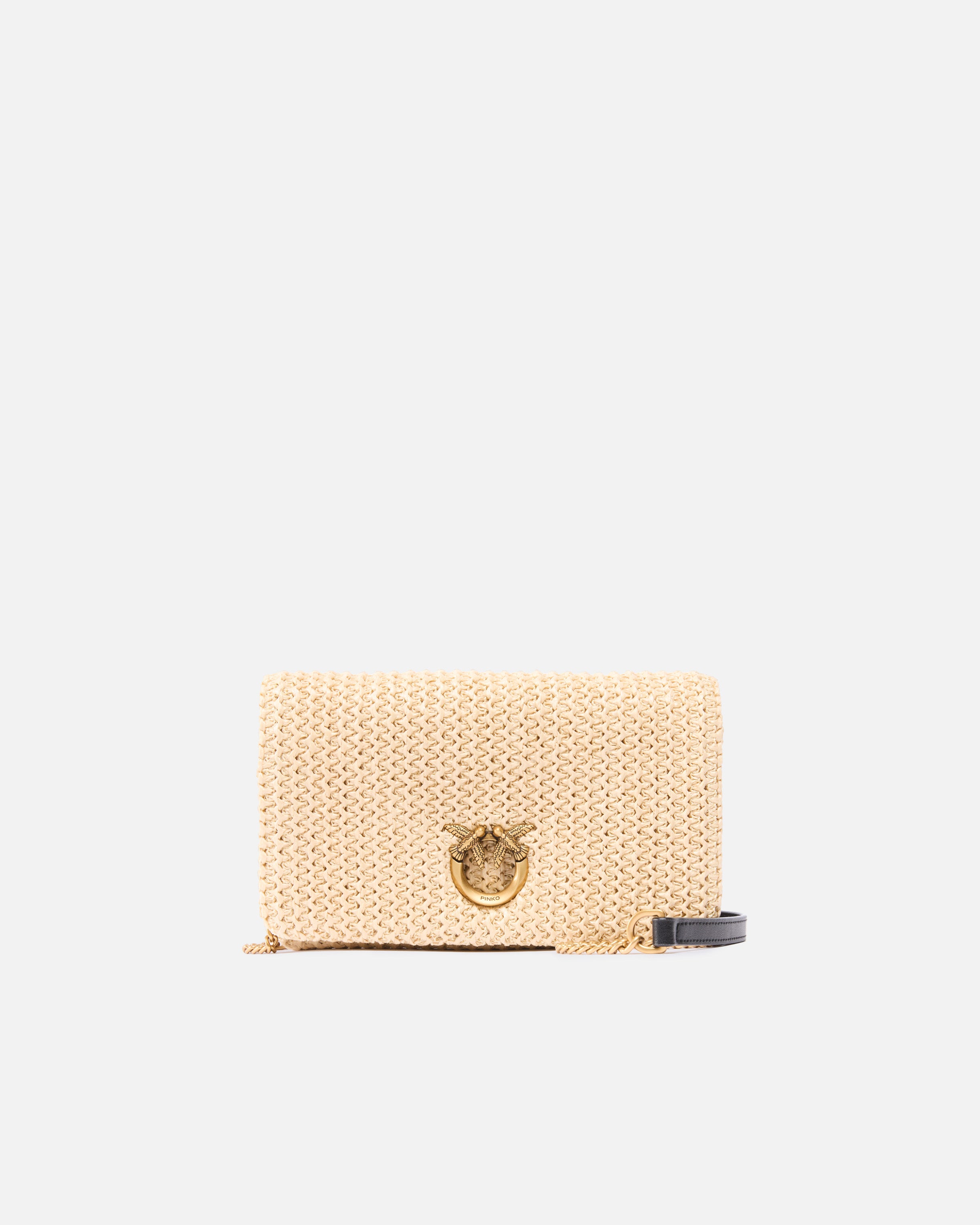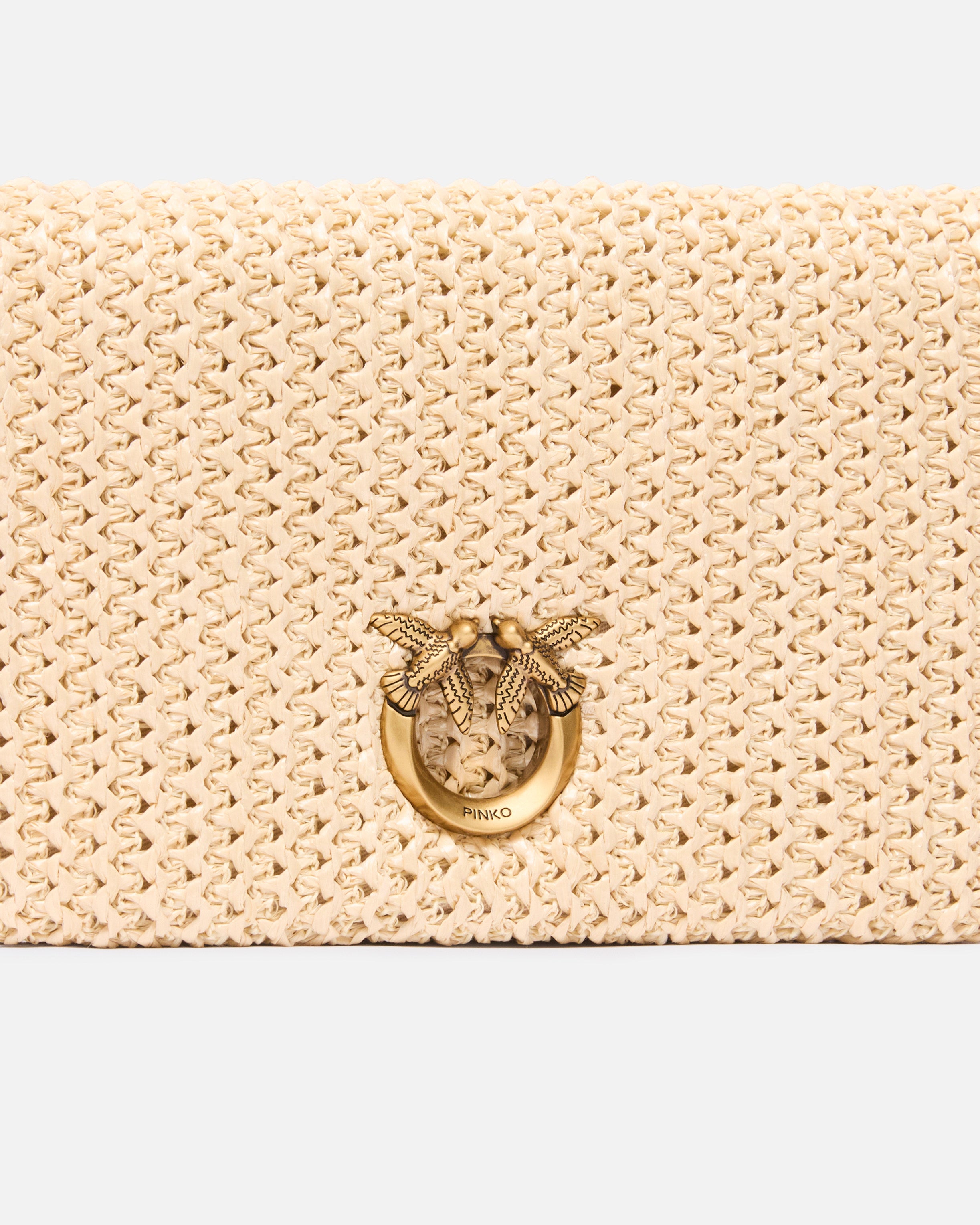 Kleine Tasche Love Bag Click Soft Horizontal Mini mit flachem Design und rechteckiger Form aus geflochtenem Bast. Die Handtasche, die mit dem ikonischen Logo Love Birds Diamond Cut aus Metall auf der Vorderseite personalisiert ist, kann dank des verstellbaren und abnehmbaren Riemens in Form einer Kette mit kontrastierendem Schulterpolster aus Leder über der Schulter, quer über den Körper oder in der Hand getragen werden. Der Verschluss mit zwei Magnetknöpfen innen zeigt ein Innenfutter aus Baumwolldrill mit einem Seitenfach mit Reißverschluss und einem Logo-Etikett. Aktivieren Sie Ihre PINKO-Tasche: Halten Sie Ihr Smartphone an die Love-Birds-Stickerei auf der Rückseite der Tasche, um die Echtheit Ihres Produkts zu überprüfen und um ein personalisiertes Erlebnis zu genießen!