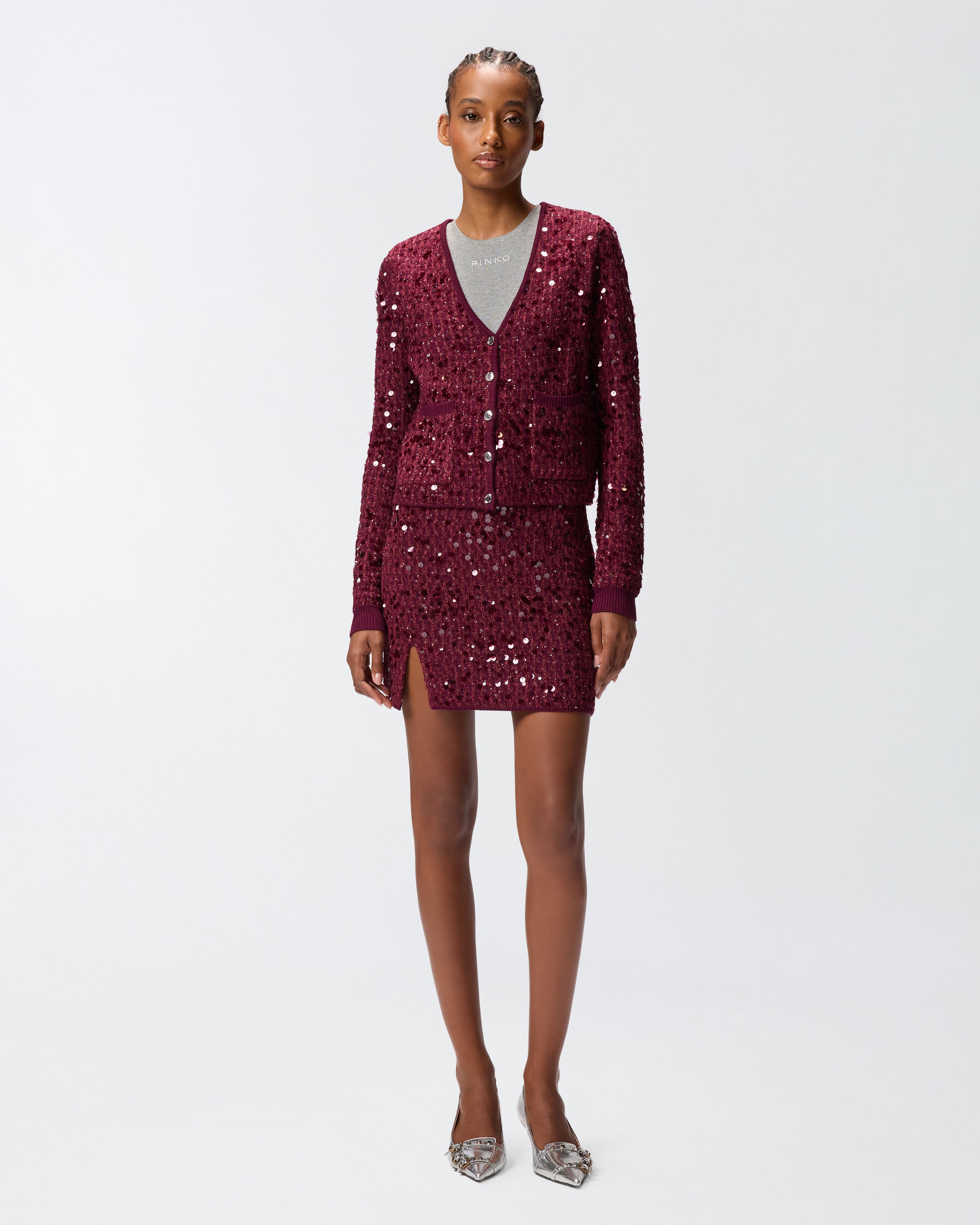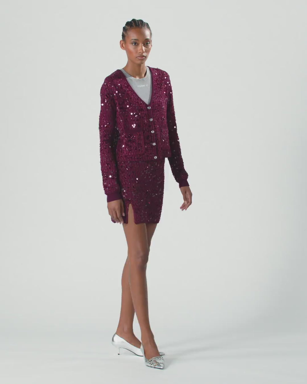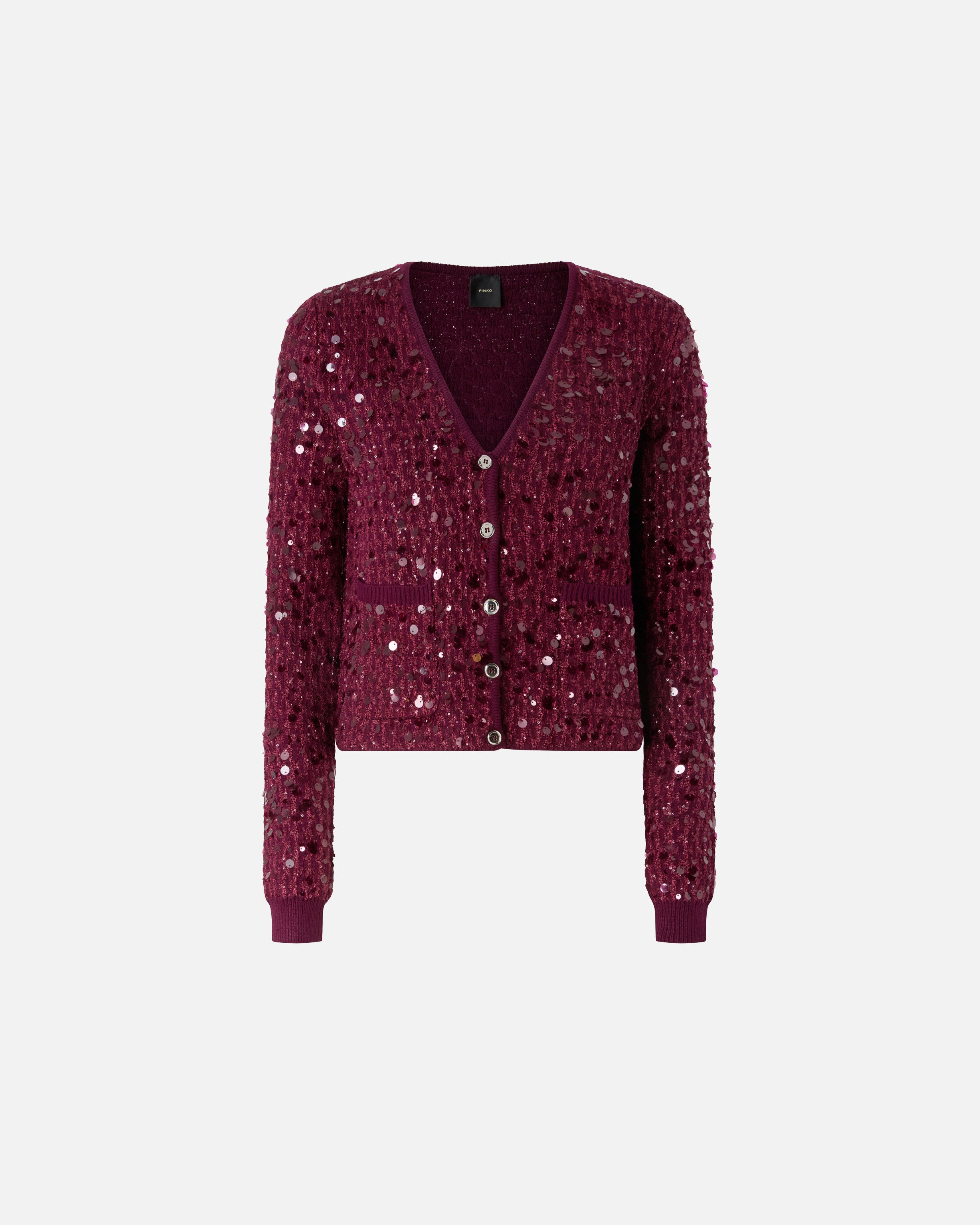 Cardigan mit V-Ausschnitt und Knopfleiste vorne aus Viskose, die für einen kompakten und gleichzeitig weichen Effekt sorgt. Die unzähligen Pailletten, wahre Hauptdarsteller des Modells, bedecken die gesamte Silhouette: Das Endergebnis ist ein funkelnder, femininer und praktischer Look. Das Kleidungsstück wurde Veredelungsprüfungen unterzogen, um die mögliche Bildung von Pilling zu minimieren und ein weicheres und haltbareres Gewebe zu gewährleisten.