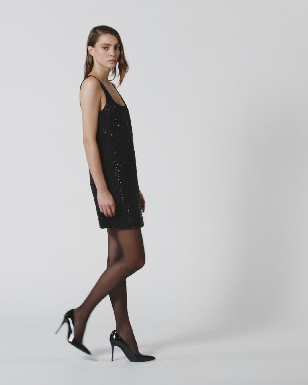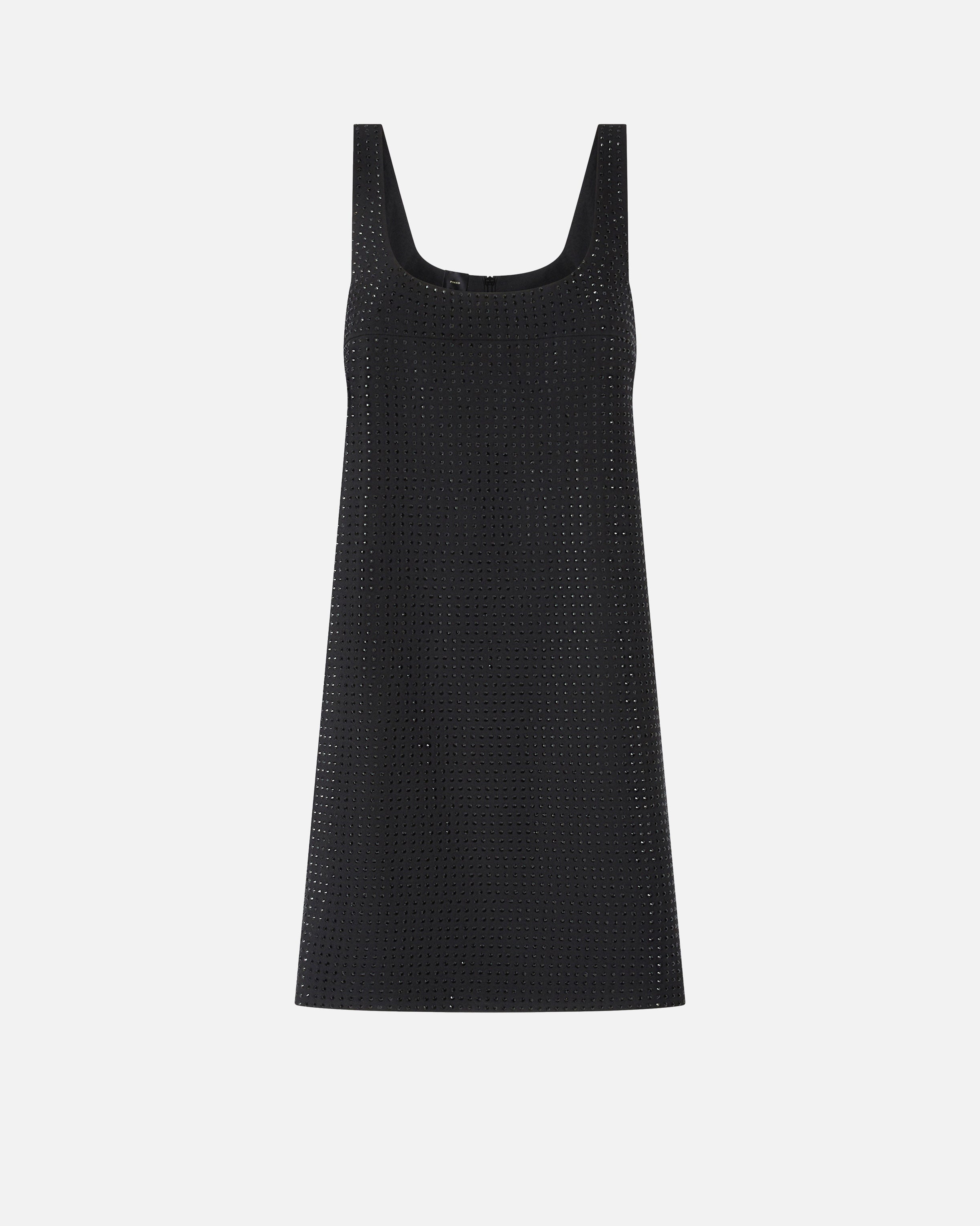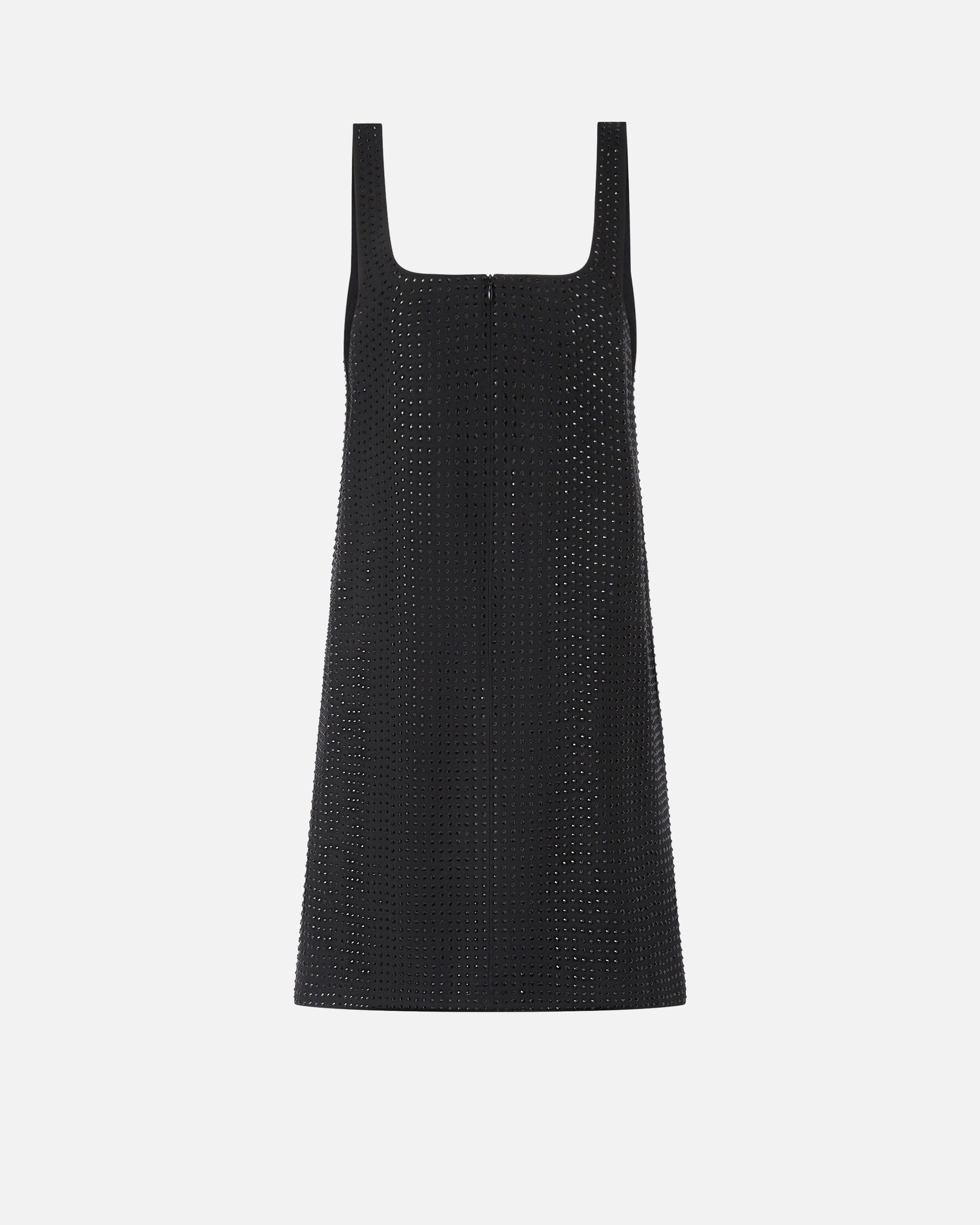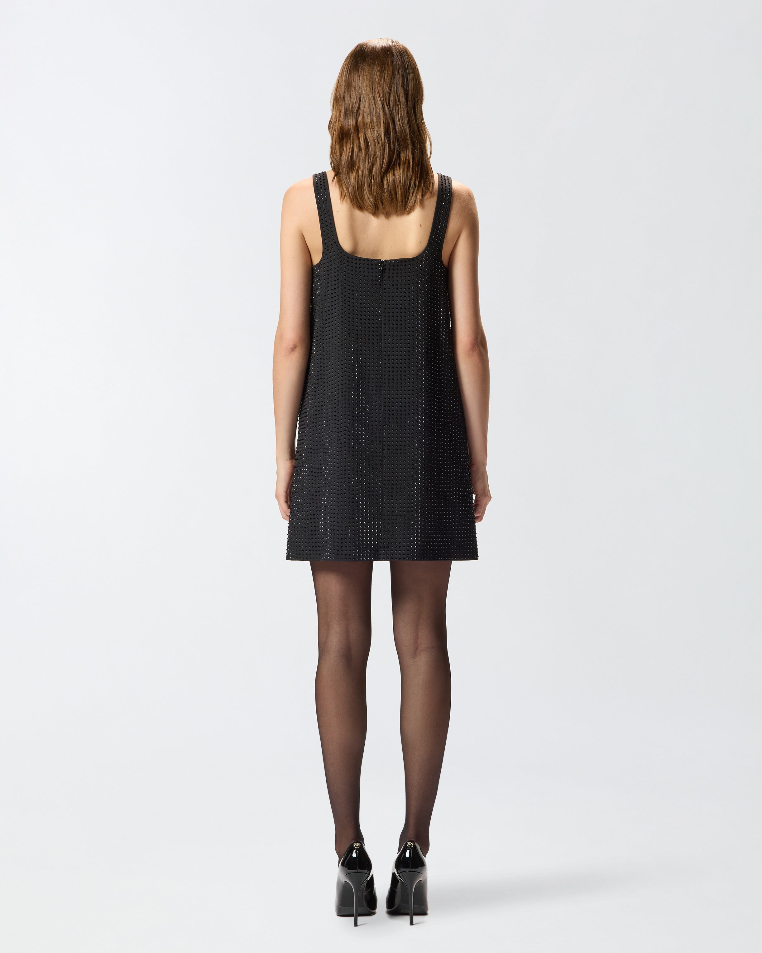 Leicht ausgestelltes, kurzes Kleid mit Trägern, quadratischem Ausschnitt und Reißverschluss auf der Rückseite. Die unzähligen farblich abgestimmten Strasssteine, die die wahren Protagonisten des Looks sind, bedecken die gesamte Silhouette und verleihen dem Kleid eine schillernde Note. Dieses originelle Modell wird Ihre Abende und Ihre Outfits mit Sicherheit aufhellen.