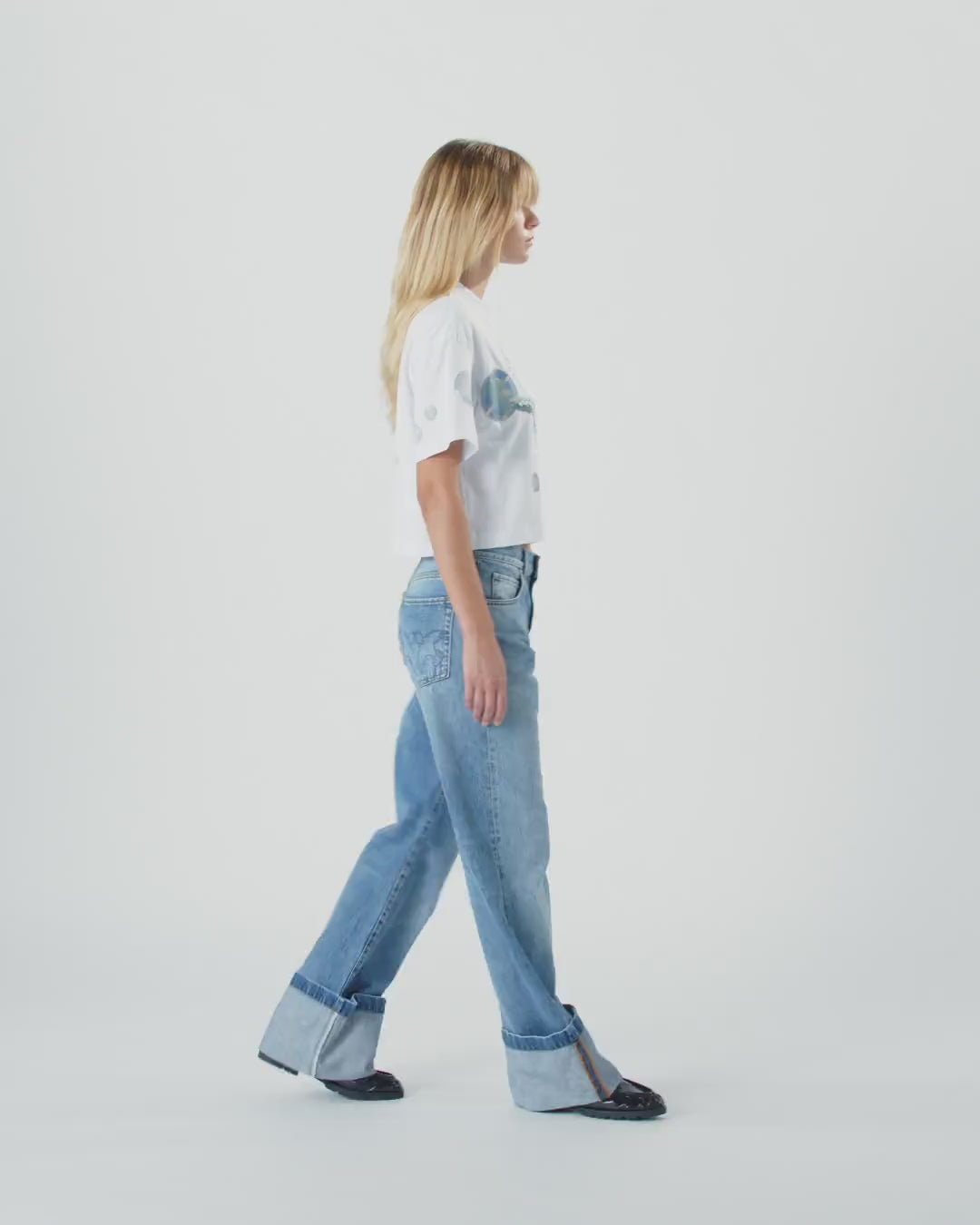 Cropped-T-Shirt mit halblangen Ärmeln aus Jersey in reiner Baumwolle. Das Modell ist mit einem Print auf der Vorder- und Rückseite mit einem maritimen Thema versehen, auf dem ein Seestern mit Pailletten und von Hand applizierten Perlen hervorsticht, und dem Design eine dreidimensionale Note verleiht. Der Blasen-Print setzt sich auch auf den Ärmeln und auf der Rückseite fort, wo das PINKO-Logo der Nähe des Halses auffällt.