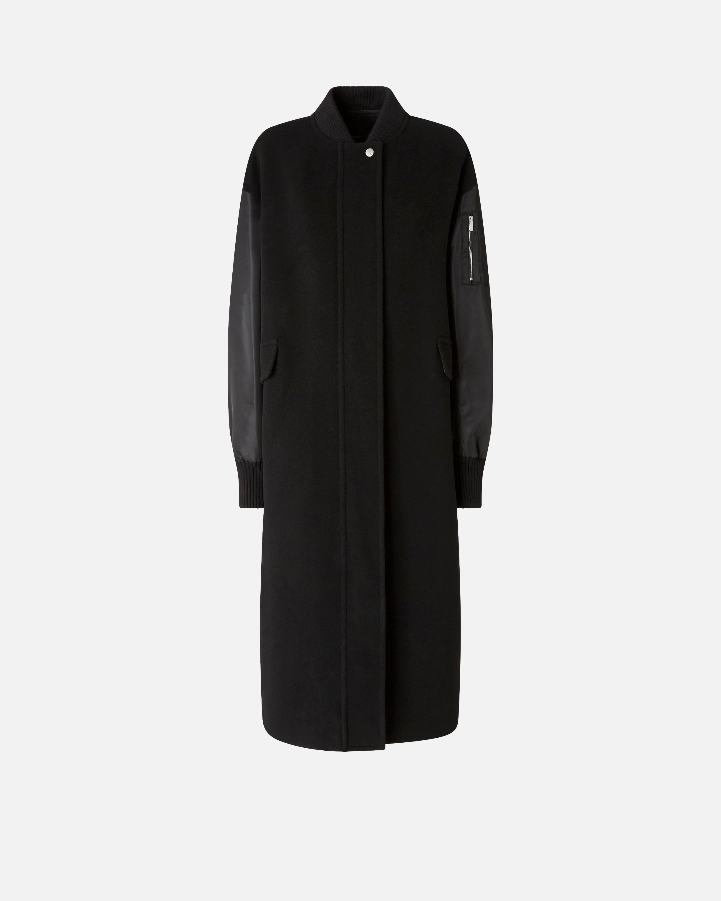 Langer Mantel mit Innenfutter, Bomberkragen, Pattentaschen und Reissverschlusstasche an einem Ärmel. Das Modell besteht aus warmem und weichem Tuch in einem Wollmix mit langen Ärmeln aus technischem Satin. Rippstrick an Kragen und Ärmelbündchen. Verdeckte Knopfleiste, von der nur der obere Knopf sichtbar ist. Diese Oberbekleidung ist ideal, um Sie an kühleren Frühlingstagen zu begleiten, mit maximalem Komfort und ohne auf einen stilvollen Akzent zu verzichten.