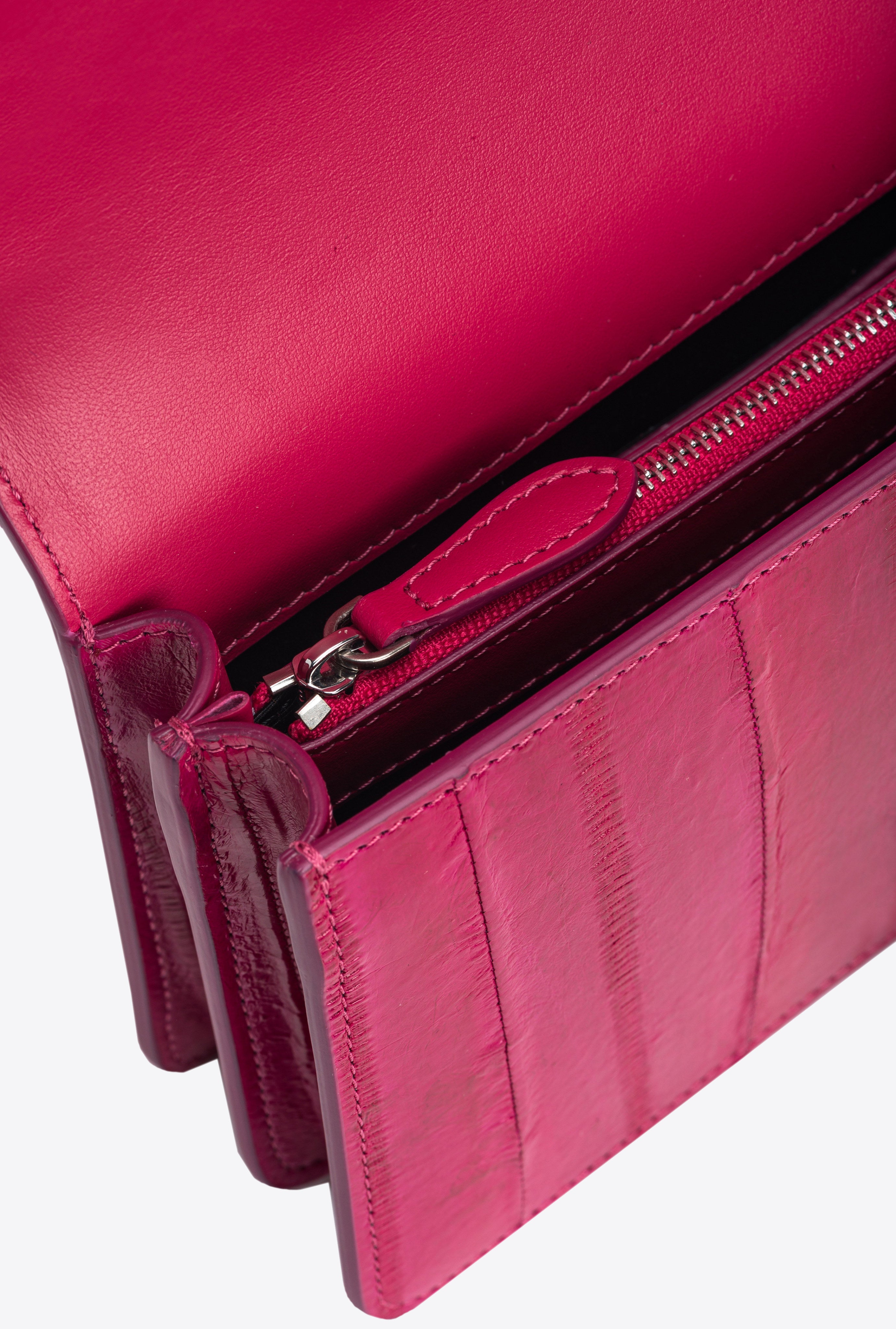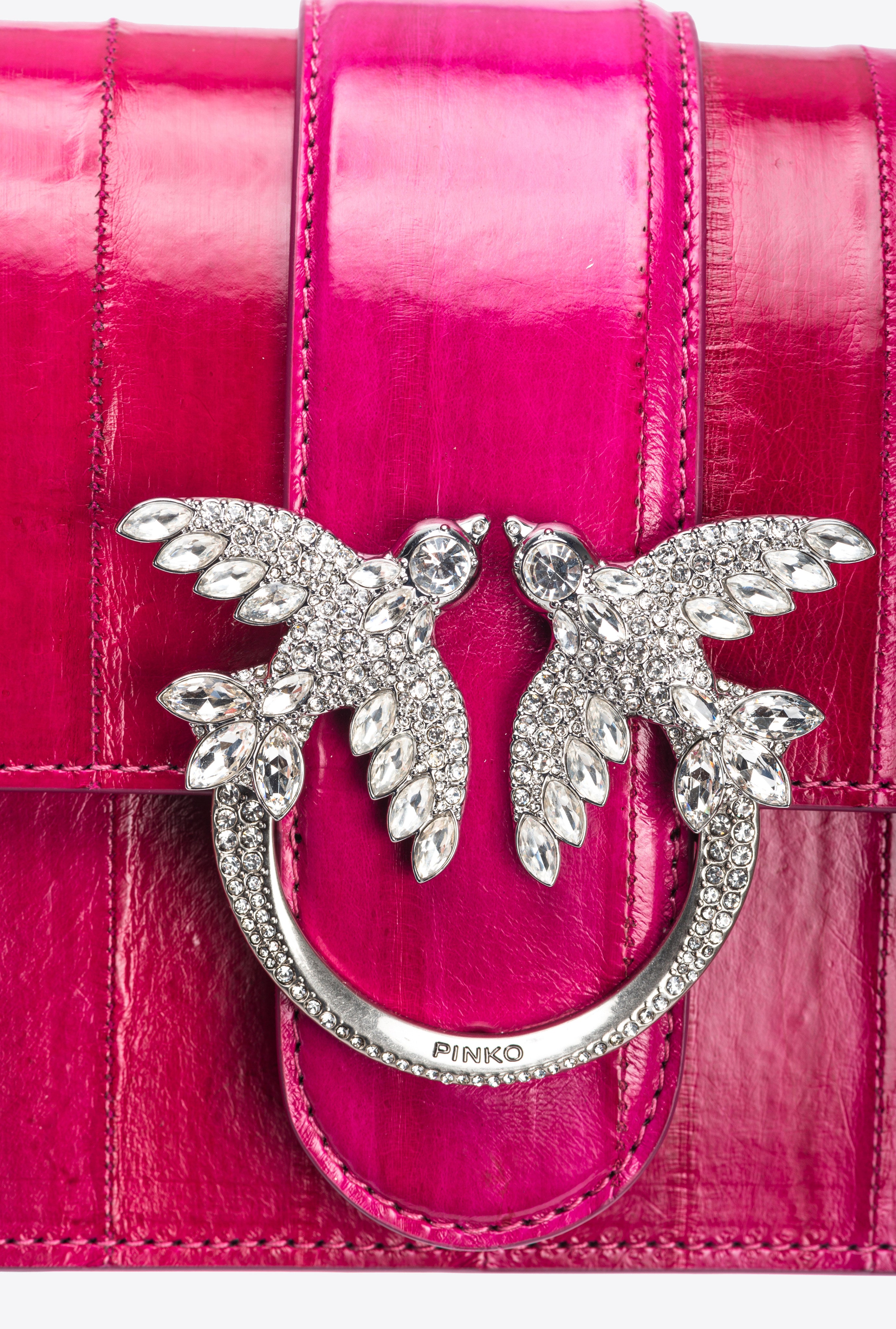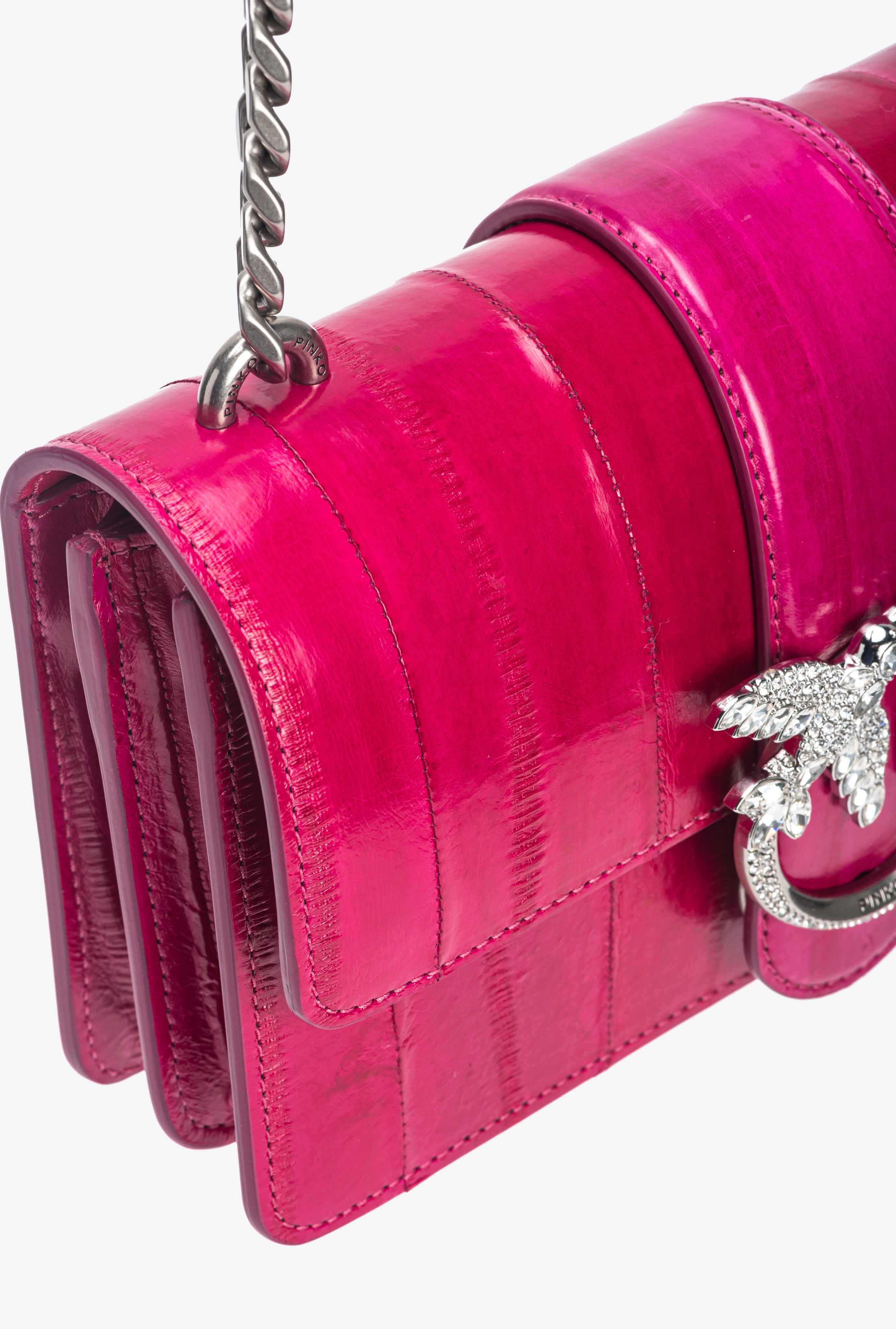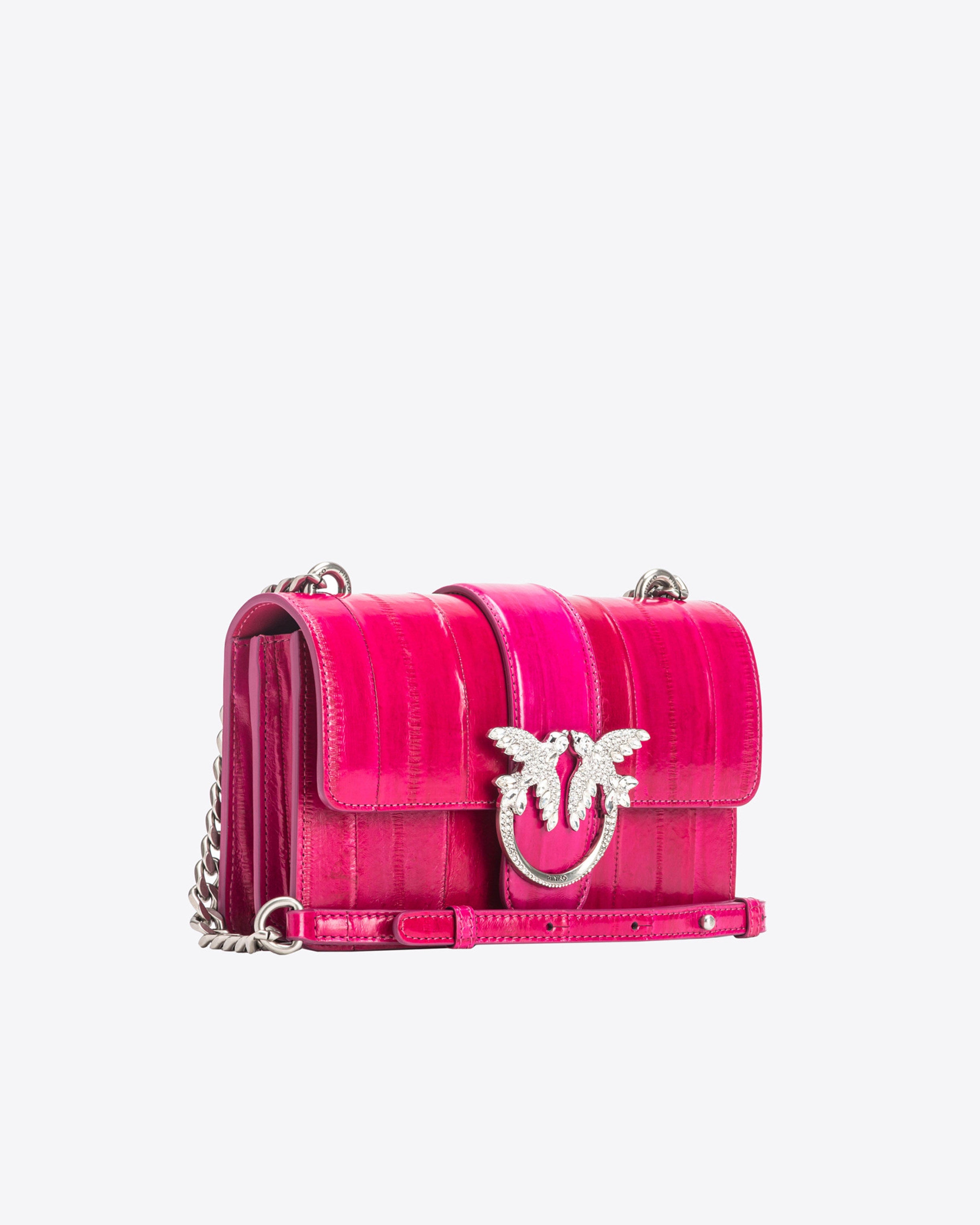 Mini Love Bag One aus Schleimaal-Leder, das sich durch eine besonders dezente, aber gleichzeitig robuste und feine Textur auszeichnet. Die kleinen Häute werden nebeneinander zusammengenäht, um größere Stücke zu erhalten, aus denen anschließend die gewünschten Schnitte gewonnen werden. Flecken, Narben und Farbunterschiede zwischen den verschiedenen Häuten sind daher als ein charakteristisches Merkmal zu betrachten, das jede Tasche einzigartig macht. Der Verschluss mit Lasche wird durch die unverkennbare Metallschließe Love Birds Diamond Cut mit galvanischer Beschichtung in Antiksilber abgerundet, die mit einem Pavé aus weißen Steinen verziert ist. Das Innere ist mit Stoff gefüttert und mit einem Seitenfach und einer Trennwand mit Reißverschluss ausgestattet. Der Schulterriemen ist eine Kombination aus der klassischen Kette mit runden Gliedern und einem praktischen verstellbaren Tragegurt aus Leder. Die Tasche ist Teil der exklusiven Kapselkollektion Limited Edition in limitierter Stückzahl, die speziell für PINKO Galleria entworfen wurde. Der NFC-Spezialchip macht die Tasche zu einem exklusiven Einkaufserlebnis!