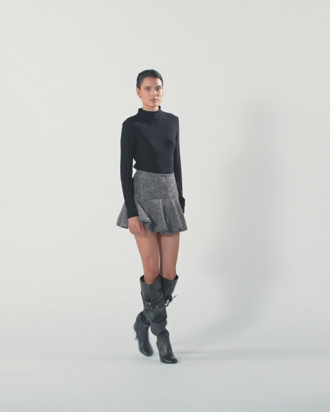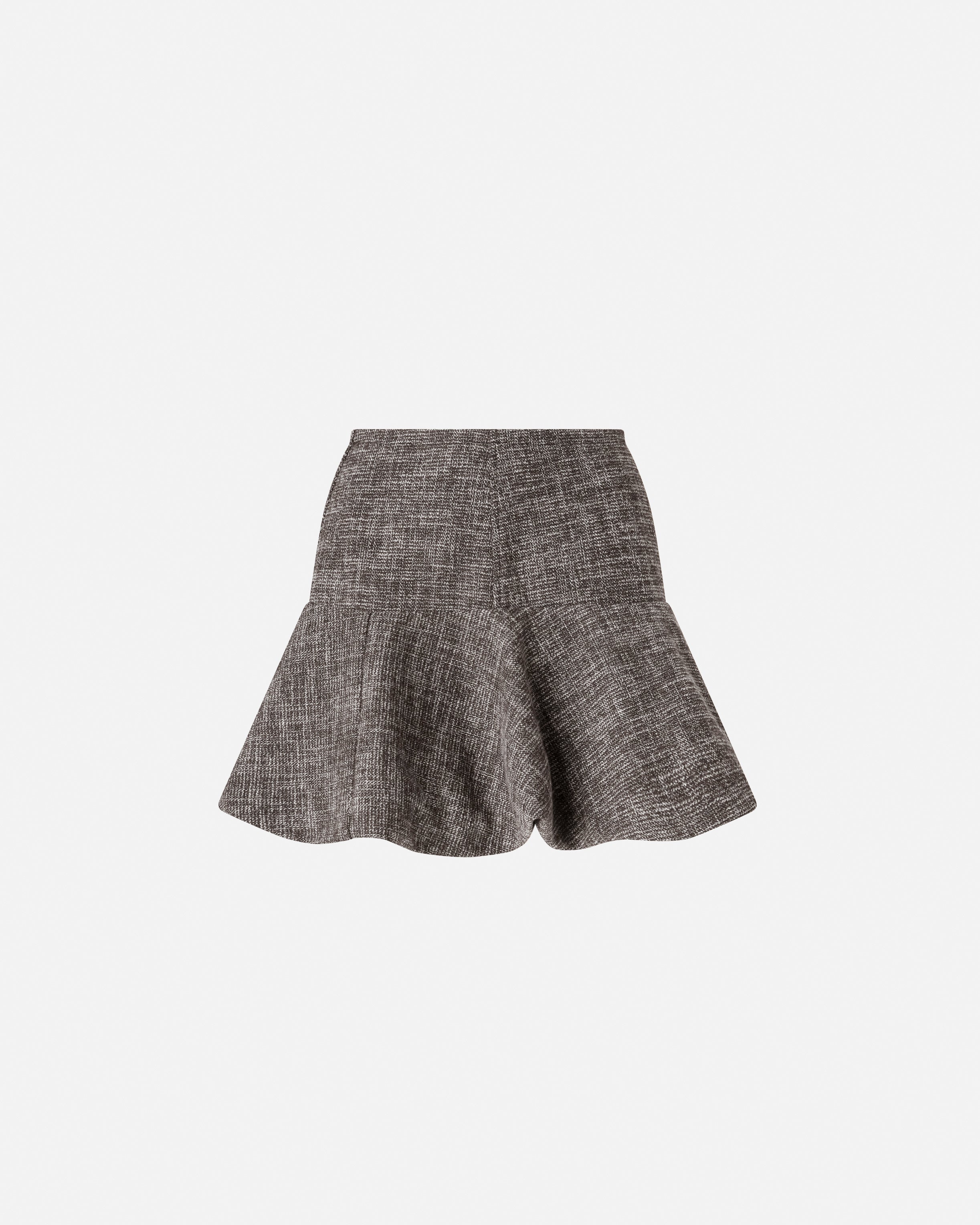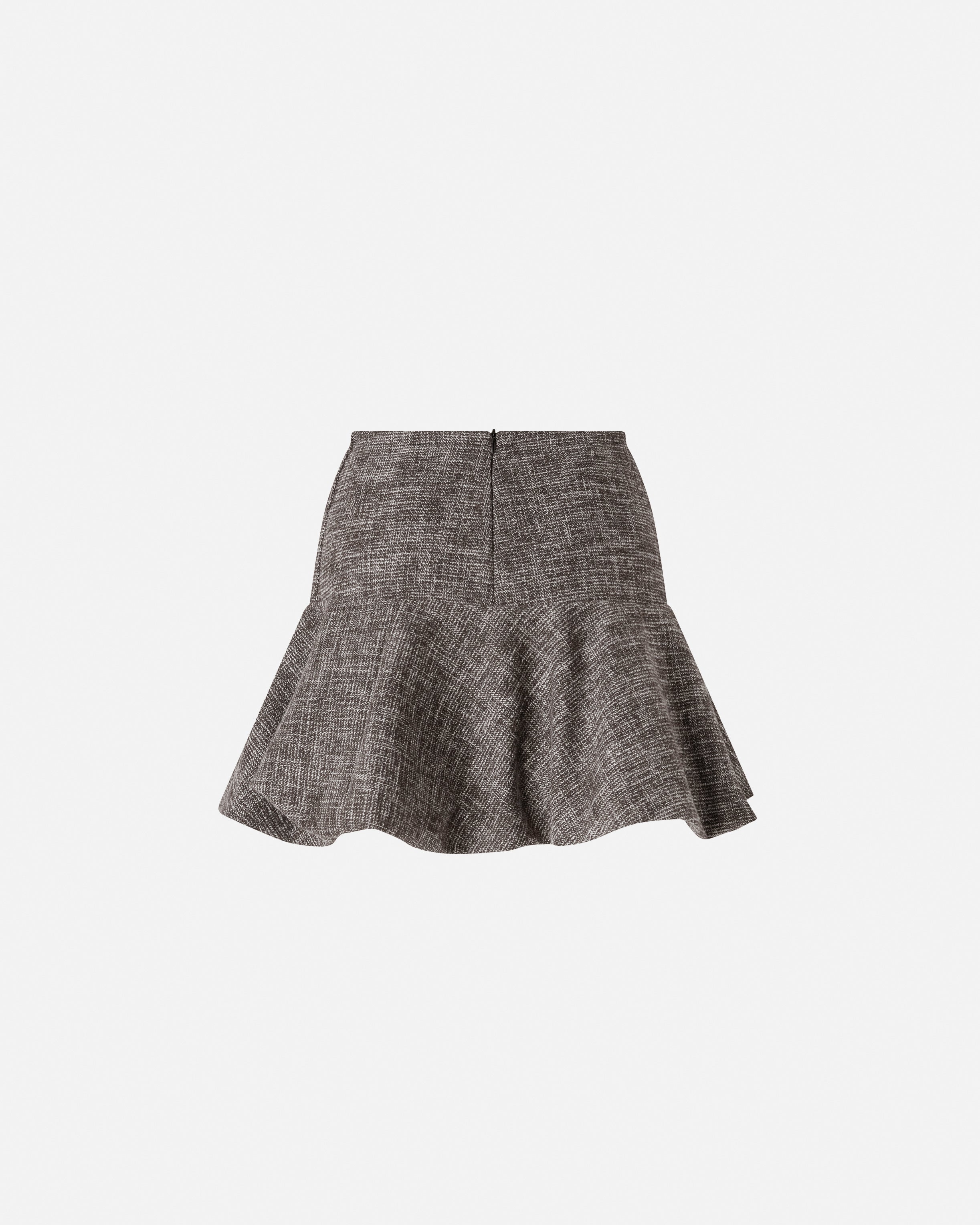 Leicht ausgestellter kurzer Rock mit Volant am Saum. Das Kleidungsstück besteht aus Flanell mit einem angenehmen und warmen Griff, der sich durch ein klassisch inspiriertes Tweed-Design auszeichnet und mit einem Innenfutter aus Jersey gedoppelt wird, um zusätzlichen Komfort zu gewährleisten. Verdeckter Reißverschluss auf der Rückseite. Perfekt in Kombination mit der passenden Jacke für einen femininen Look.