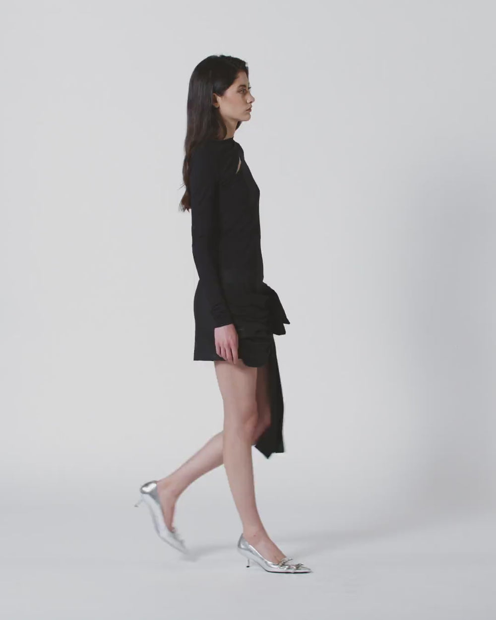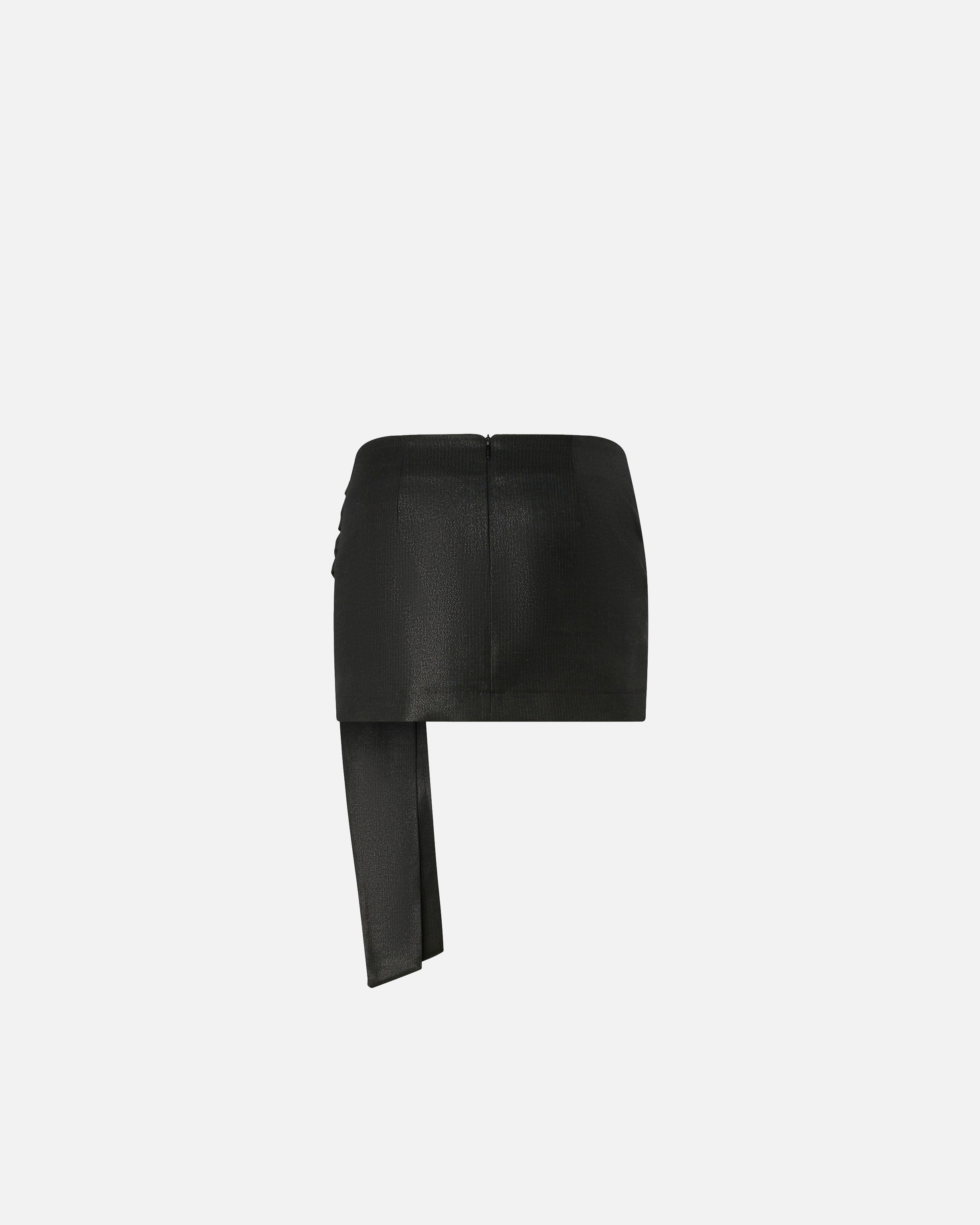 Minirock aus klassisch inspiriertem Tuch in einem Wollmix mit feinem Metallic-Faden, der je nach Licht einen sehr zarten und leicht schillernden Nadelstreifen-Effekt erzeugt. Das Design, das mit einem zentralen Reißverschluss auf der Rückseite ausgestattet ist, wurde auf der Vorderseite drapiert, aber das schönste Detail ist zweifellos das Zierband mit Schleife, die auf eine Seite fällt. Tragen Sie diesen Rock mit der passenden Jacke für einen glamourösen Total Look, mit dem Sie nicht unbemerkt bleiben werden.