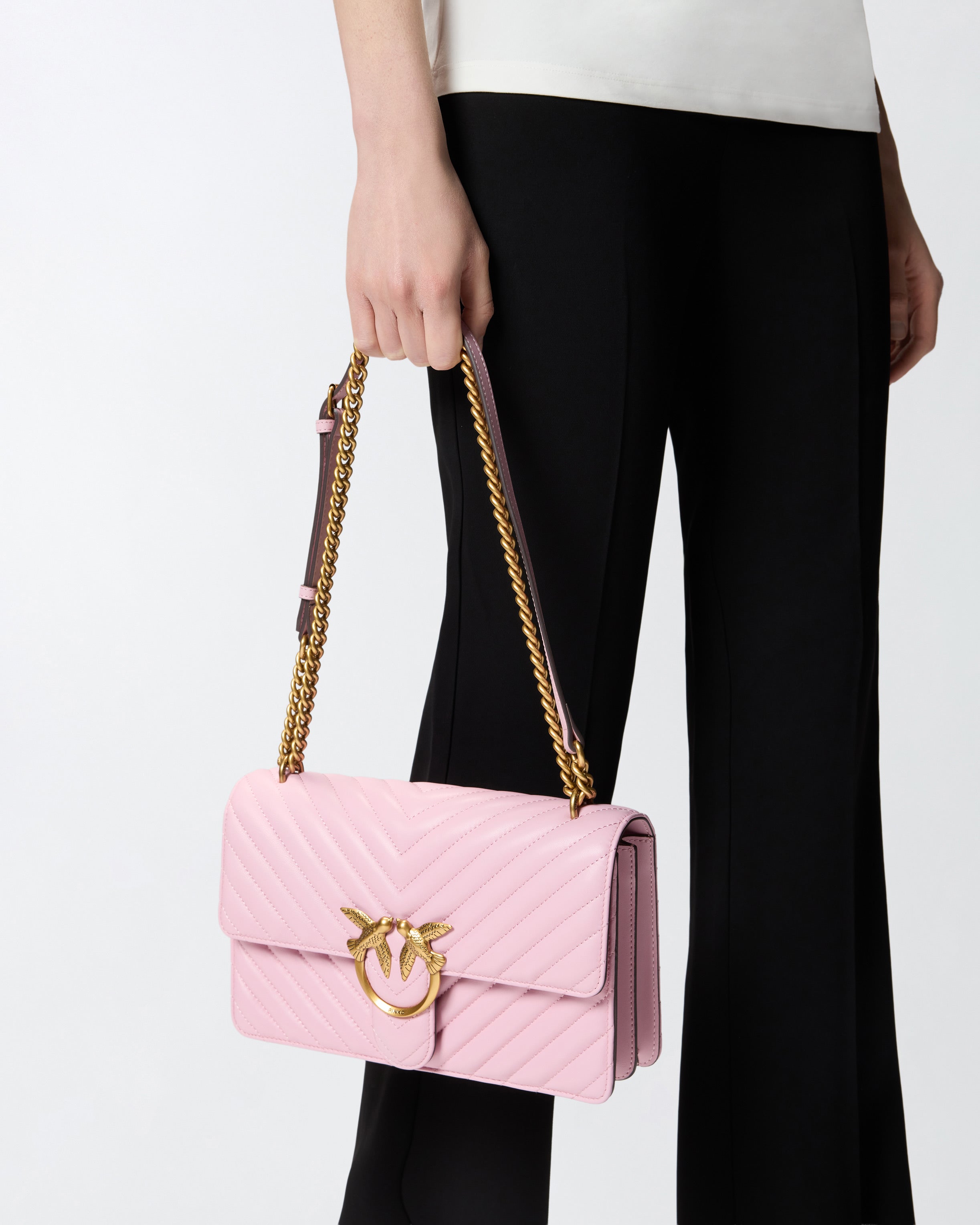 Classic Love Bag One aus gestepptem Nappaleder mit Fischgrätmuster. Der Verschluss wird durch die ikonische Schließe Love Birds Diamond Cut aus Metall abgerundet. Das Innere ist mit Velours-Mikrofaser gefüttert und mit Zwischenfach mit Reißverschluss und Seitenfach aus Leder ausgestattet. Der Schulterriemen ist eine Kombination aus einer klassischen Kette mit runden Gliedern und einem praktischen verstellbaren Tragegurt aus Leder. - LOVE ONE CLASSIC DC