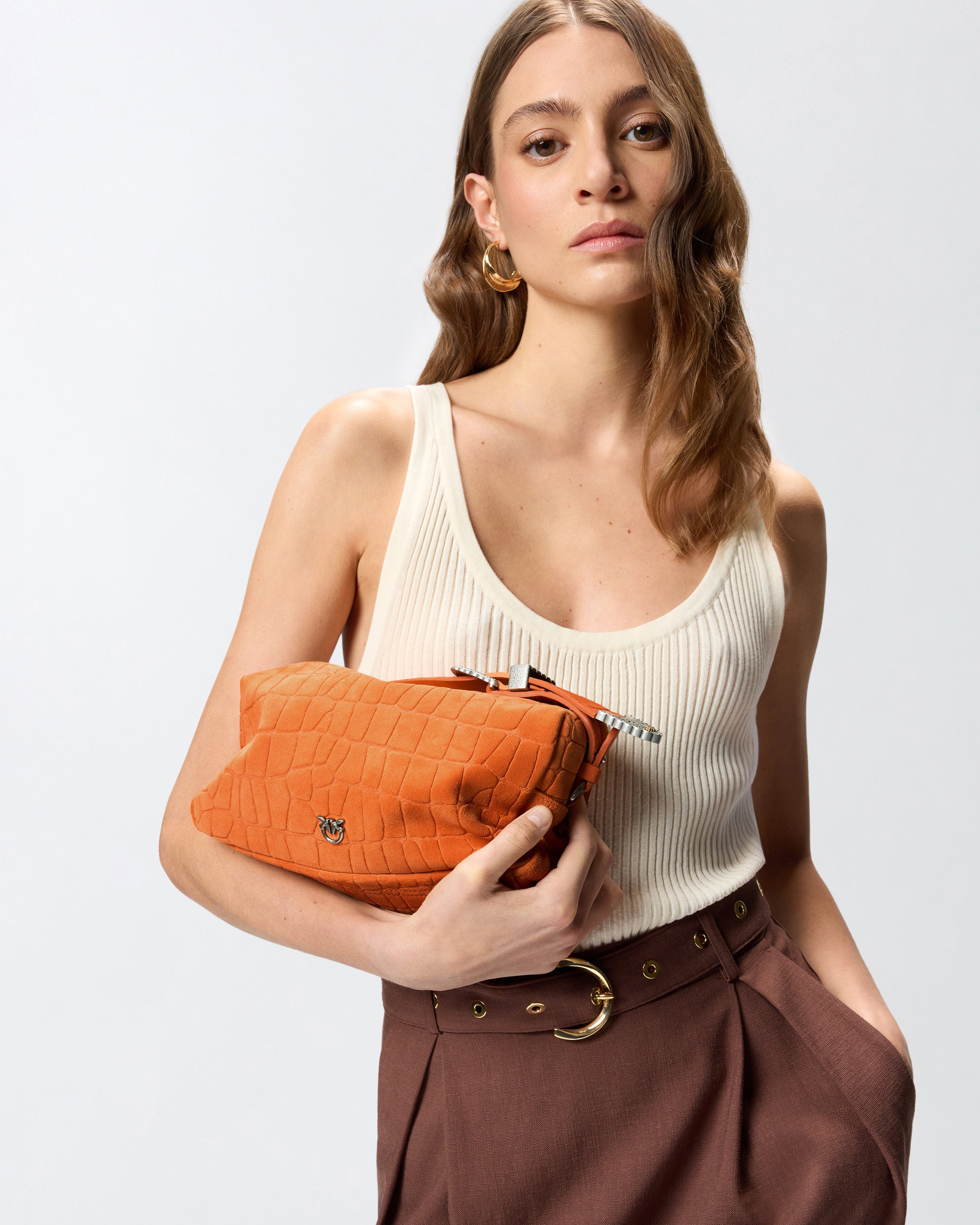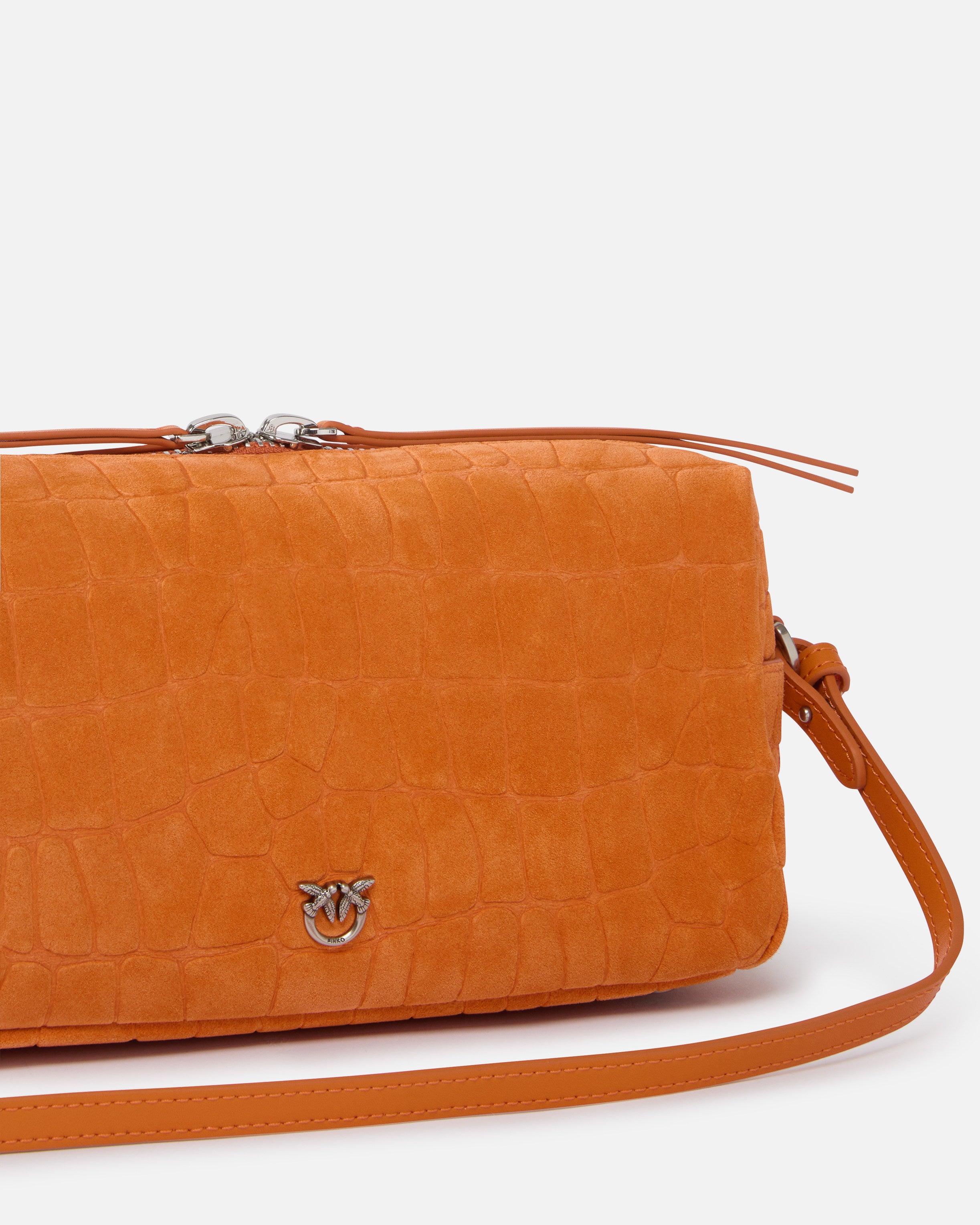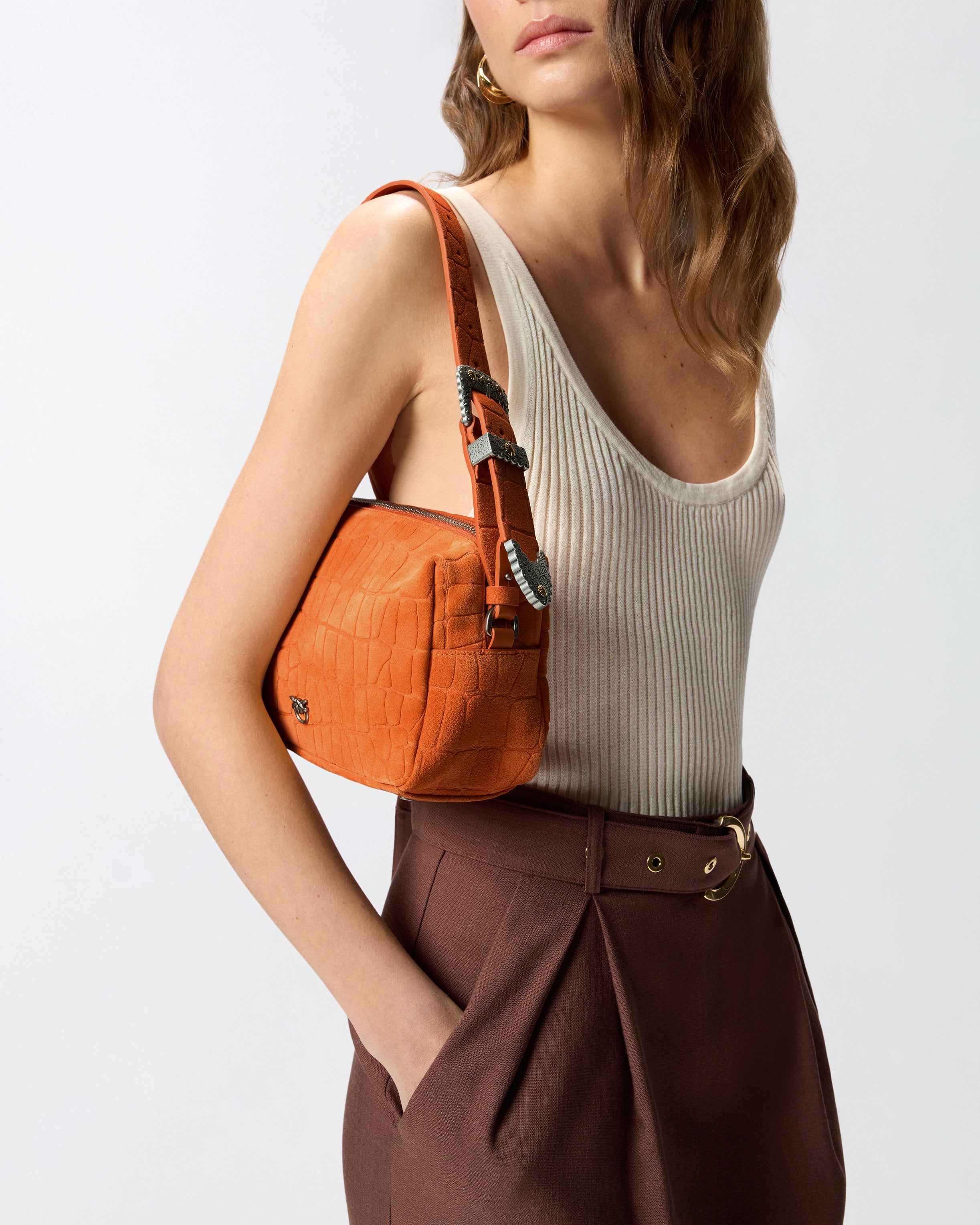 Mittlere Tasche mit charakteristischer rechteckiger Form im Bauletto-Stil aus weichem Nubukleder mit einem ansprechenden Allover-Krokoprint und personalisiert mit dem ikonischen Metalllogo Love Birds Diamond Cut auf der Vorderseite. Die Tasche kann über der Schulter, als Crossbody-Bag oder in der Hand getragen werden. Dies ist dem etwas längeren und abnehmbaren Schulterriemen aus Leder und dem etwas kürzeren, ebenfalls abnehmbaren Riemen aus bedrucktem Nubukleder zu verdanken, der an den Enden sowie an den Schnallen mit Metallschlaufen mit einer sorgfältig gestalteten Verarbeitung im Western-Style verziert ist. Der Reißverschluss mit doppeltem Schiebergriff zeigt ein Innenfutter aus Baumwolldrill mit Seitenfach samt Reißverschluss und Logo-Etikett. Aktivieren Sie Ihre PINKO-Tasche: Halten Sie Ihr Smartphone an die Love-Birds-Stickerei auf der Rückseite der Tasche, um die Echtheit Ihres Produkts zu überprüfen und um ein personalisiertes Erlebnis zu genießen!