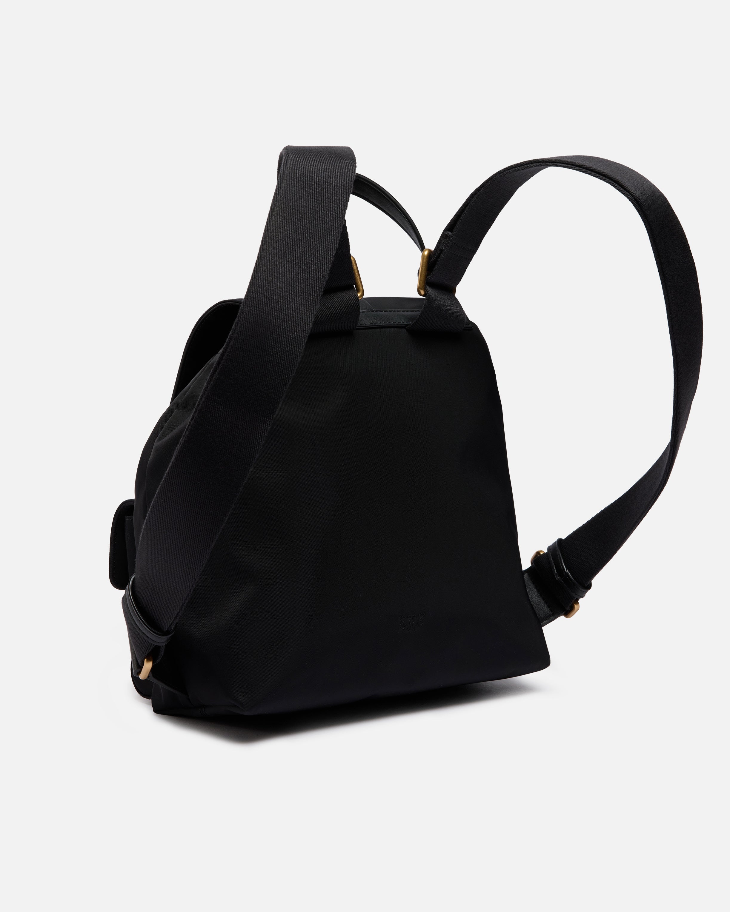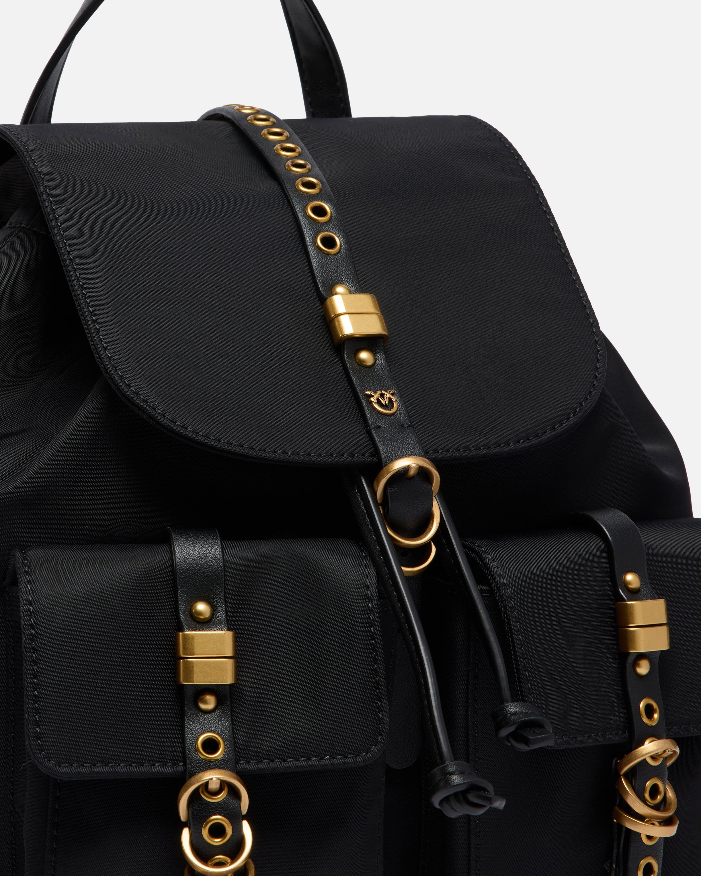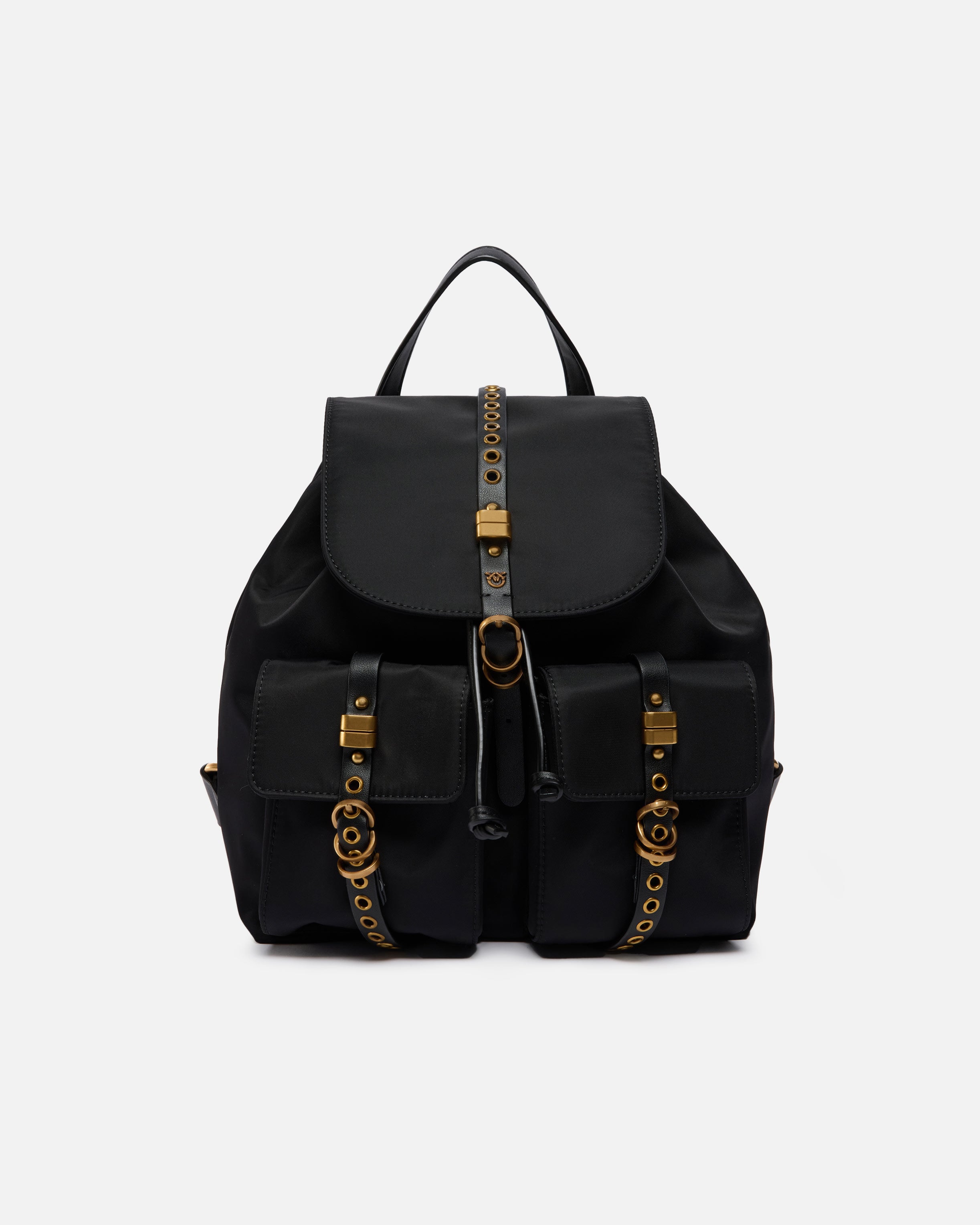 Mittelgroßer Rucksack mit weichem und geräumigem Design aus einfarbigem Nylon. Das Modell mit einem Henkel oben zeichnet sich durch die Kombination praktischer und dekorativer Elemente aus, die sowohl durch den äußeren Verschluss mit Riemchen in Ledereffekt mit Ösen, Metallringen und einem Plättchen mit dem Logo Love Birds Diamond Cut, als auch durch die großen Taschen mit Patte vorne dargestellt werden, die ebenfalls mit lederähnlichen Riemen mit Ösen und Metallringen verziert sind. Dieser Rucksack ist perfekt, um Ihre täglichen Outfits mit Stil und Funktionalität abzurunden. Er ist mit breiten, verstellbaren Riemen ausgestattet und verfügt über einen Innenverschluss mit Kordelzug, der ein gefüttertes Hauptfach mit einem Reißverschluss an der Seite und einem Logo-Etikett zeigt. Aktivieren Sie Ihr PINKO-Accessoire: Halten Sie Ihr Smartphone an die Love Birds-Stickerei auf der Rückseite, um die Echtheit Ihres Produkts zu überprüfen und für ein personalisiertes Erlebnis!