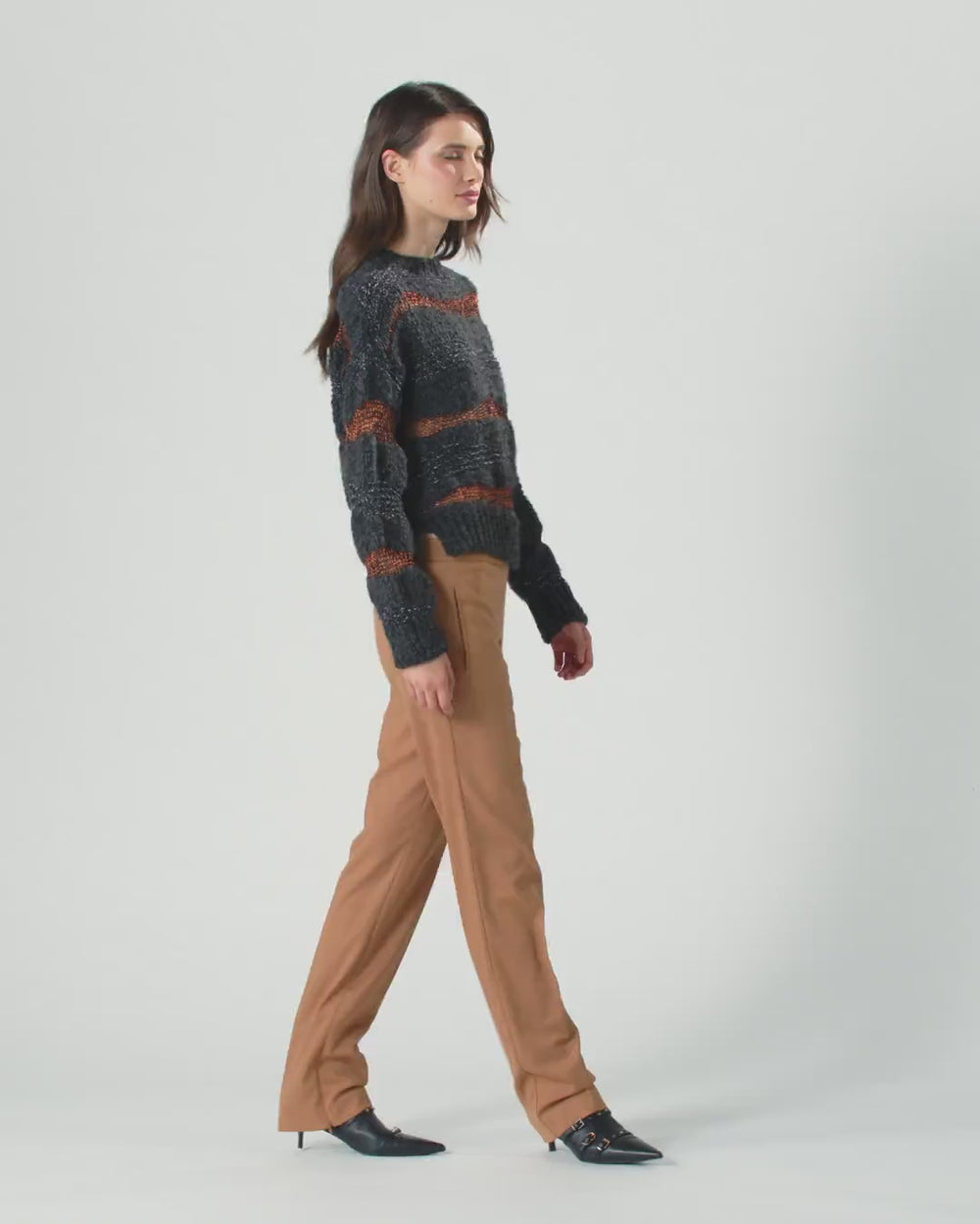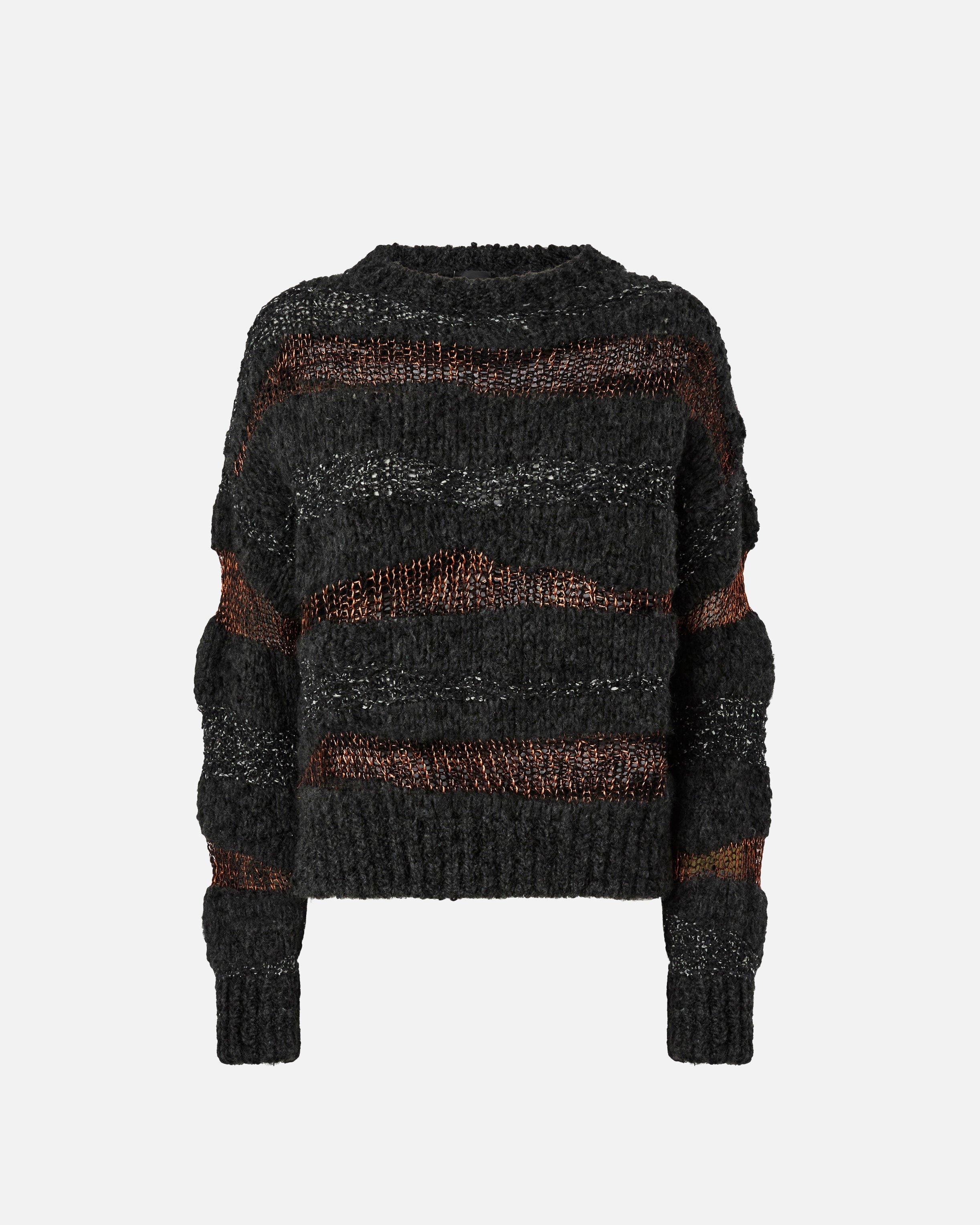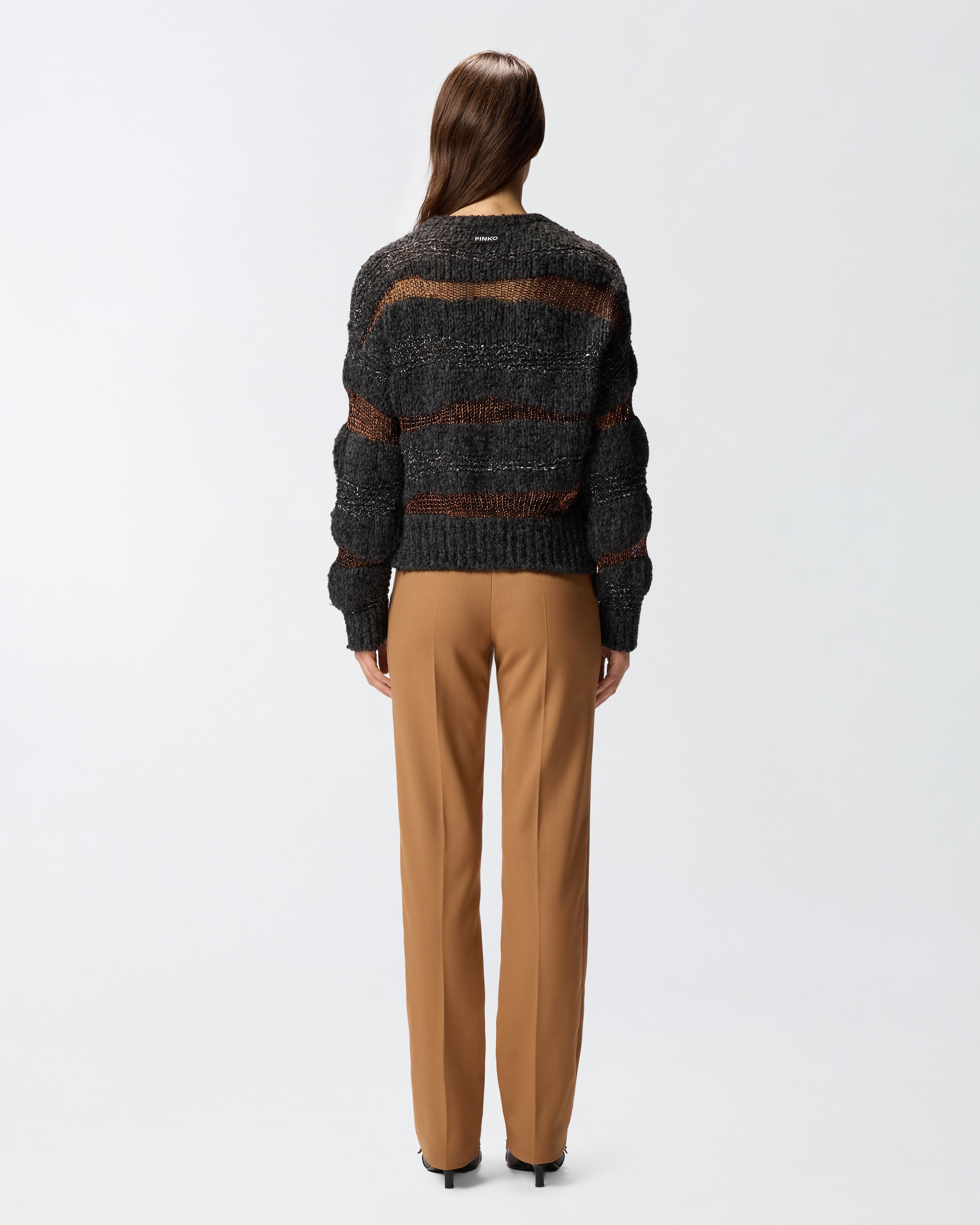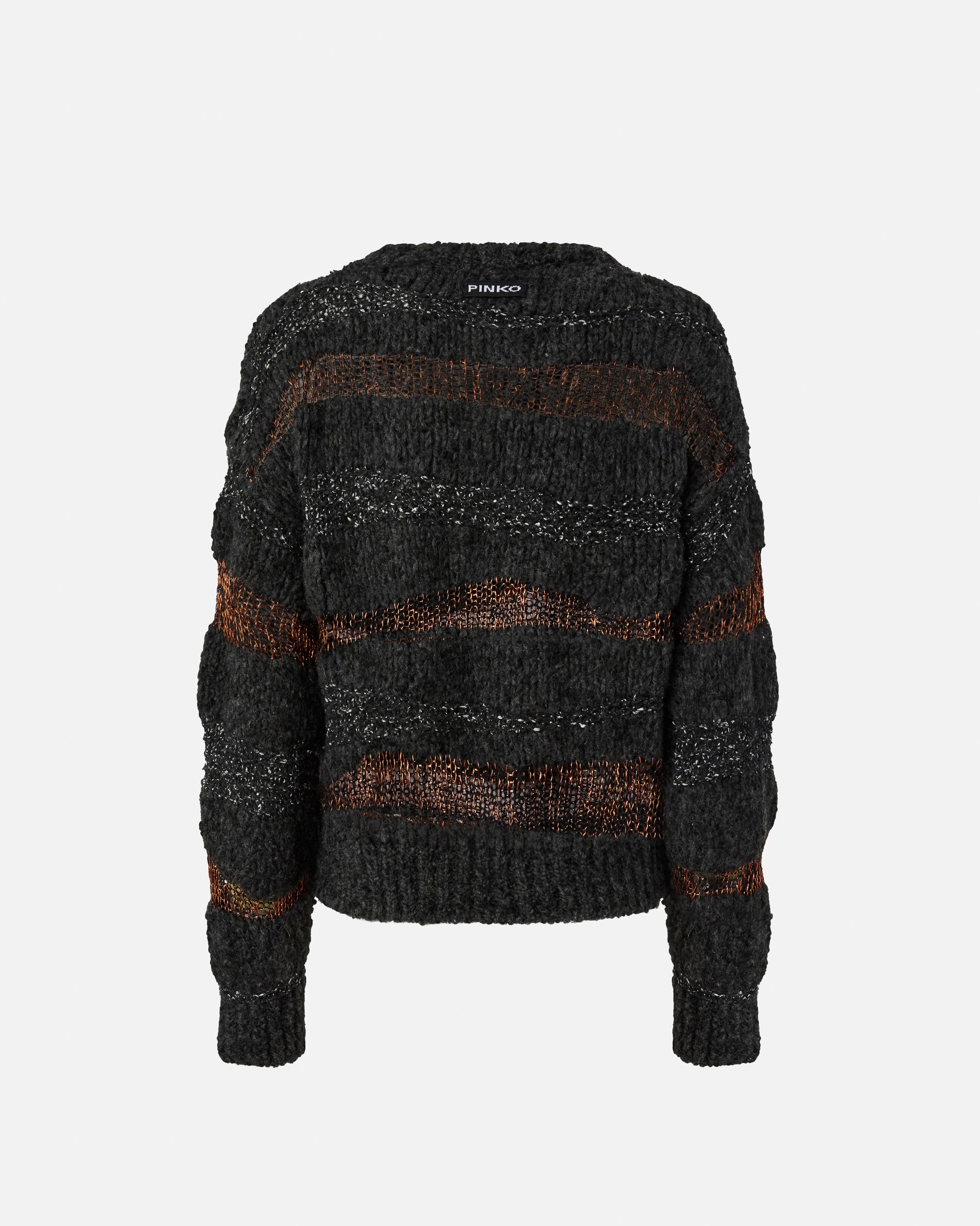 Pullover aus weichem, geknöpftem Jacquard-Gewebe mit langen Ärmeln und Rundhalsausschnitt. Der Rundhalsausschnitt, der Saum und die Ärmelbündchen sind gerippt, während die Etikette Ton in Ton mit dem PINKO-Logo als Lettering auf der Rückseite alles abrundet. Das Kleidungsstück wurde Veredelungsprüfungen unterzogen, um die mögliche Bildung von Pilling zu minimieren und ein weicheres und haltbareres Gewebe zu gewährleisten. Die Einzigartigkeit des Kleidungsstücks ergibt sich aus der Mischung verschiedener Verarbeitungstechniken und Garne sowie aus dem horizontalen Streifenmuster mit Metallfaden. Verzichten Sie auch an den kältesten Tagen nicht auf Stil.