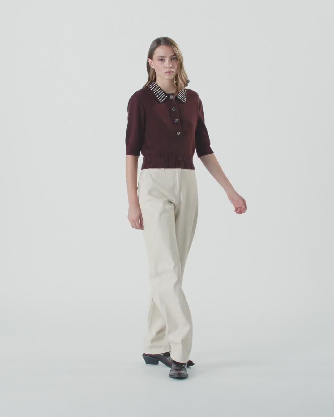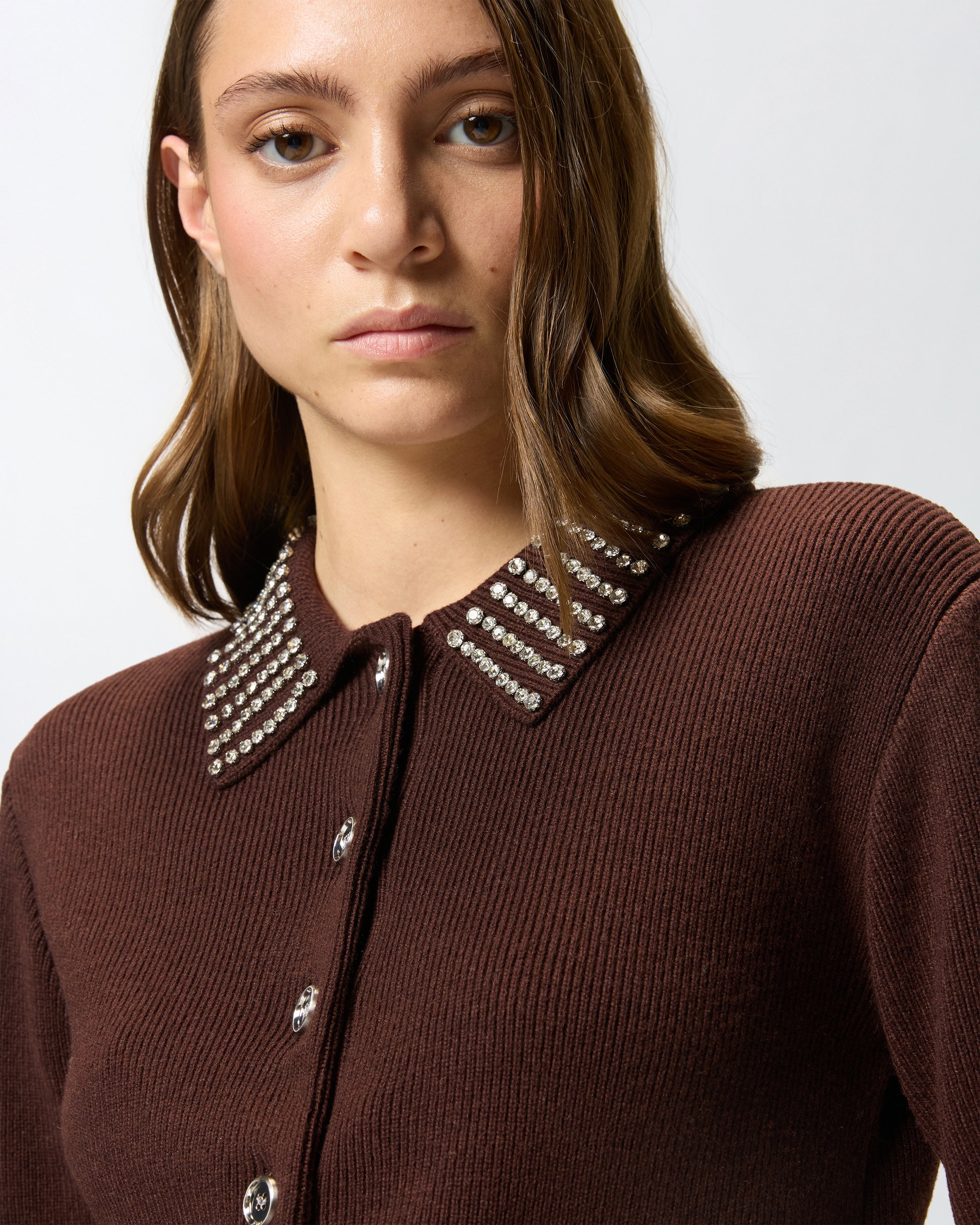 Kurzes Shirt im Polo-Stil mit Dreiviertel-Ärmeln, Kragen und drei Knöpfen auf der Vorderseite. Die Ärmelbündchen und der Saum des Kleidungsstücks sind gerippt, während die Etikette der Marke Ton in Ton auf der Rückseite hervorsticht. Der Kragen ist dank der Strassapplikationen, die das Design abrunden, ein echter Hingucker.