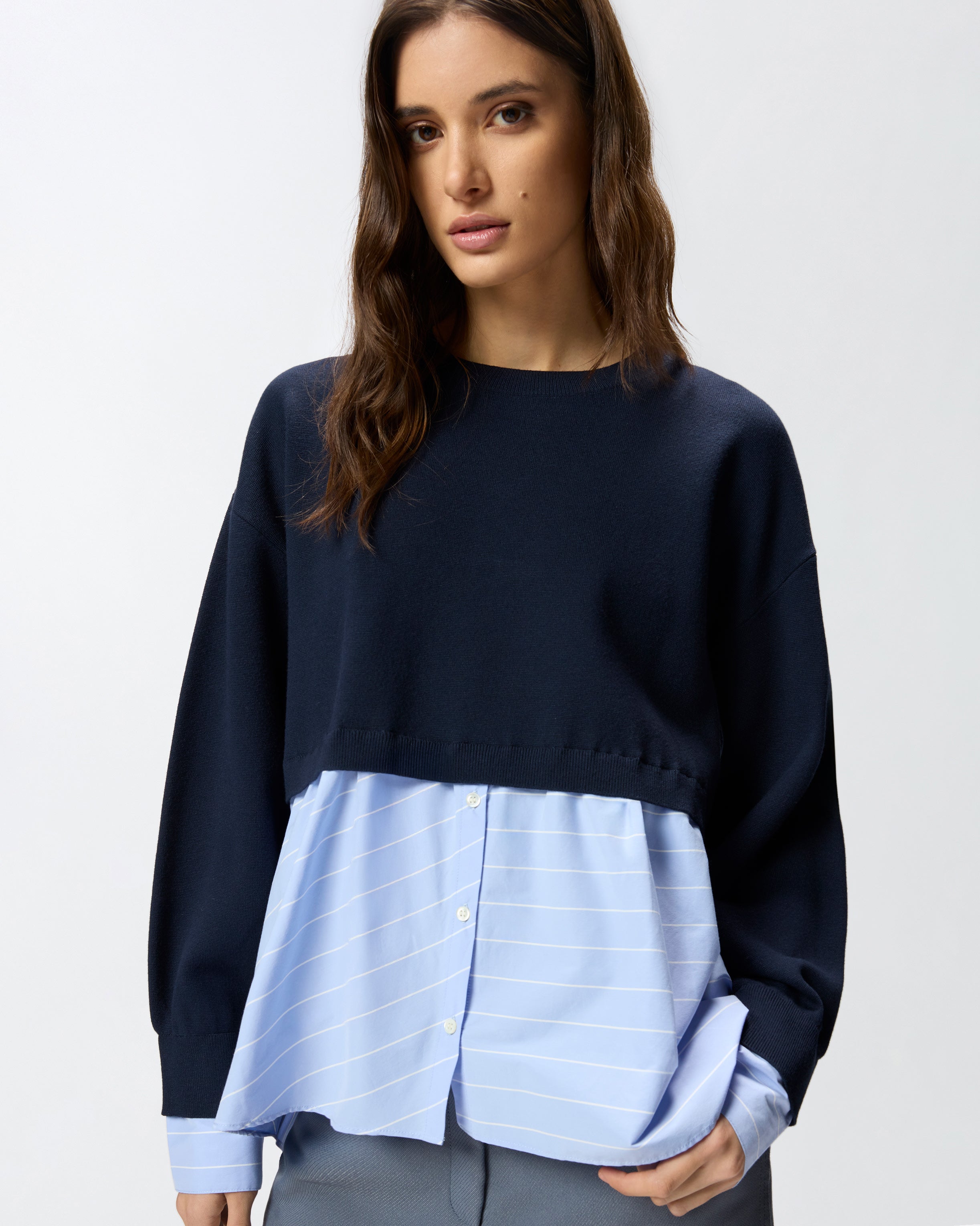 Pullover mit Rundhalsausschnitt, der sich durch ein Obermaterial aus Viskose-Mischgarn und einen kontrastierenden Bluseneinsatz aus Popeline in einem gestreiftem, stretchigen Baumwollmix auszeichnet, der die Ärmelbündchen und den Saum abrundet. Dieses Modell, das durch das Etikett mit dem PINKO-Logo als Lettering auf der Rückseite personalisiert ist, drückt die raffinierte Kreativität der Marke aus und ist ideal für moderne Looks, die Funktionalität und Stil vereinen. - LAVA SWEATER