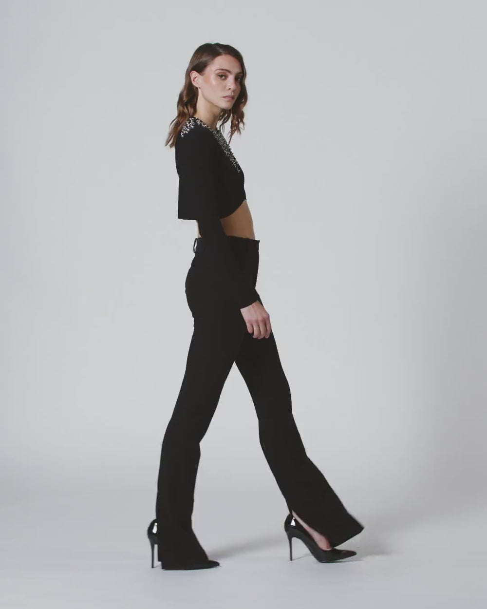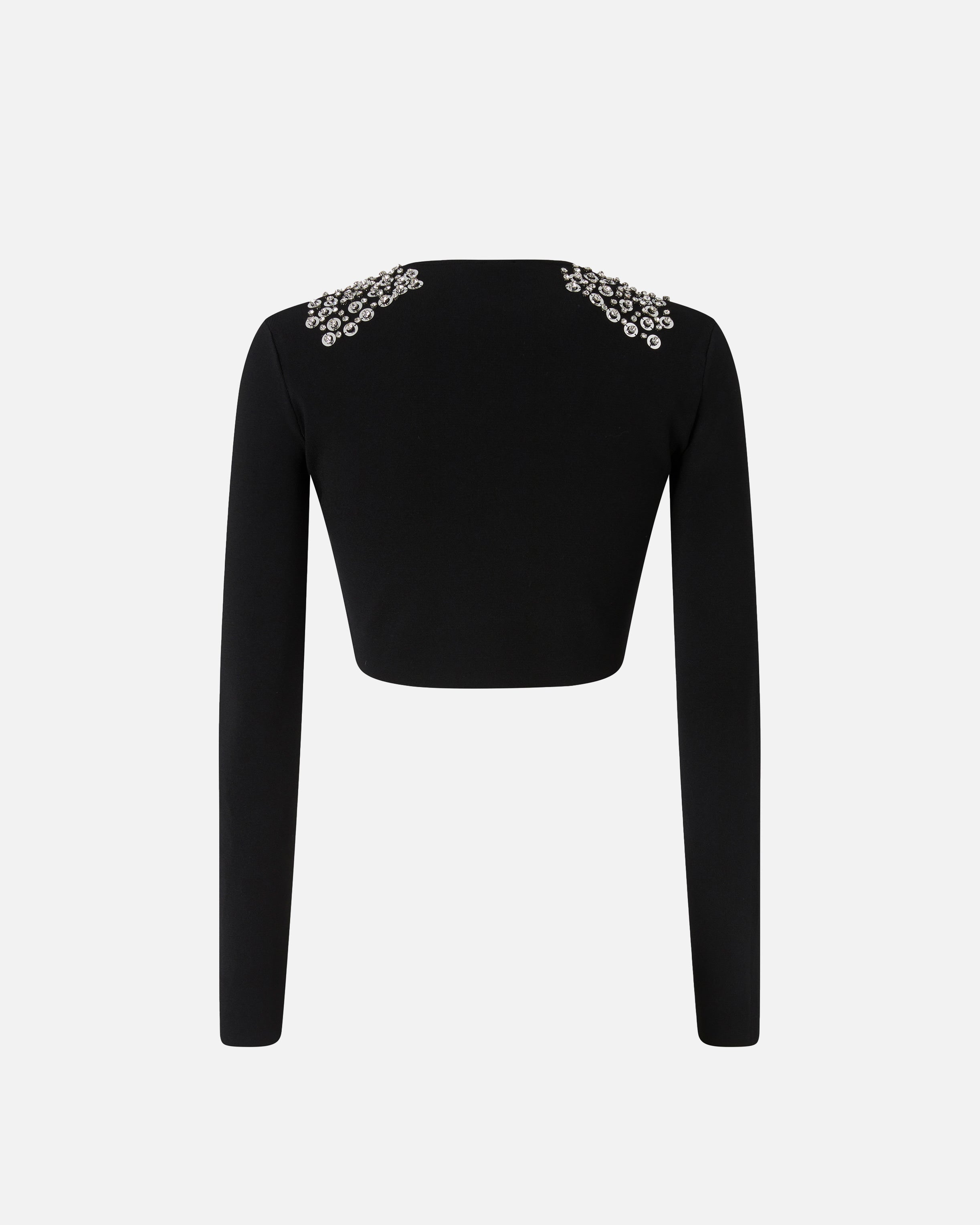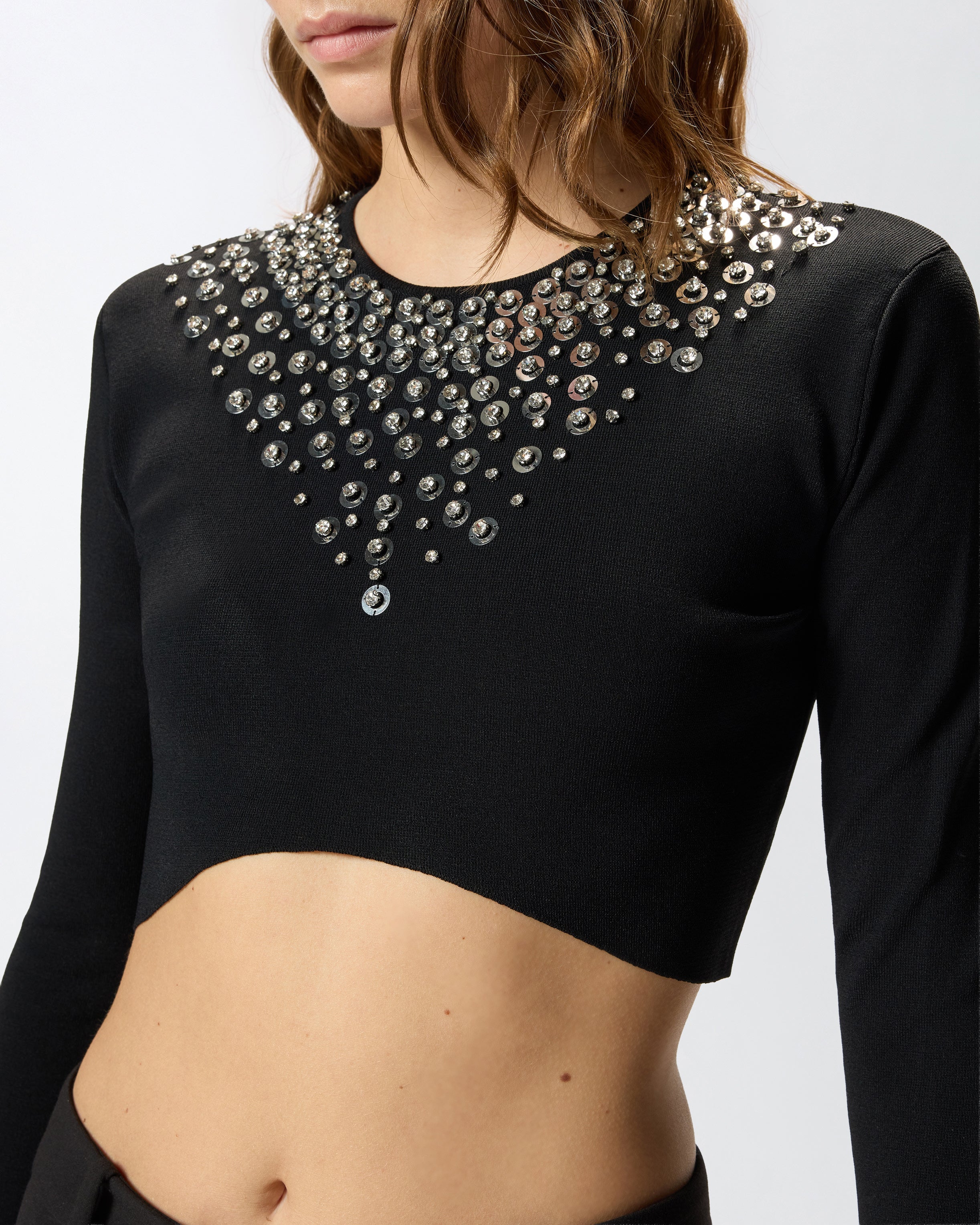 Pullover mit langen Ärmeln, Rundhalsausschnitt und Cropped-Passform. Die Kristalle in verschiedenen Größen sind gekonnt am Ausschnitt angeordnet und erzeugen ein Spiel aus Reflexen, die einen Hauch von raffiniertem Glanz entstehen lassen. Die Gesamtheit der silberfarbene Pailletten verleiht dem Kleidungsstück einen eleganten Glanz und reflektiert das Licht leicht. Der Kontrast zwischen der Weichheit des Pullovers und der Sorgfalt der Stickerei macht diesen Pullover zu einem Unikat, perfekt für besondere Anlässe oder für diejenigen, die einen Hauch von Luxus im Alltag suchen.
