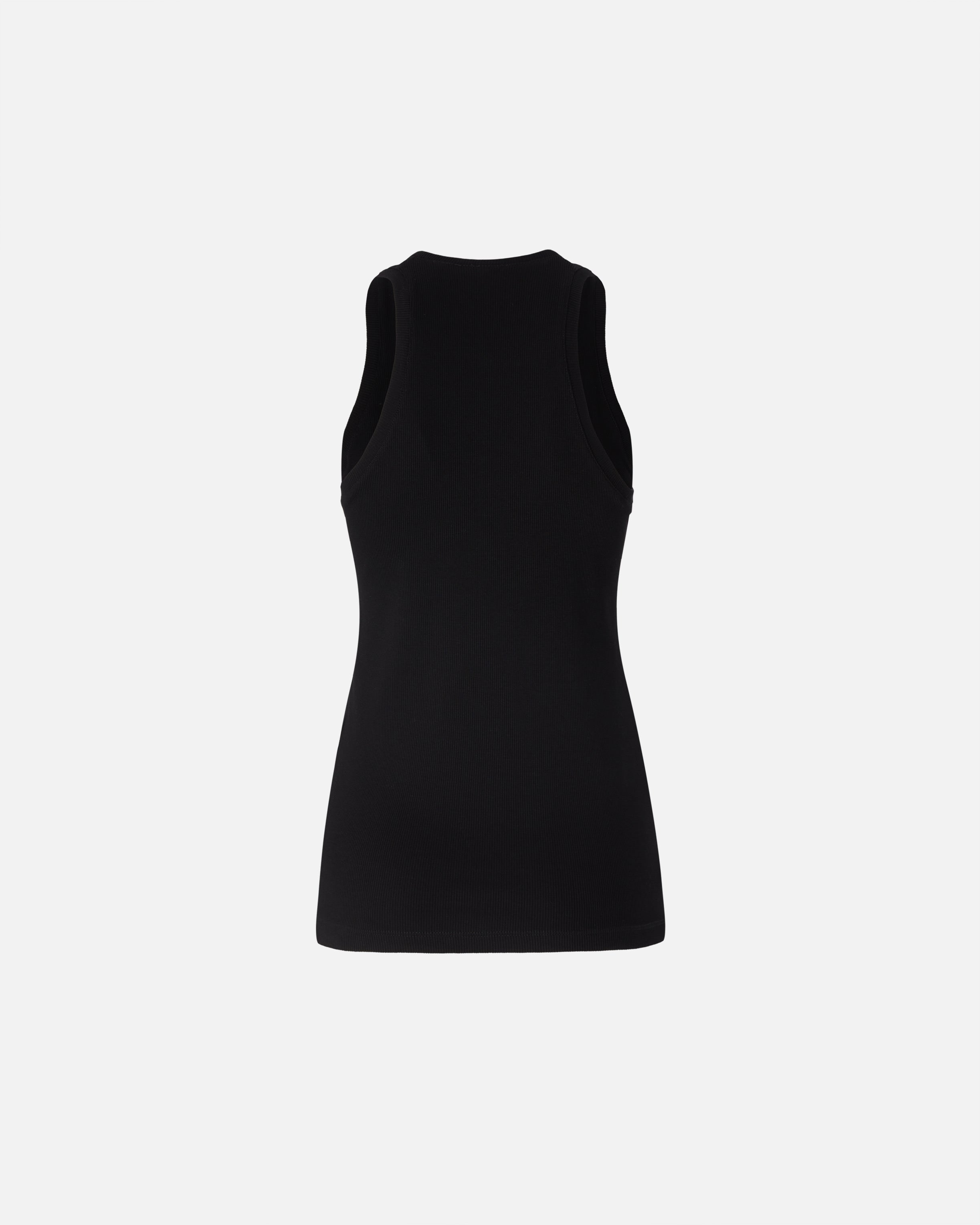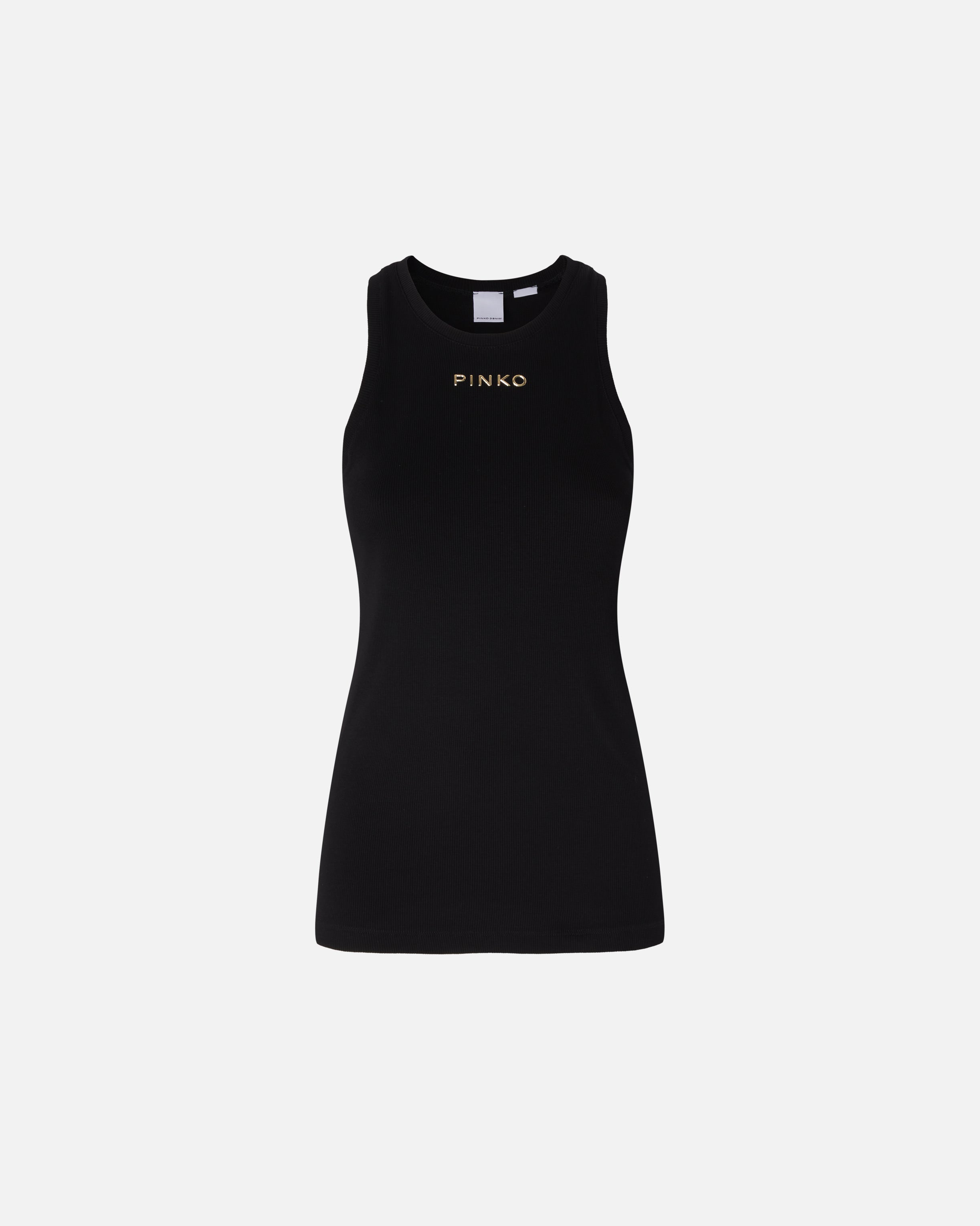 Eng anliegendes, ärmelloses Tanktop mit rückseitigem Racer-Ausschnitt aus elastischem Baumwollripp mit mittigem Mini-Logo PINKO auf der Vorderseite.