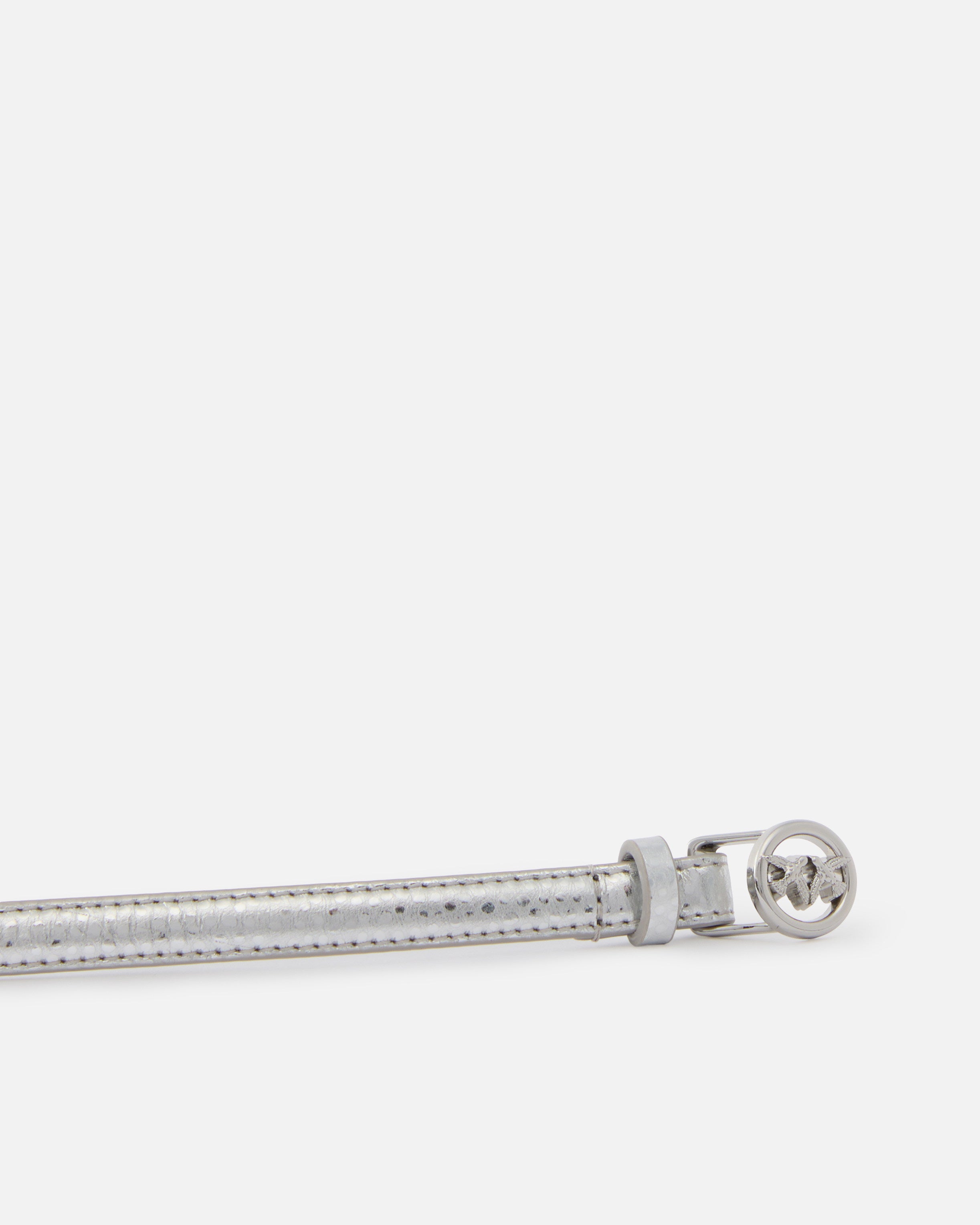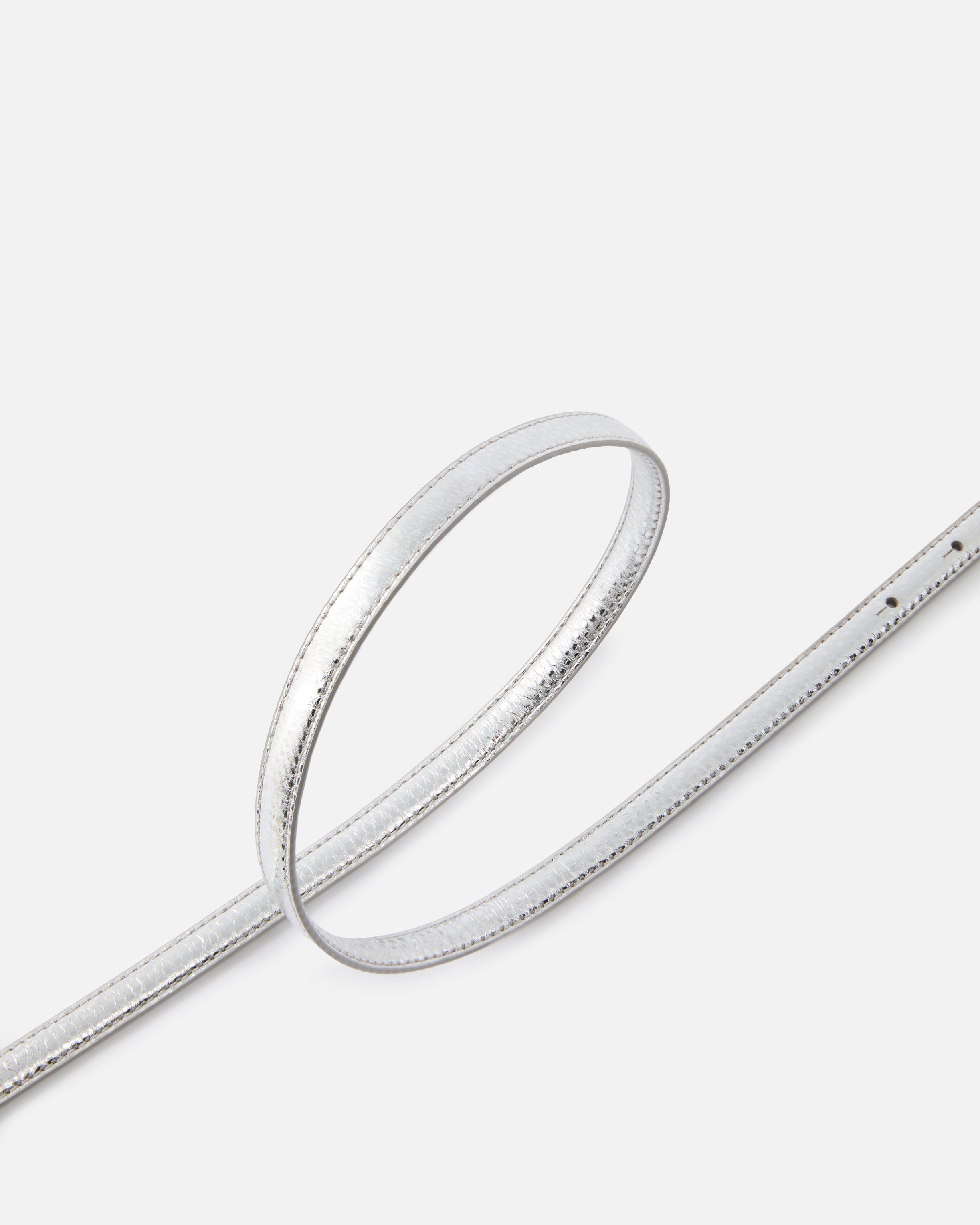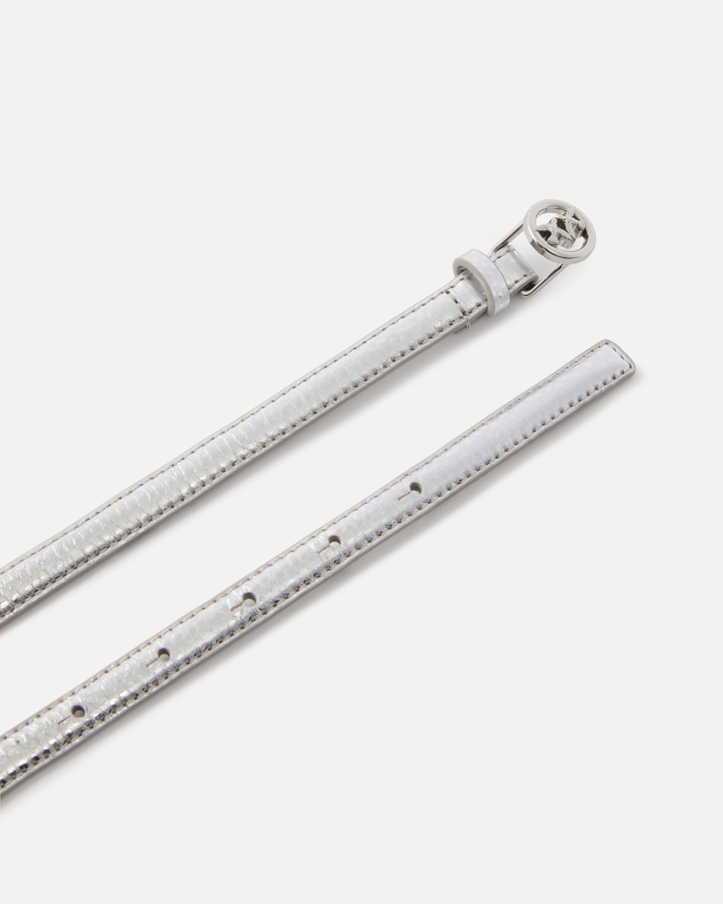 Super schmaler Gürtel, 1 cm breite, aus Narbenleder mit laminiertem Finish für einen leuchtenden Touch. Das Modell ist perfekt, um ein Tagesoutfit aufzuwerten oder einen eleganten Abendlook zu vervollständigen, und wird durch eine kleine, kreisförmige Schnalle mit den ikonischen Love Birds personalisiert.
