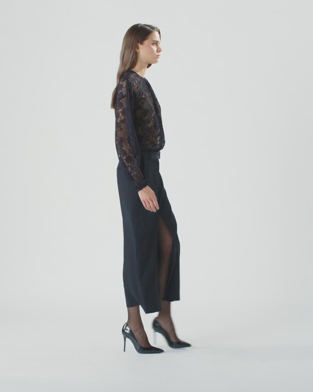 Feminine long-sleeved bodysuit in semi-sheer rebrodé lace decorated with an elaborate design. Keyhole fastened with lacing in the middle at the back. Pair this bodysuit with the lace pencil skirt in the same colour for a bold, feminine head-to-toe look.