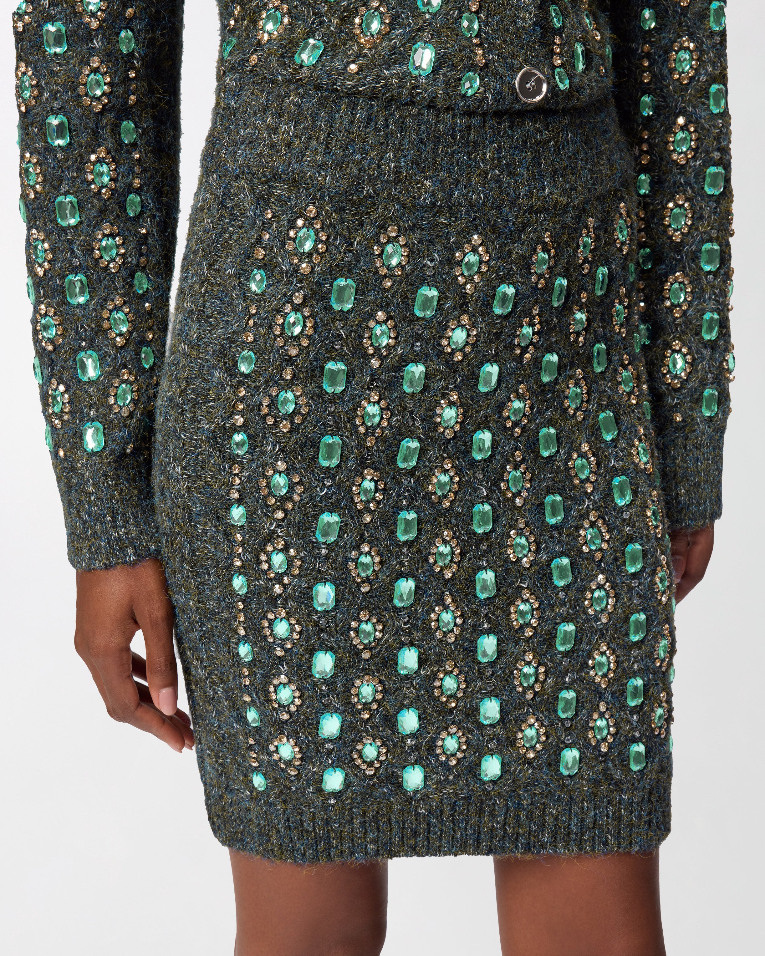 Strickrock aus verschiedenfarbigen Garnen, der sich durch ein Zopfmuster auszeichnet, das dem Design Bewegung und Dreidimensionalität verleiht, und durch eine gerippte Verarbeitung an der elastischen Taille und am Saum. Der Strickrock ist mit vollständig von Hand aufgestickten Schmucksteinen an der Vorderseite verziert, die einen Farbkontrast zum Garn bilden. So verleiht dieses Modell Ihrer Garderobe einen originellen Akzent. Erwärmen Sie Ihre Winteroutfits mit diesem Kleidungsstück, das für einen raffinierten und essentiellen Total Look mit der passenden Strickjacke kombiniert werden kann. Das Kleidungsstück wurde Veredelungsprüfungen unterzogen, um die mögliche Bildung von Pilling zu minimieren und ein weicheres und haltbareres Gewebe zu gewährleisten.