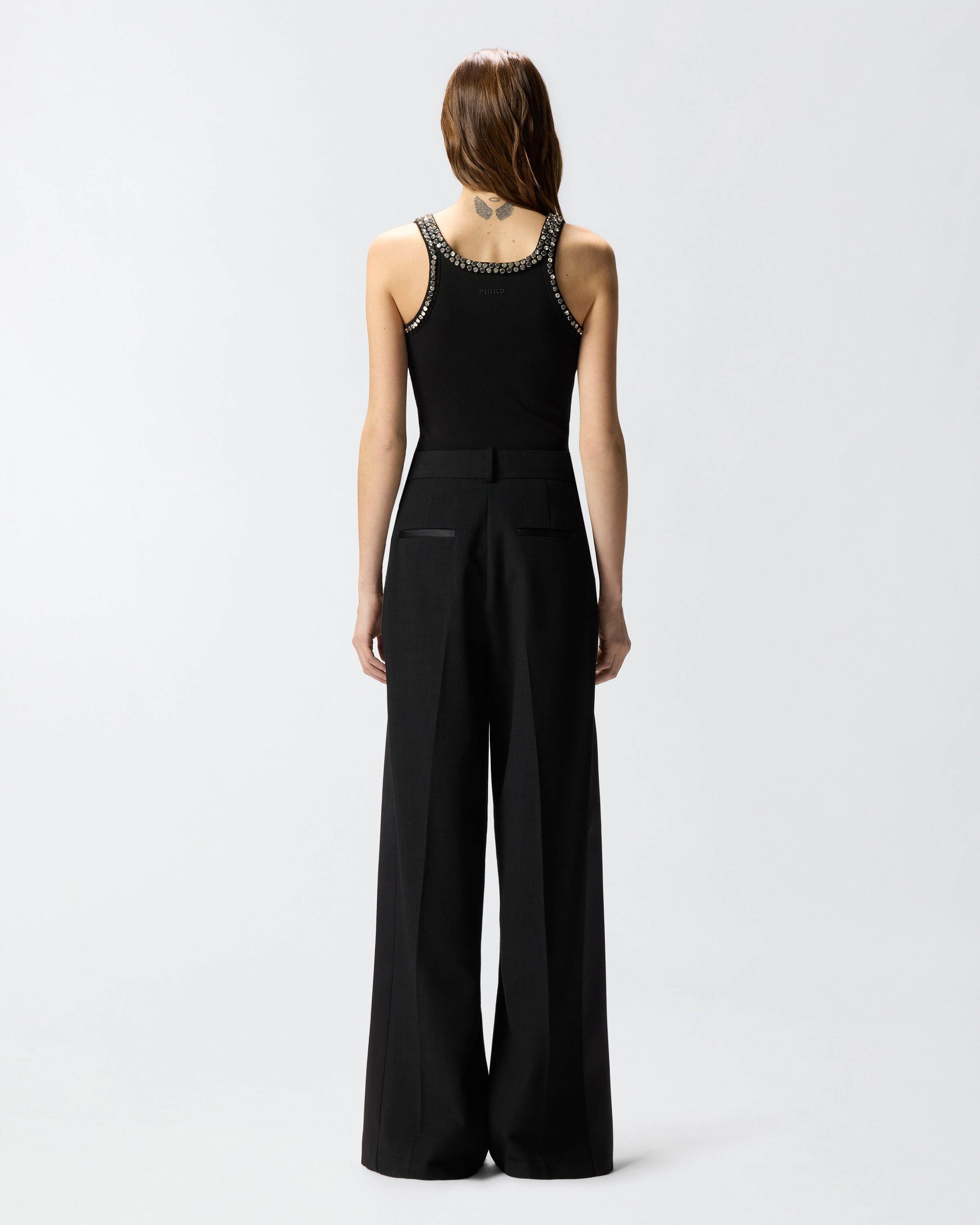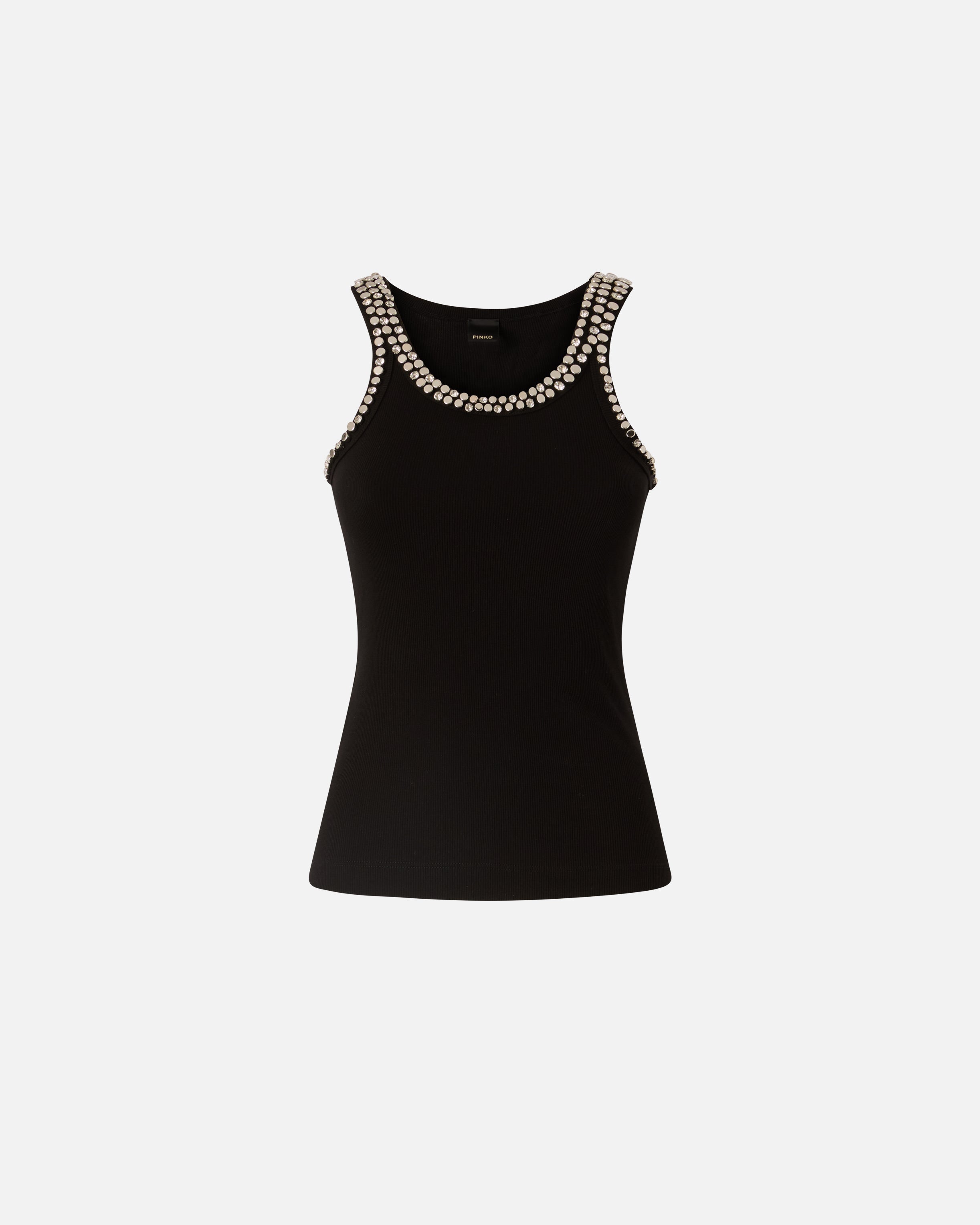 Top aus Jersey in einer Baumwollmischung in Rippstrick. Die Träger und Ausschnitte vorne und hinten sind mit händisch aufgestickten Kristallen und Nieten bedeckt, die dem Kleidungsstück Licht und Kostbarkeit verleihen. Betonten Sie die Eleganz und Weiblichkeit jedes Outfits mit diesem Top, das die perfekte Unterbekleidung in Kombination mit geschneiderter Hose, aber auch mit einer besonderen Jeans ist. - CORIANDOLI TANK TOP