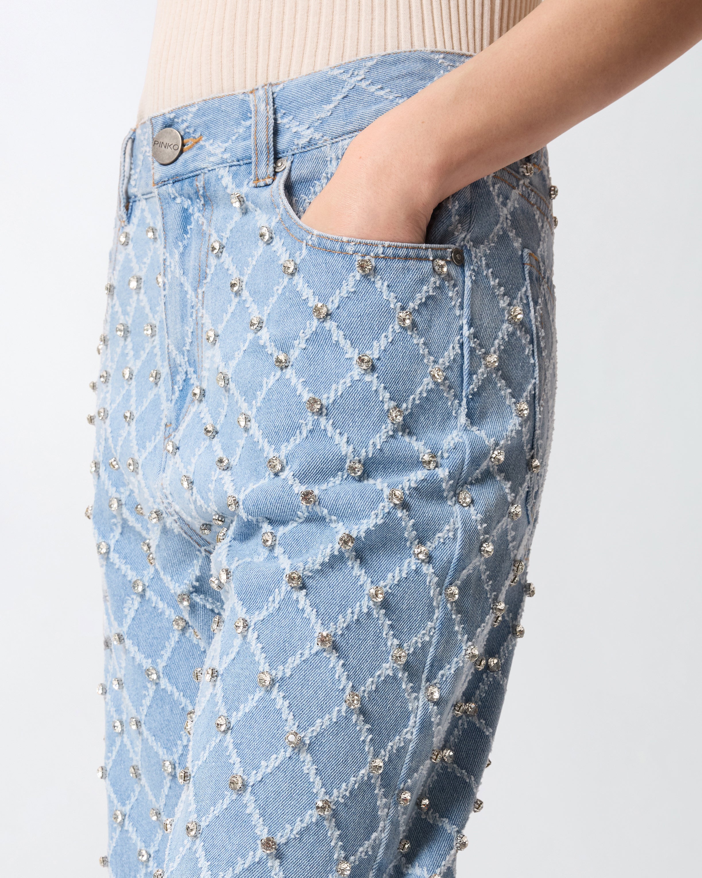 Five-Pocket-Jeans aus Denim in reiner Baumwolle mit weitem Bein und leicht ausgefranstem PINKO-Schriftzug auf einer der Gesäßtaschen. Das Modell setzt auf ein modernes Spiel der Kontraste, wie es nur PINKO kann: Der Minimalismus des Designs wird mit dem leicht kontrastierenden, lasergeschnittenen Rautenmuster kombiniert, das mit leuchtenden, händisch aufgestickten Strasssteinen verziert ist. Tragen Sie dieses Kleidungsstück mit der passenden Jacke und machen Sie sich bereit, Ihre Alltagslooks zum Leuchten zu bringen! - WANDA WIDE LEG