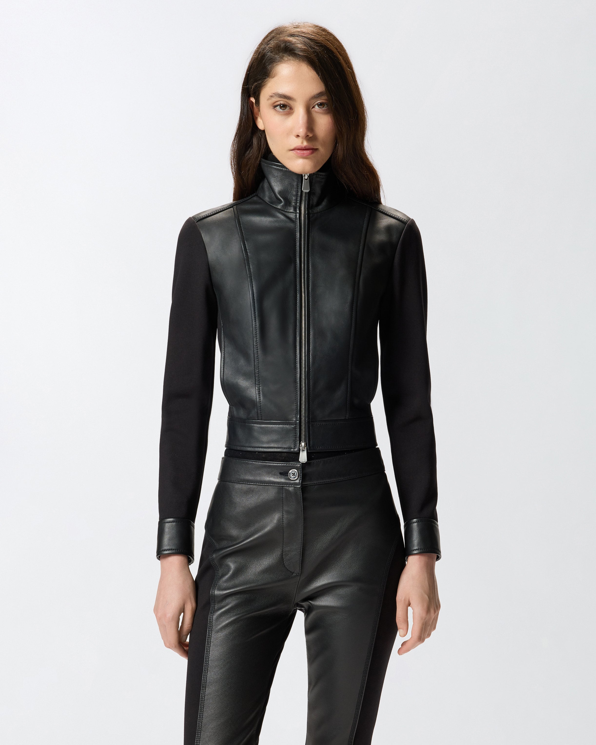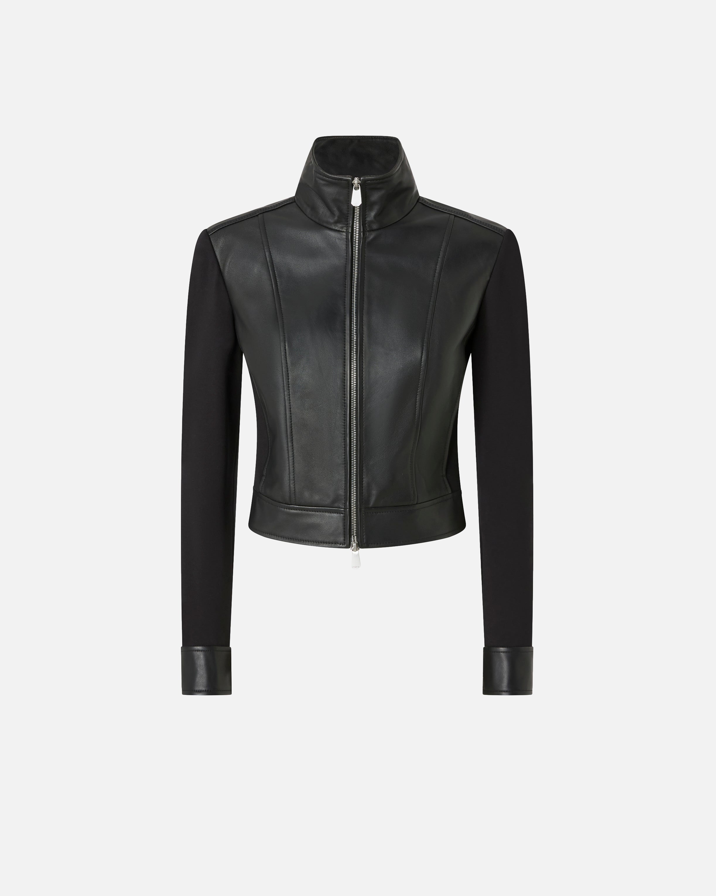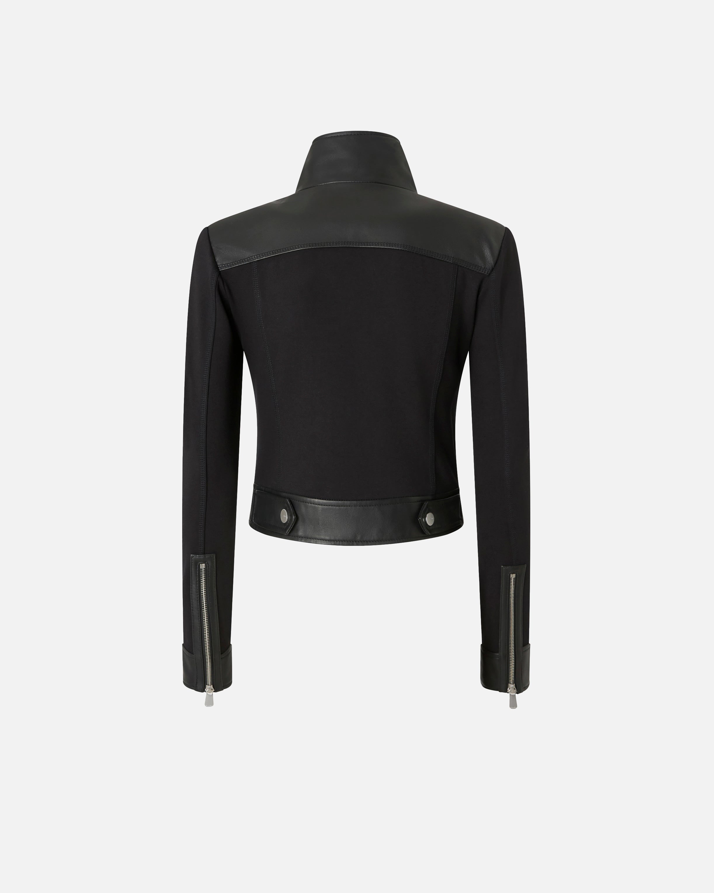 Nietenlederjacke im Biker-Stil aus zwei Materialien, die sich durch die Kombination aus weichem Leder und Neopren auszeichnet, für ein komfortables Endergebnis, das sich gut an die eng anliegende Linie anpasst und die DNA von PINKO vollständig zum Ausdruck bringt. Der hohe Kragen, die langen Ärmel mit Reißverschluss am Saum und die Riemchen mit Knopf hinten am Saum runden das Design ab. Zwei-Wege-Reißverschluss aus Metall vorne.