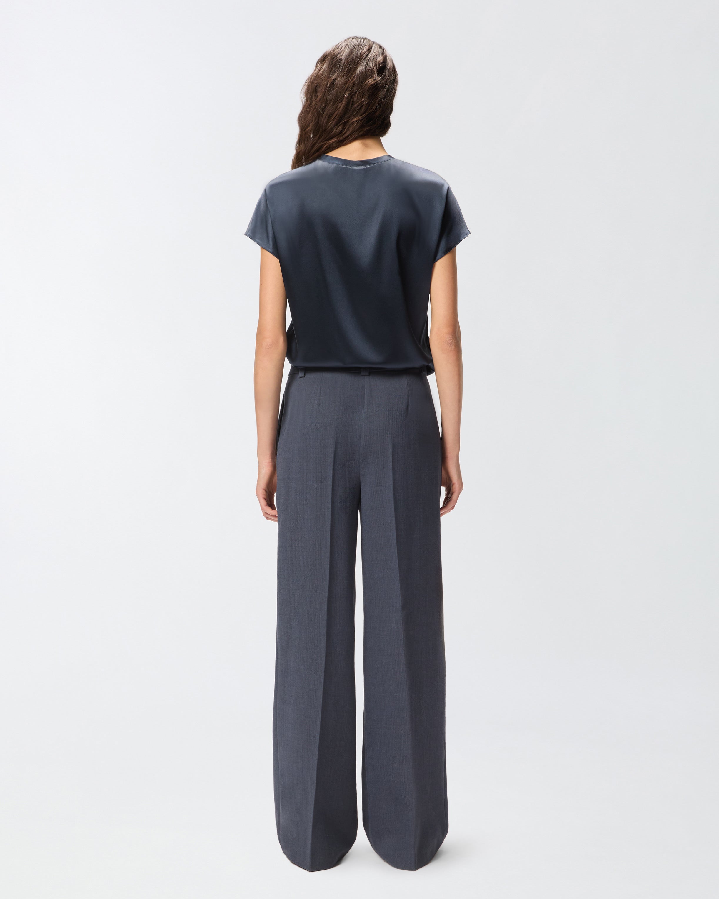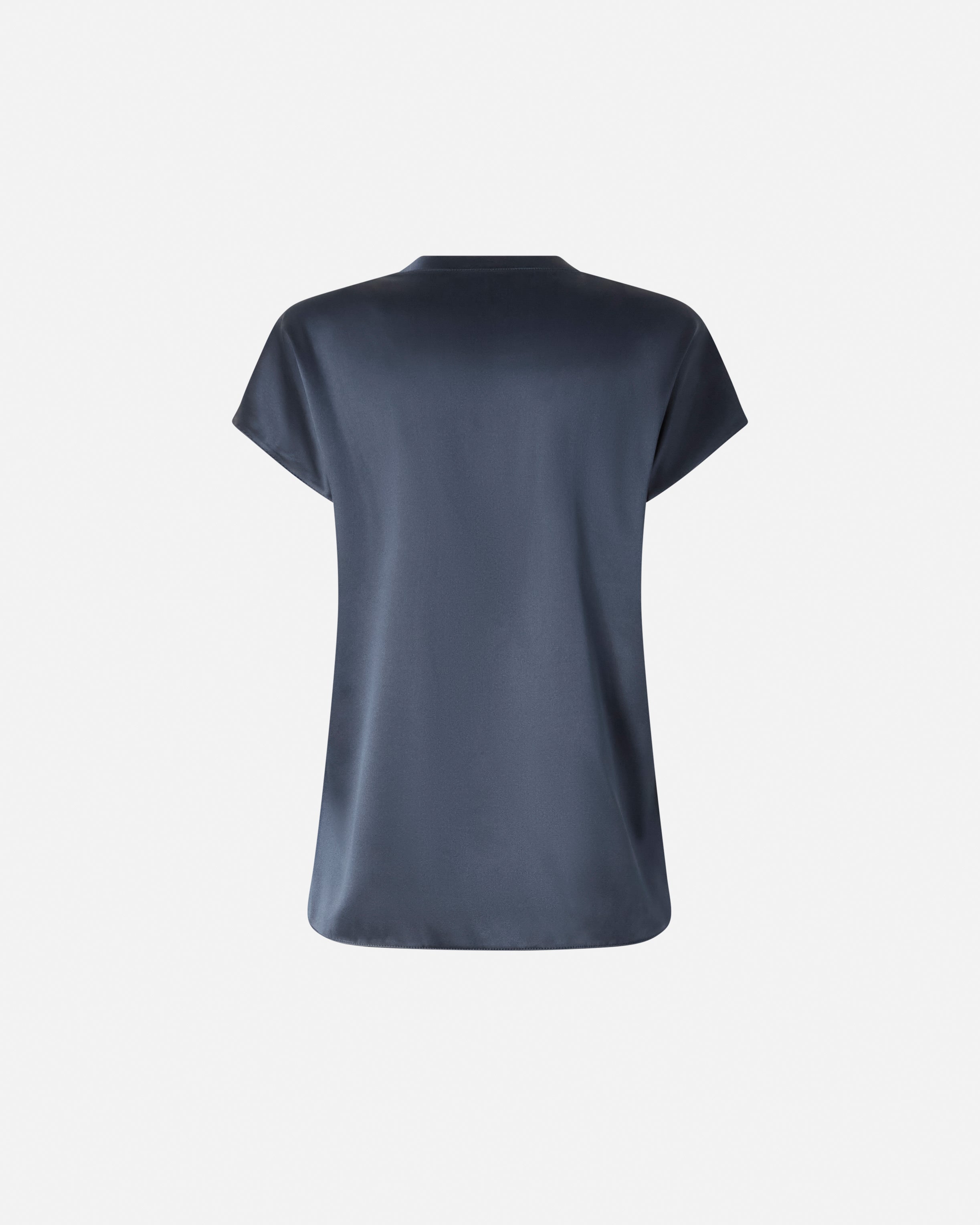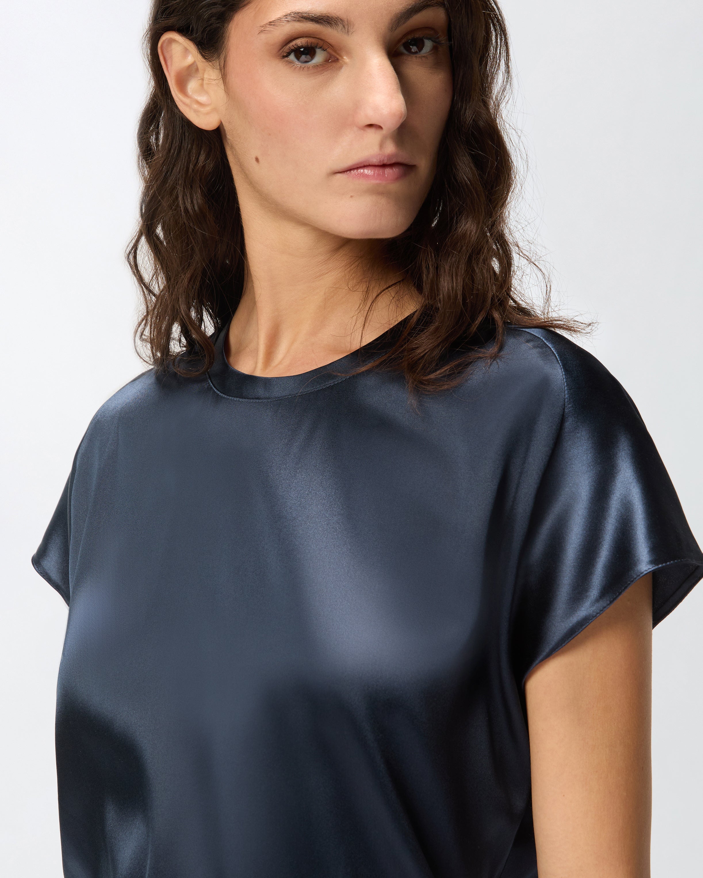 Bluse mit Rundhalsausschnitt und kurzen Ärmeln aus leichtem, stretchigem Satin in Seide, die sich elegant mit der Person, die sie trägt, bewegt, fließend ist und der Figur schmeichelt. Diese Bluse wird zu einem Eckpfeiler Ihrer lässigen Alltagslook und auch anderer Outfits, stimmen Sie zu?