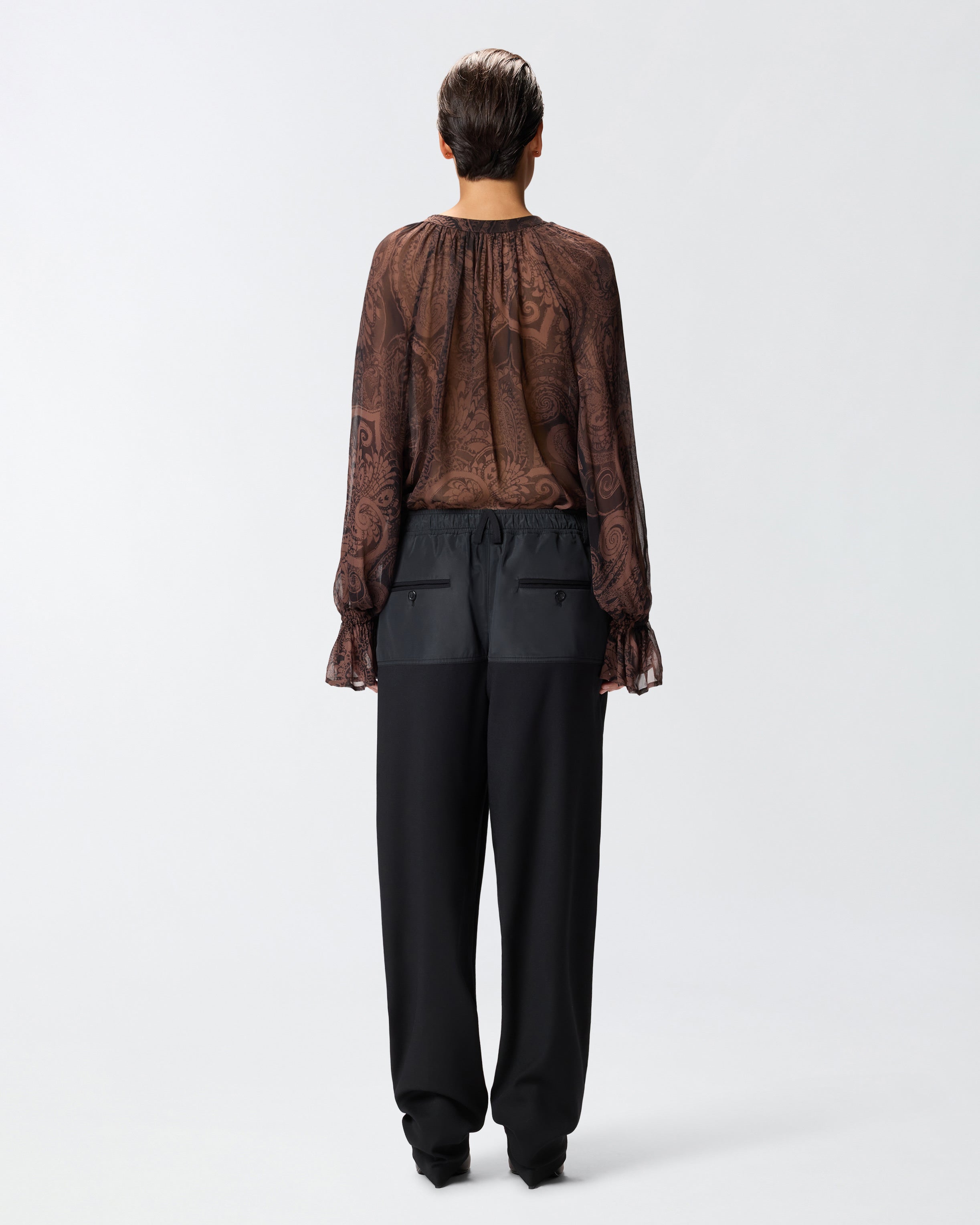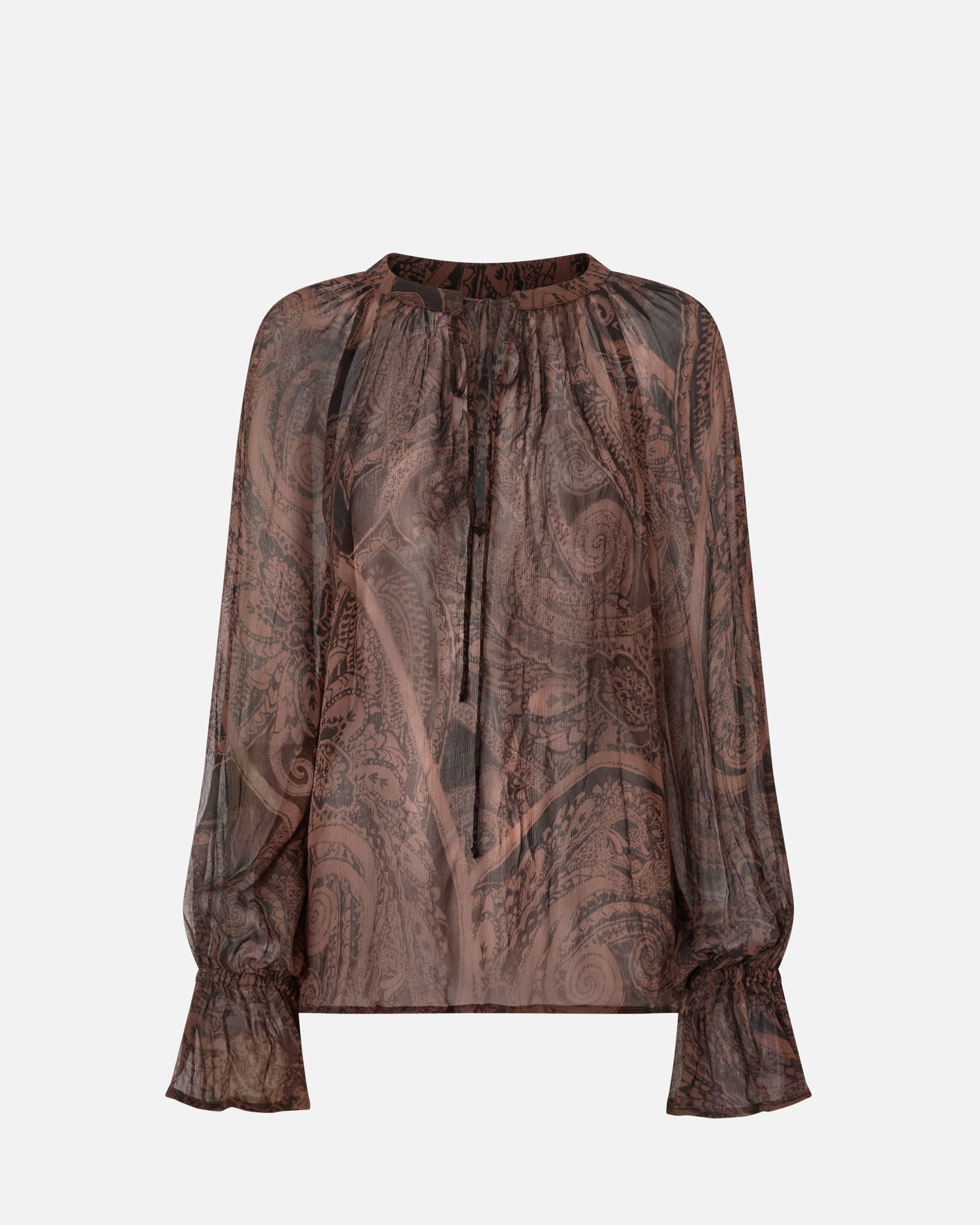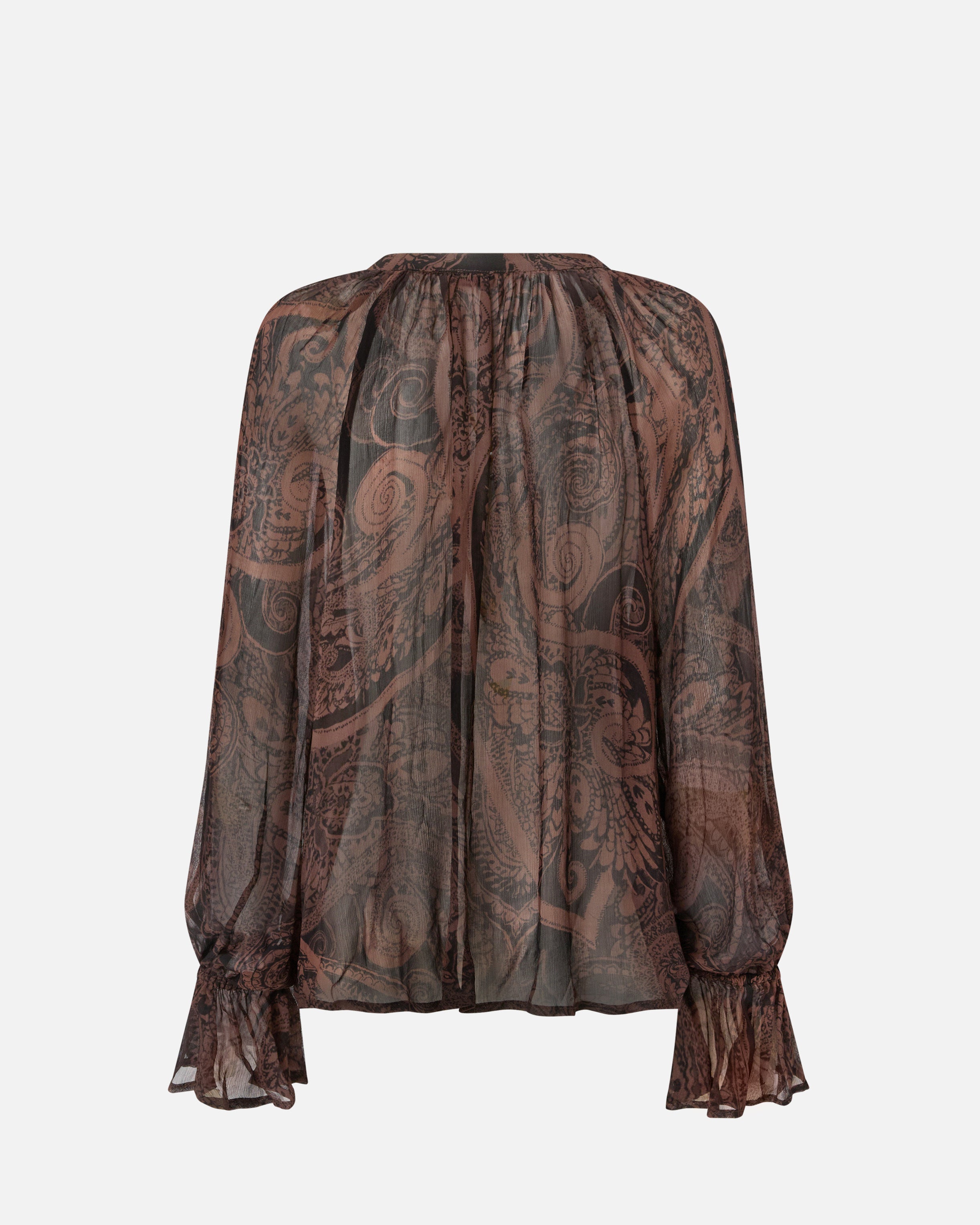 Bluse mit langen Ärmeln und Volant, die sich durch eine lockere Passform auszeichnet und am Rundhalsausschnitt mit Schleifenbändern geschlossen wird, die auf der Vorderseite frei fallen. Das Modell besteht aus leichtem, halbtransparentem Creponne-Gewebe in Viskose und ist mit einem raffinierten Print im Kaschmir-Stil versehen. Die Leichtigkeit und die Silhouette des Kleidungsstücks machen es besonders feminin, die perfekte Wahl für einen Aperitif unter Freundinnen oder für den Tag.