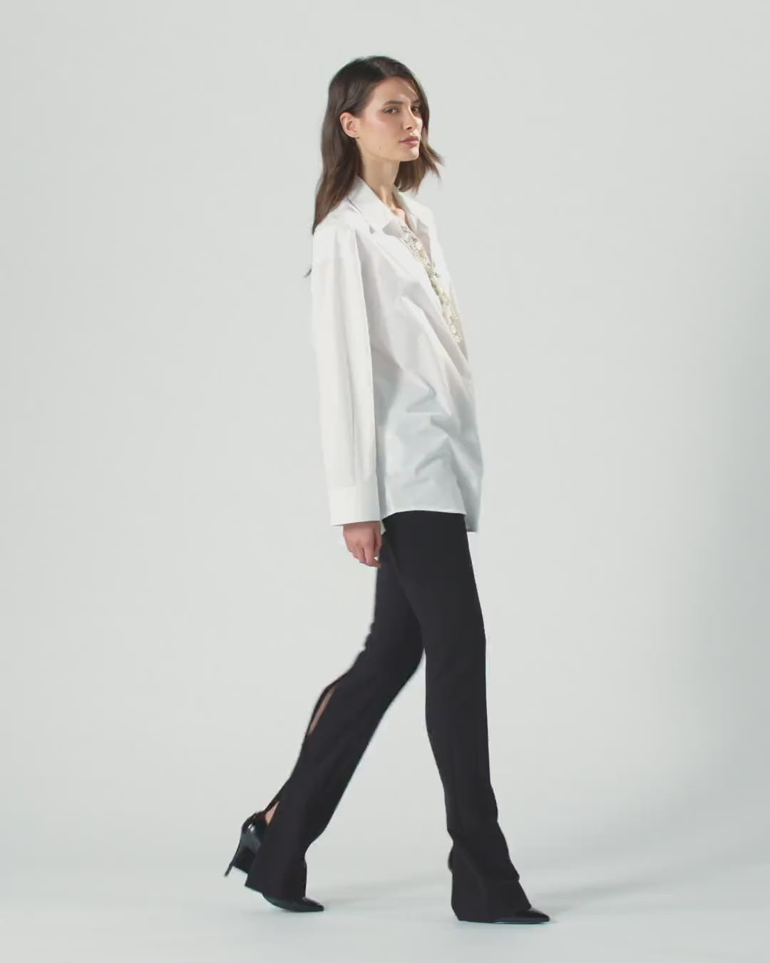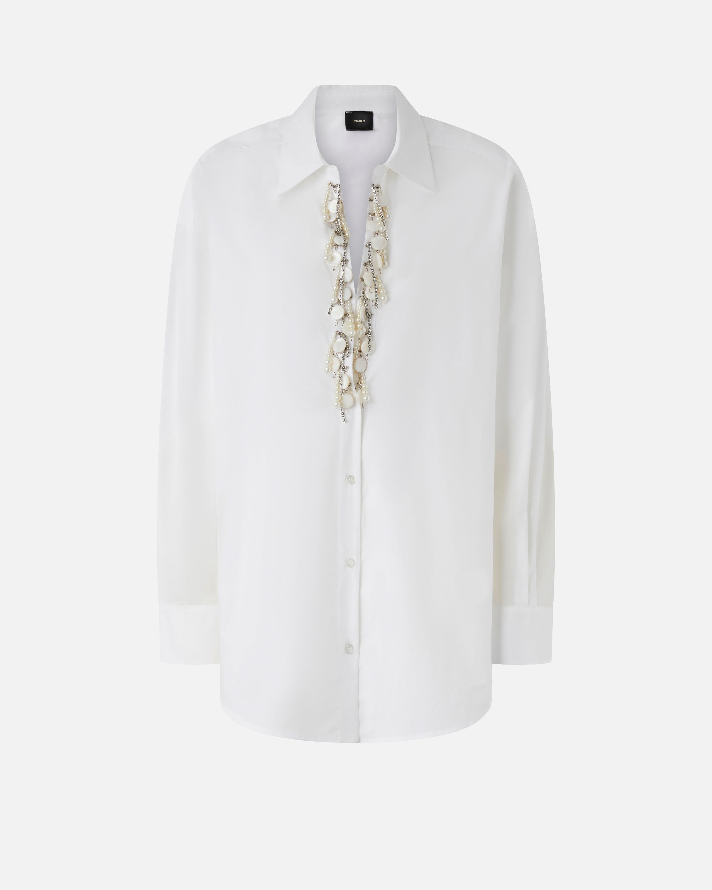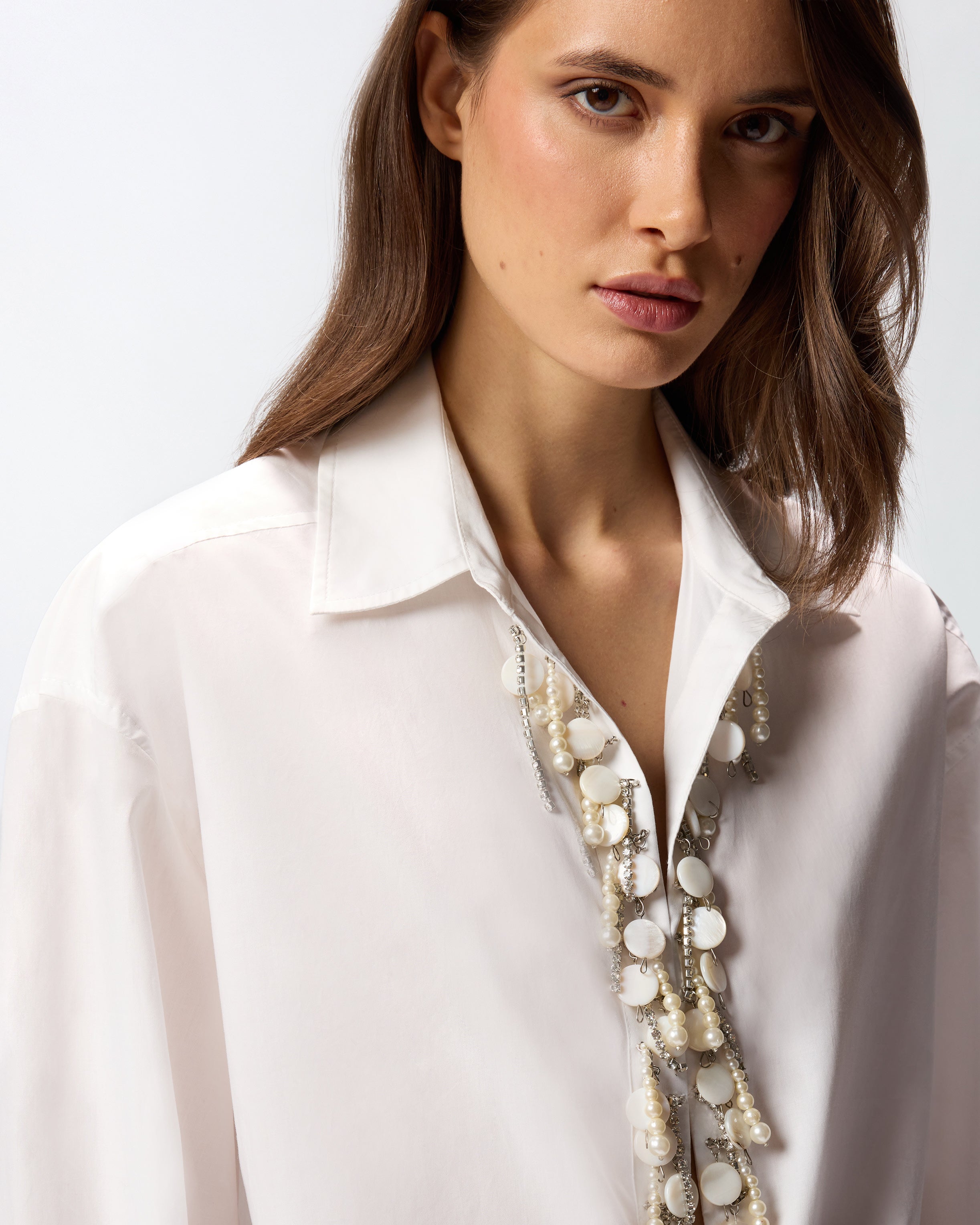 Klassische Bluse in leichter Oversize-Passform aus Popeline aus reiner Baumwolle. Der Kragen öffnet sich zu einem tiefen V-Ausschnitt, der mit einer kostbaren, händisch angebrachten Stickerei mit Glasapplikationen und Metallketten mit Strasssteinen verziert ist, die nacheinander aufgenäht sind und dem Kleidungsstück Bewegung und Licht verleihen. Das weiche Volumen und die etwas tiefer angesetzten langen Ärmel runden den Stil dieser Bluse ab, das sich leicht mit einem Minirock und einer bedruckten Jacke kombinieren lässt, um ein feminines und charakteristisches Alltagsoutfit zu kreieren.