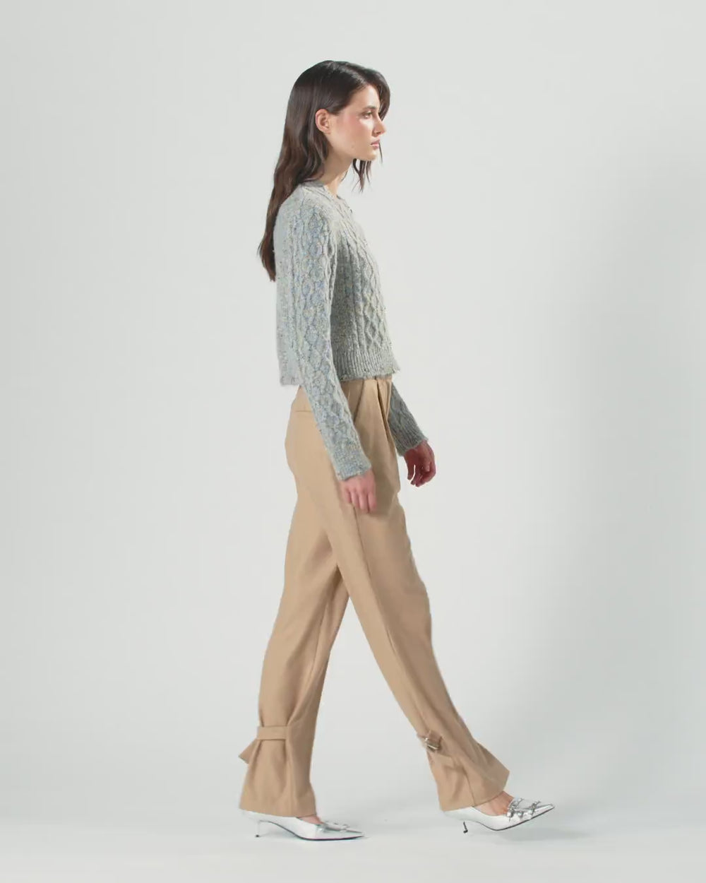 Cardigan in Strick mit Rundhalsausschnitt und langen Ärmeln aus verschiedenfarbigen Garnen. Das Kleidungsstück zeichnet sich durch eine Verarbeitung in Rippstrick auf der Rückseite und einen Zopf an der Vorderseite und an den Ärmeln aus, die dem Design Bewegung und Dreidimensionalität verleihen. Die Vorderseite hat einen klassischen Verschluss mit Knöpfen, während das Etikett mit dem PINKO-Logo als Schriftzug Ton in Ton das Accessoire mit einer persönlichen Note abrundet. Das Kleidungsstück wurde Veredelungsprüfungen unterzogen, um die mögliche Bildung von Pilling zu minimieren und ein weicheres und haltbareres Gewebe zu gewährleisten.