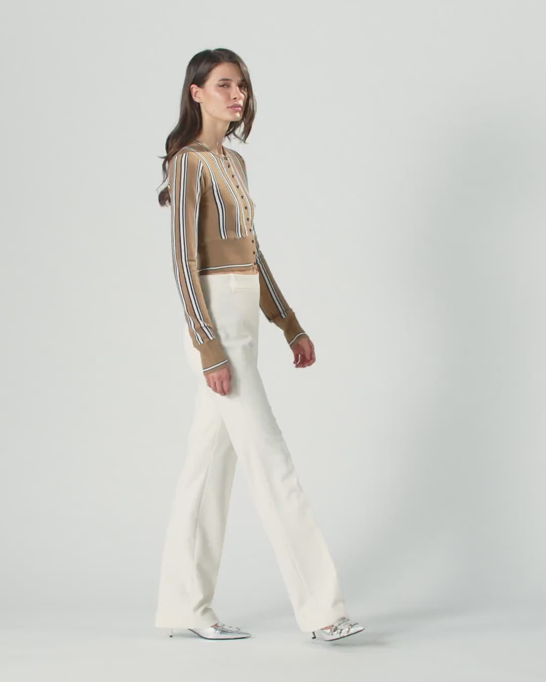 Cardigan aus extrafeiner, reiner Merinowolle mit einem Motiv aus vertikalen Streifen in einer Kontrastfarbe, perfekt, um der Garderobe einen Farbakzent zu verleihen. Die Ärmelbündchen und der Saum unten des Kleidungsstücks sind im Rippstrick verarbeitet, während die Rückseite mit einem Etikett mit PINKO-Logo versehen ist. Das Kleidungsstück wurde Veredelungsprüfungen unterzogen, um die mögliche Bildung von Pilling zu minimieren und ein weicheres und haltbareres Gewebe zu gewährleisten. Wählen Sie dieses Design, um einen lebendigen, aber stilvollen Look zu kreieren, der Sie zu jeder Tageszeit begleitet, vom Büro bis zu Abenden in guter Gesellschaft.
