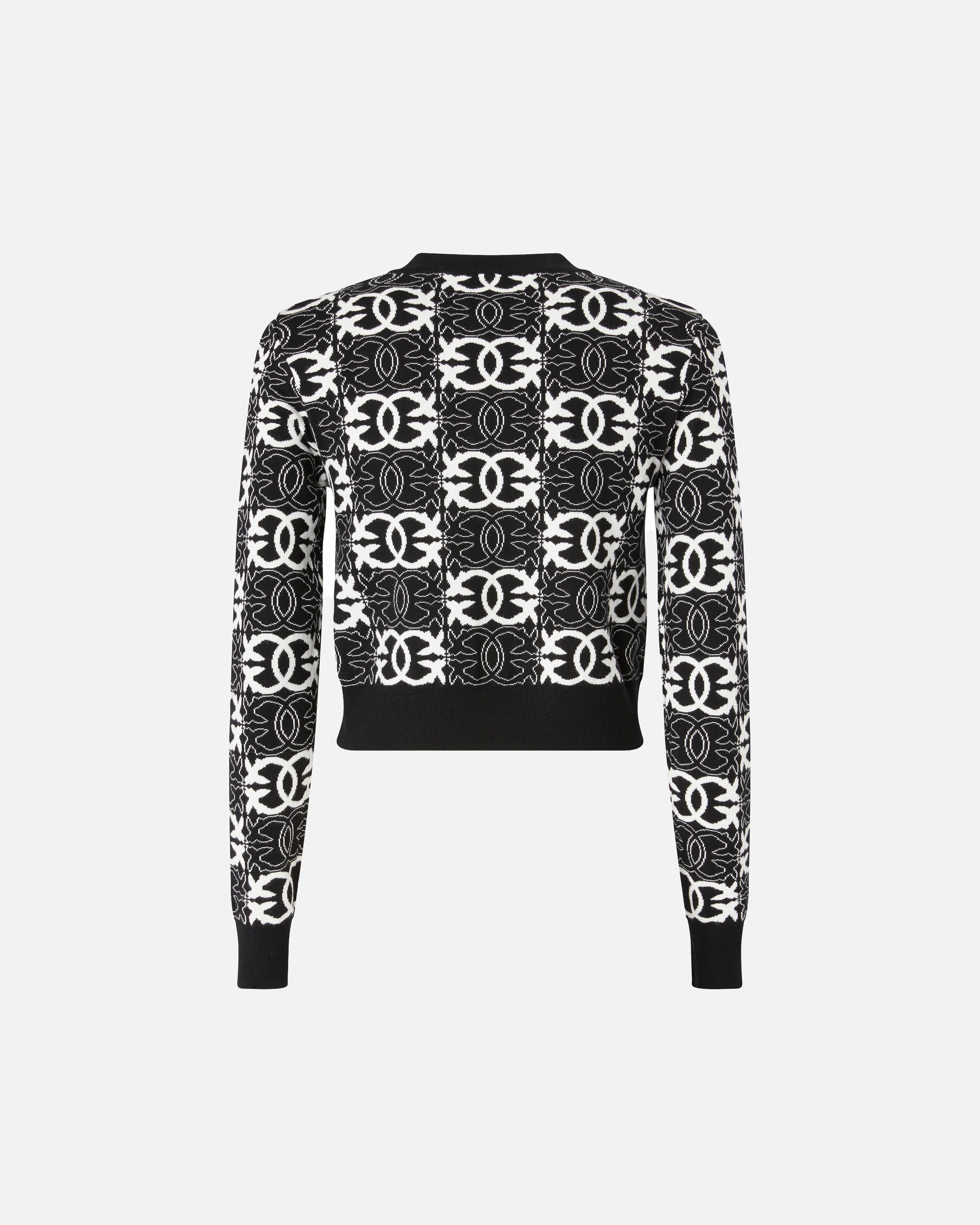 Cropped-Pullover mit warmer, weicher Haptik und langen Ärmeln mit Ärmelbündchen, Knopfleiste und kontrastierendem Ausschnitt in Rippstrick. Das Allover-Muster mit dem Logo Love Birds in Jacquard-Verarbeitung ist ein markantes Element, das das Modell abrundet. Kombinieren Sie dieses vielseitige Accessoire mit einer Jeans für ein lässiges Outfit, das nichts dem Zufall überlässt. Das Kleidungsstück wurde Veredelungsprüfungen unterzogen, um die mögliche Bildung von Pilling zu minimieren und ein weicheres und haltbareres Gewebe zu gewährleisten.