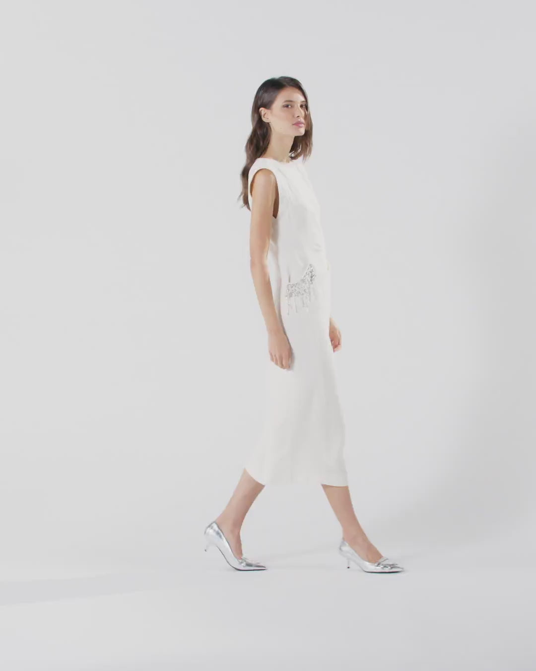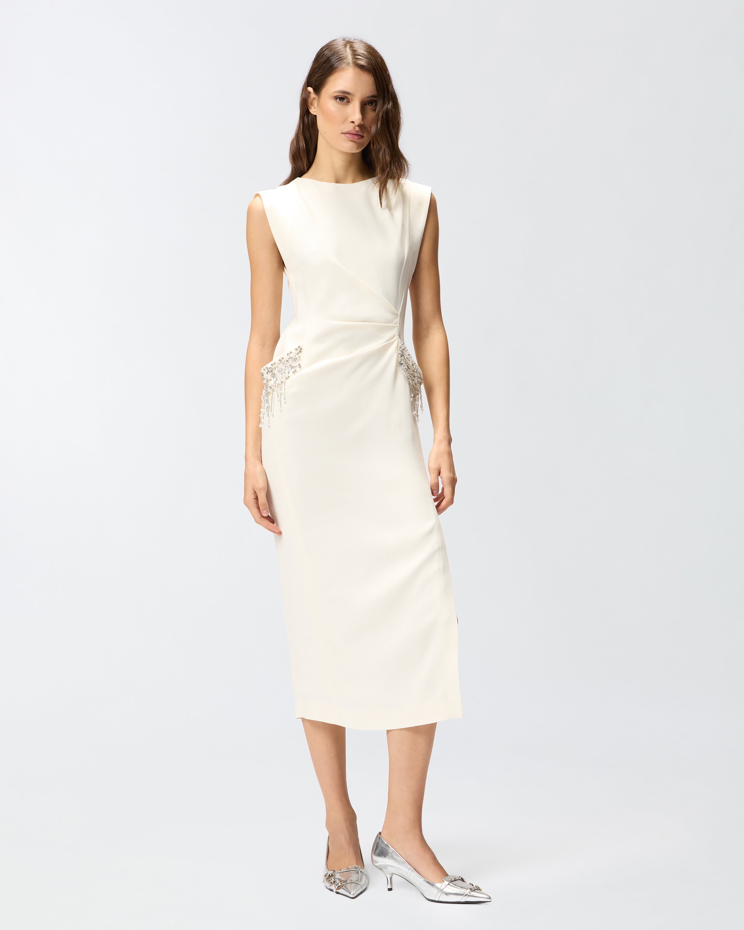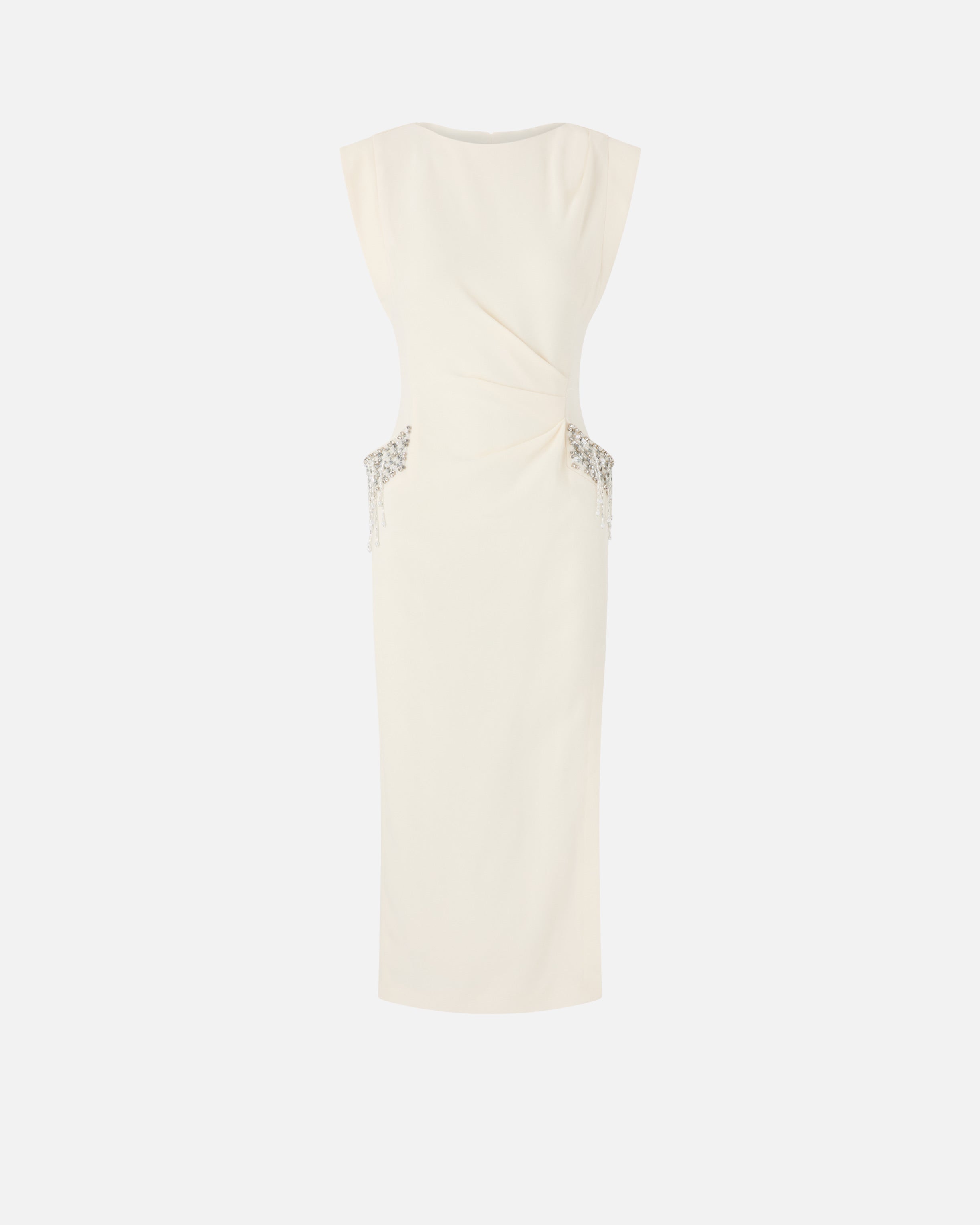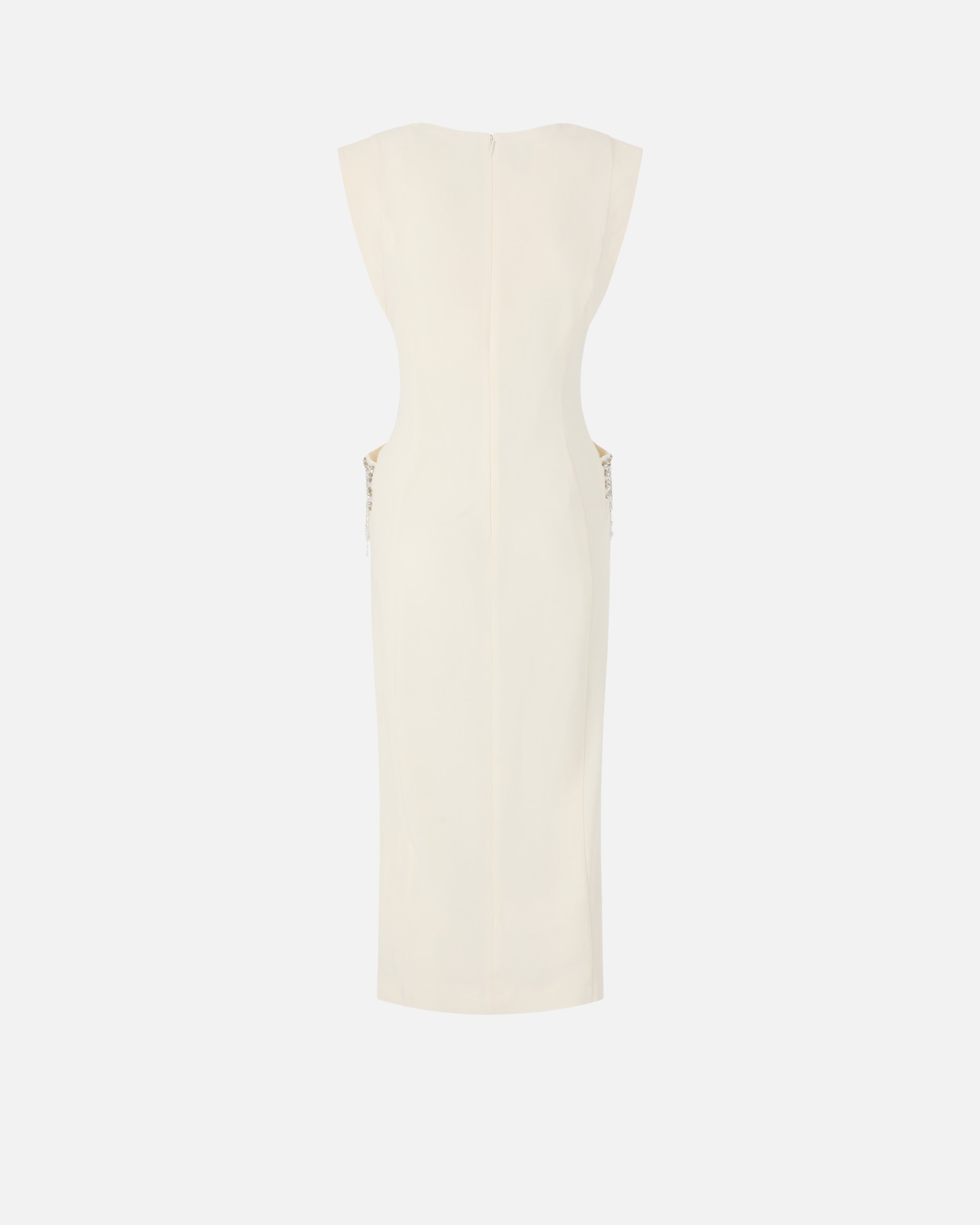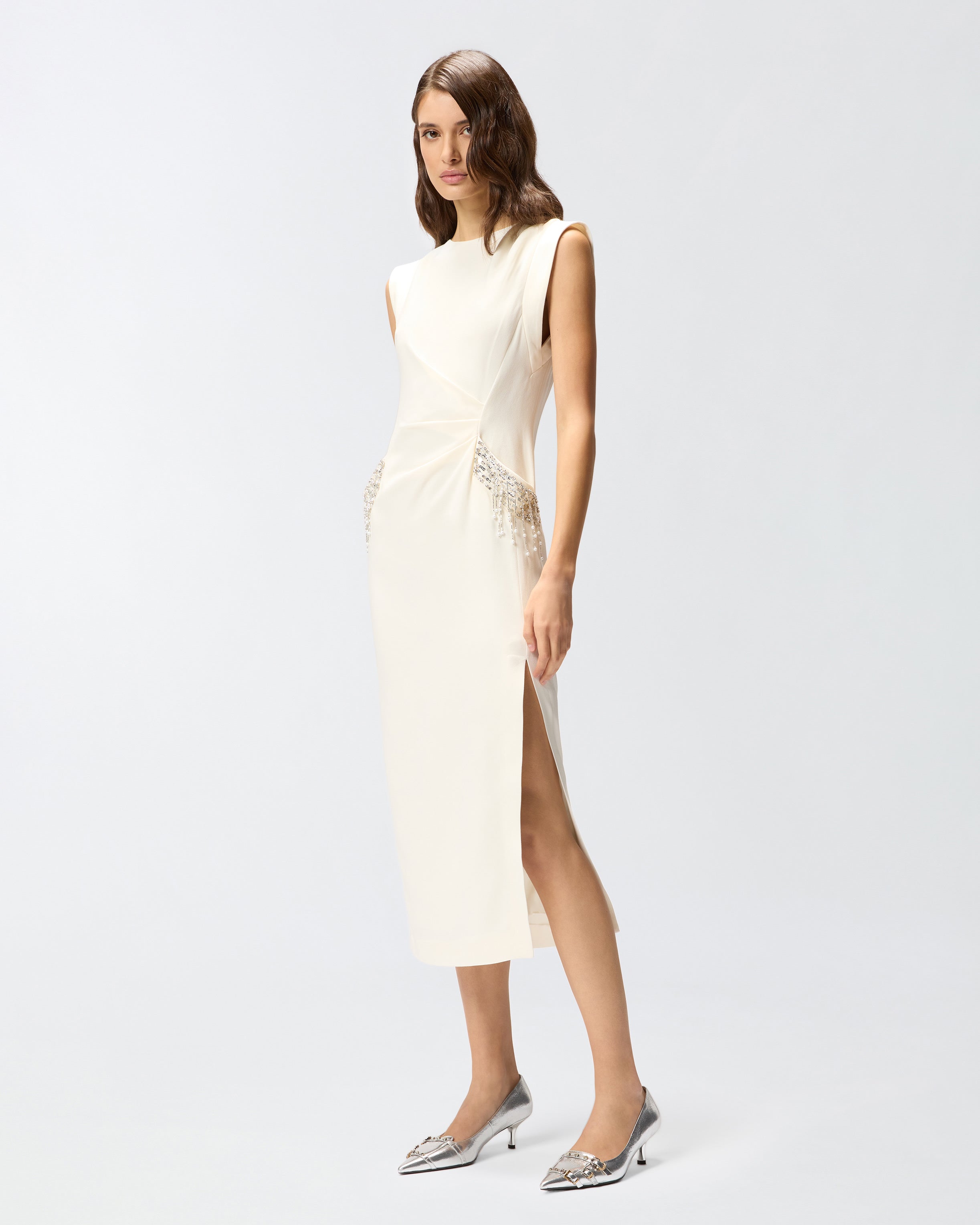 Sleeveless fitted midi dress with a slightly boat neckline, made of stretch viscose fabric, which translates into an optimal fit. The material is designed to adhere perfectly to the lines of the body, enhancing the silhouette in a natural and defined way. The micro crystal embroidery on the sides creates a contrast of lights that enhances the texture of the fabric and gives movement to the look, without losing a structured and feminine final effect. Invisible zip closure on the back.