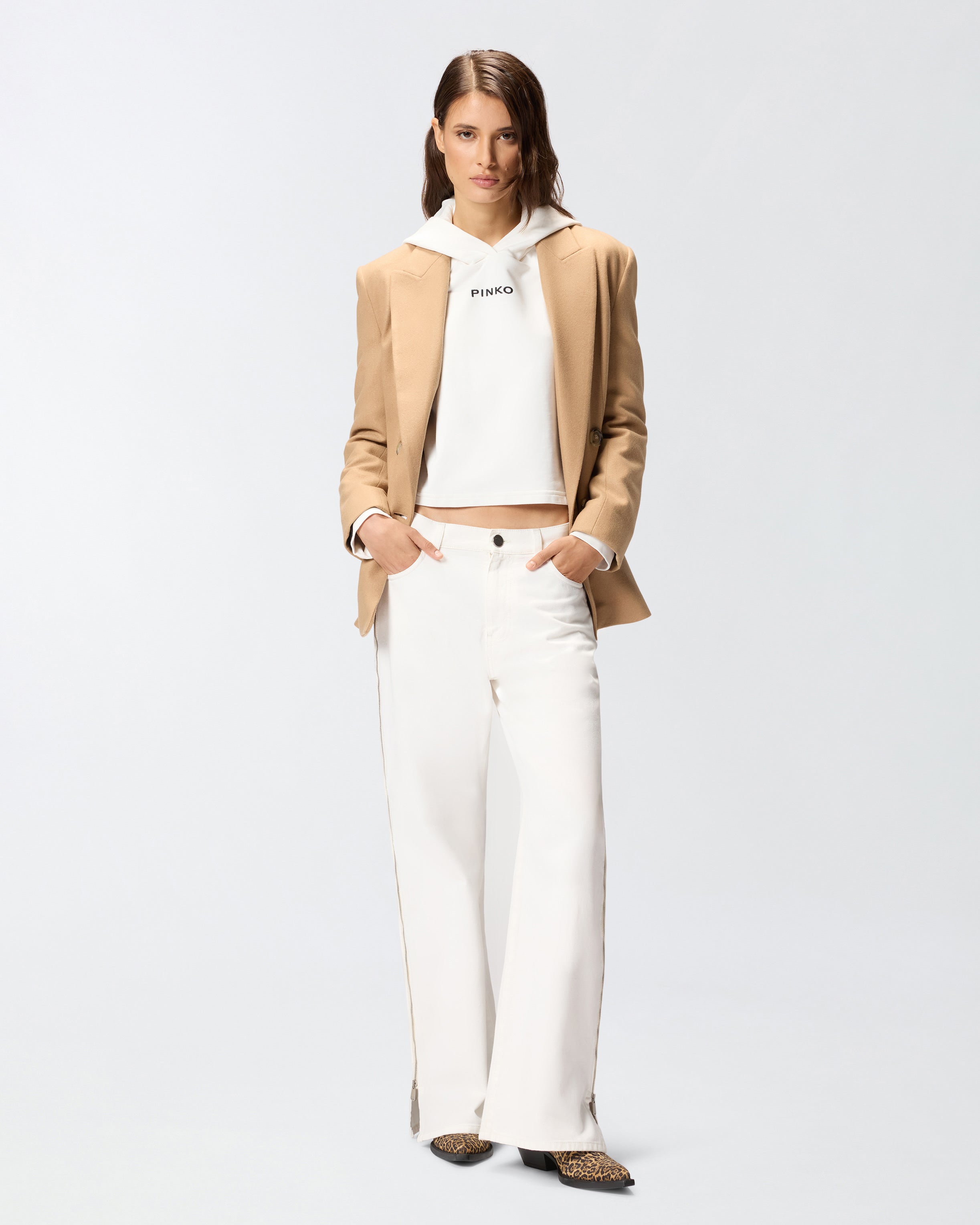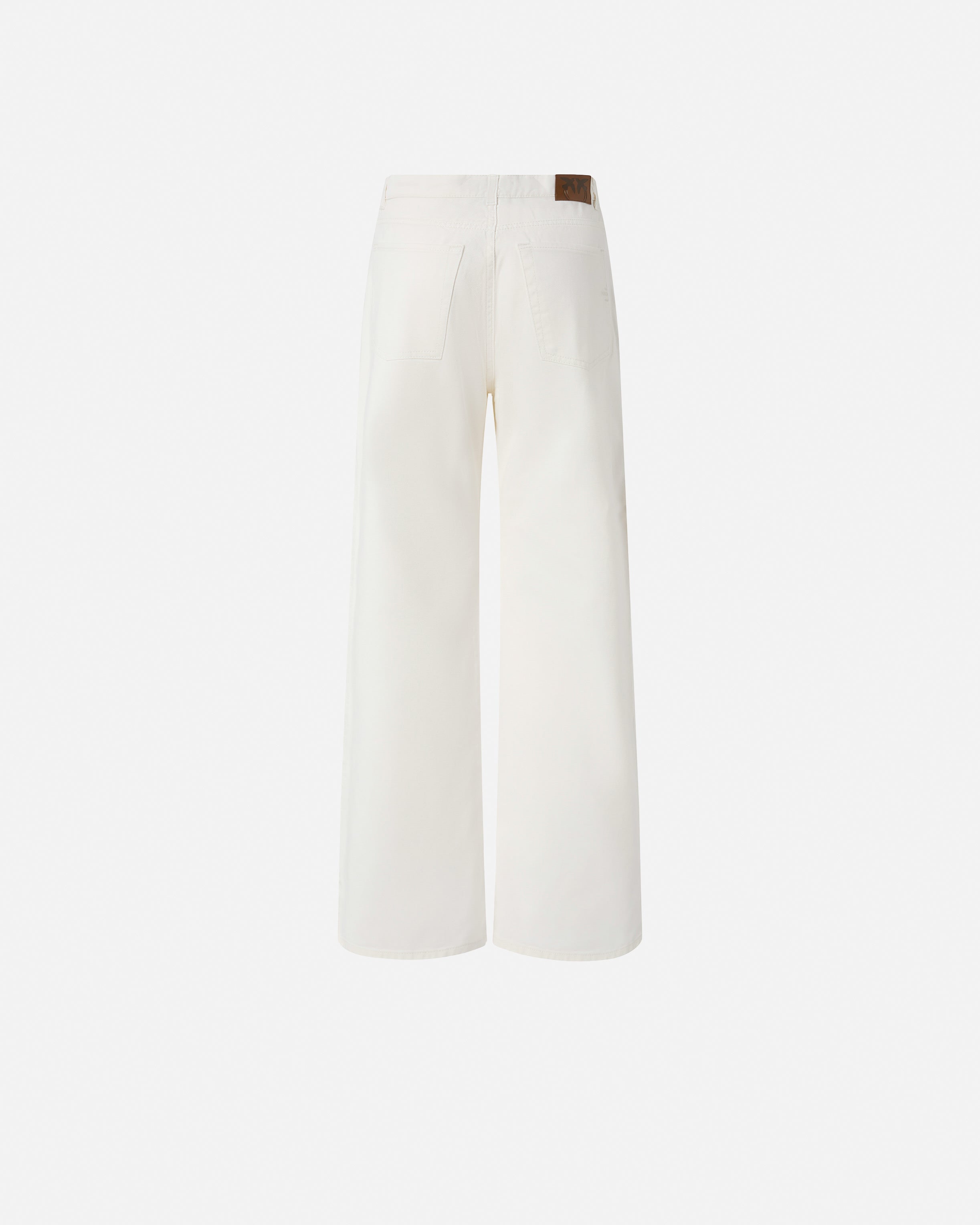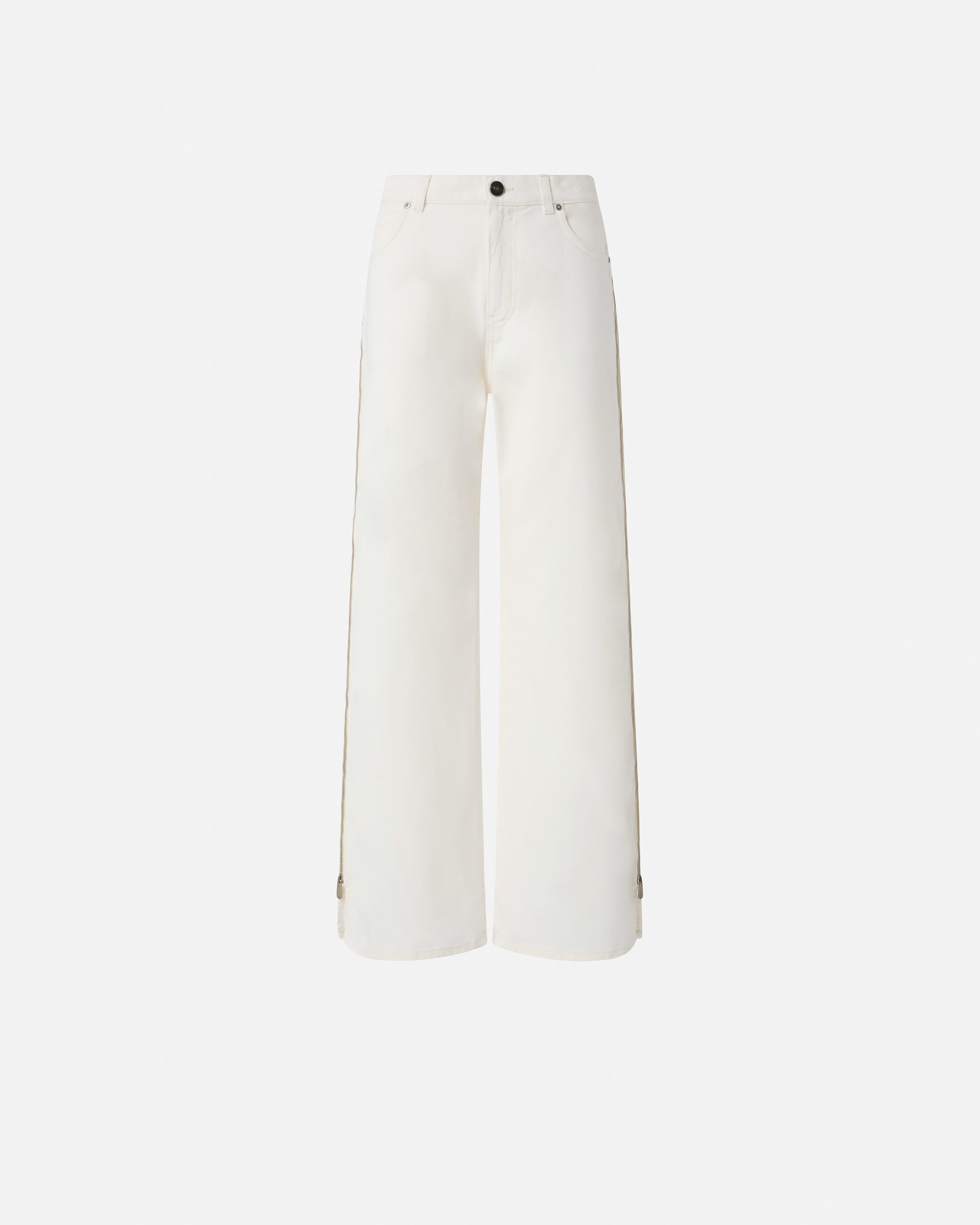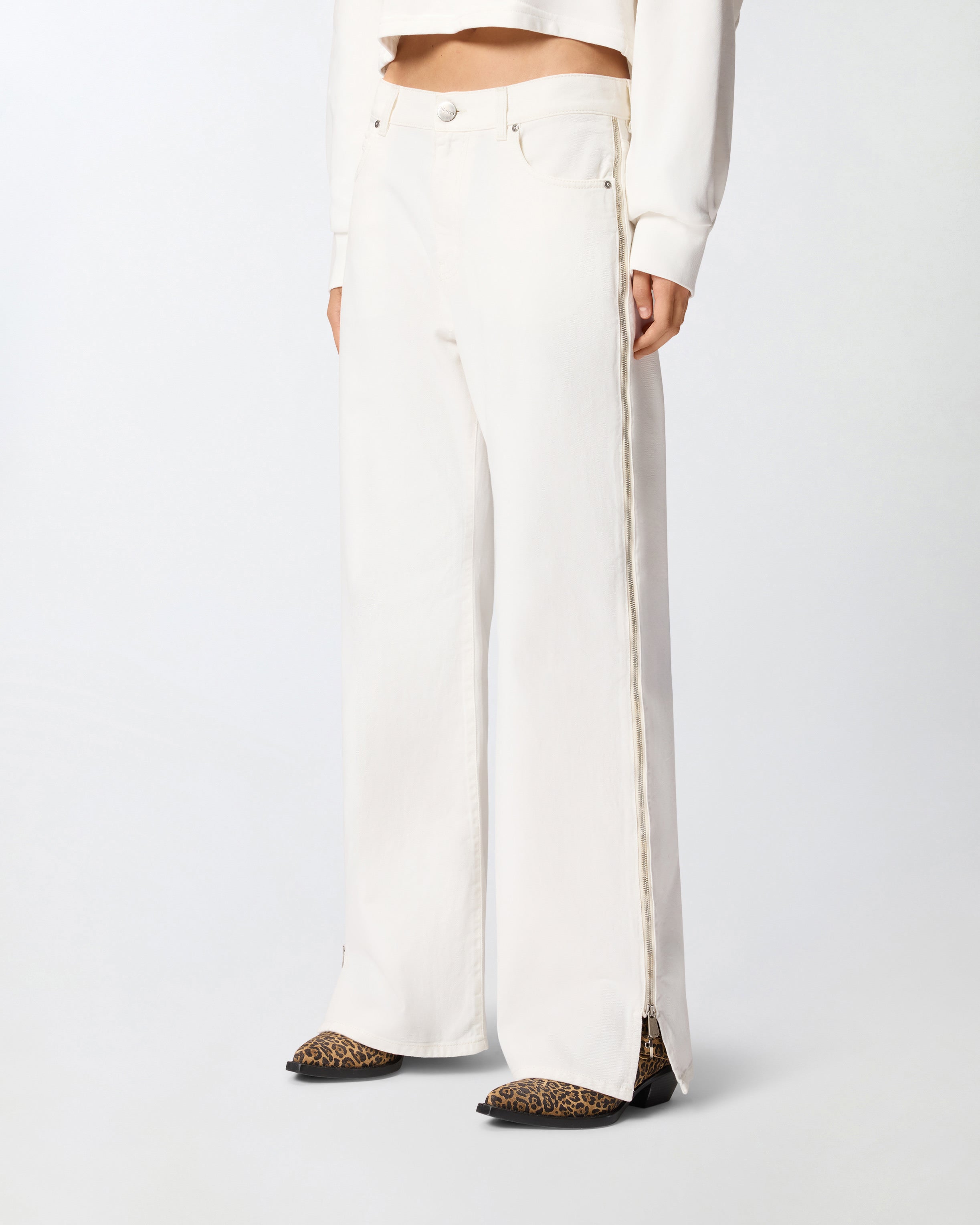 Jeans für Damen aus Bull Denim in weißer Baumwolle mit Wide-Leg-Silhouette, bei der sich das gerade und weite Bein durch einen seitlichen Metallreißverschluss auszeichnet, der über die gesamte Länge des Beins vertikal verläuft. Der Reißverschluss ermöglicht es Ihnen, diese Hose mit niedriger Taille sowohl vollständig geschlossen als auch offen zu tragen, so dass Sie einen Blick auf die mit Spitze umrandete Culotte zulassen, die den Effekt einer von Dessous inspirierten Shorts simuliert. Die Personalisierung besteht aus einer Plakette mit heißgeprägtem Logo Love Birds auf der Rückseite. Diese besondere Jeans ermöglicht es Ihnen, Ihren Stil mit einer kühnen Geste zu personalisieren, wann immer Sie möchten. Niedriger Bund mit Gürtelschlaufen, Reißverschluss und Nietenknopf aus Metall. Das Modell ist etwas weiter als die übliche Größe.