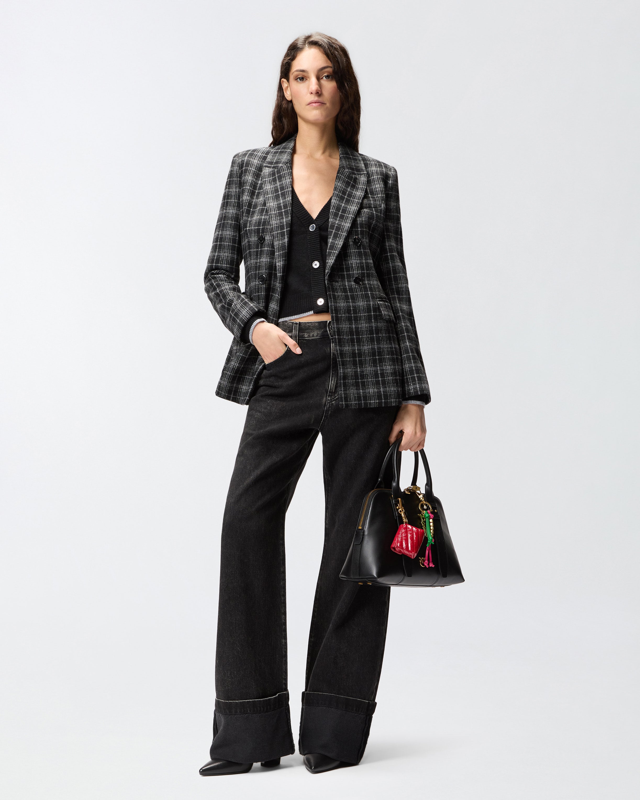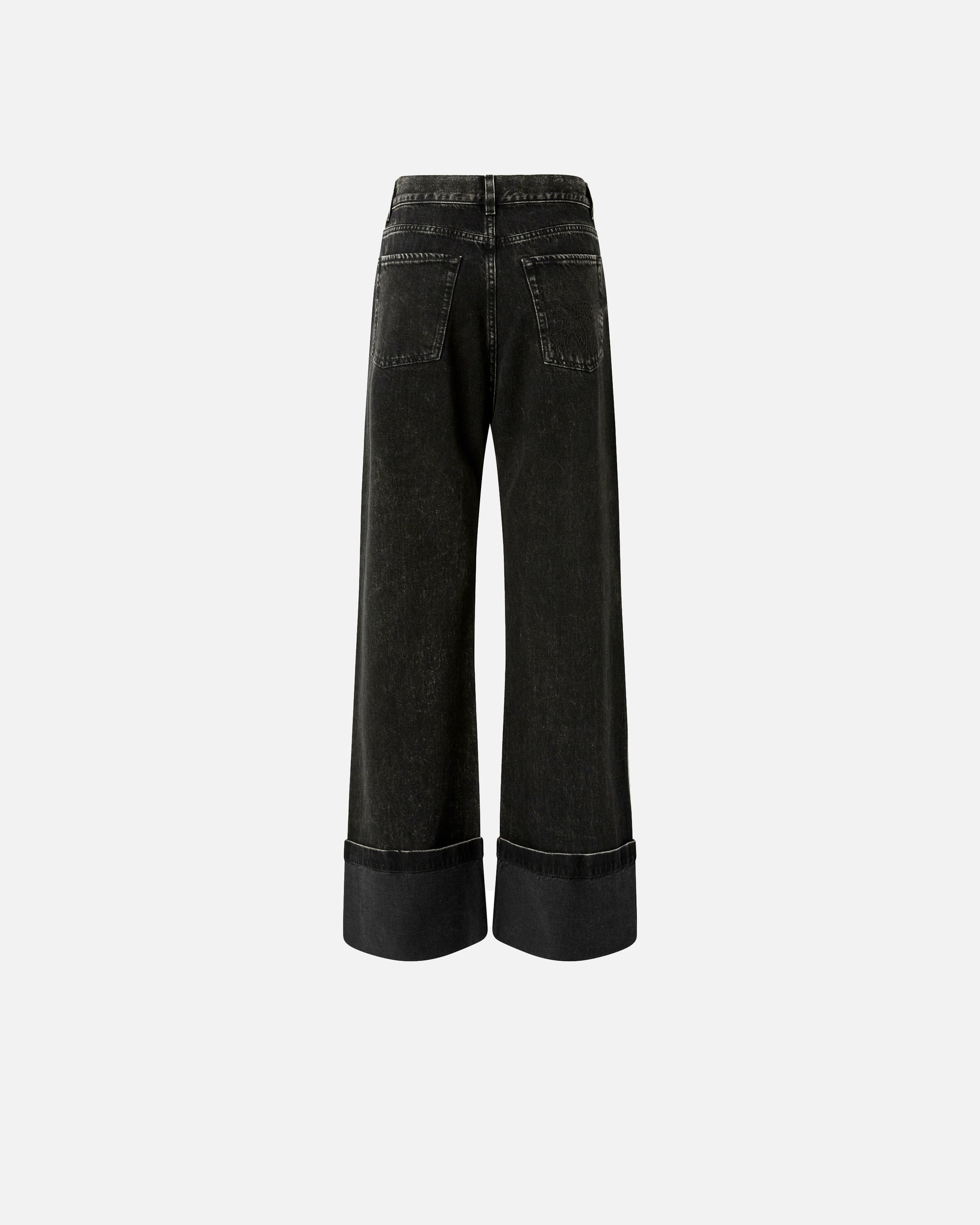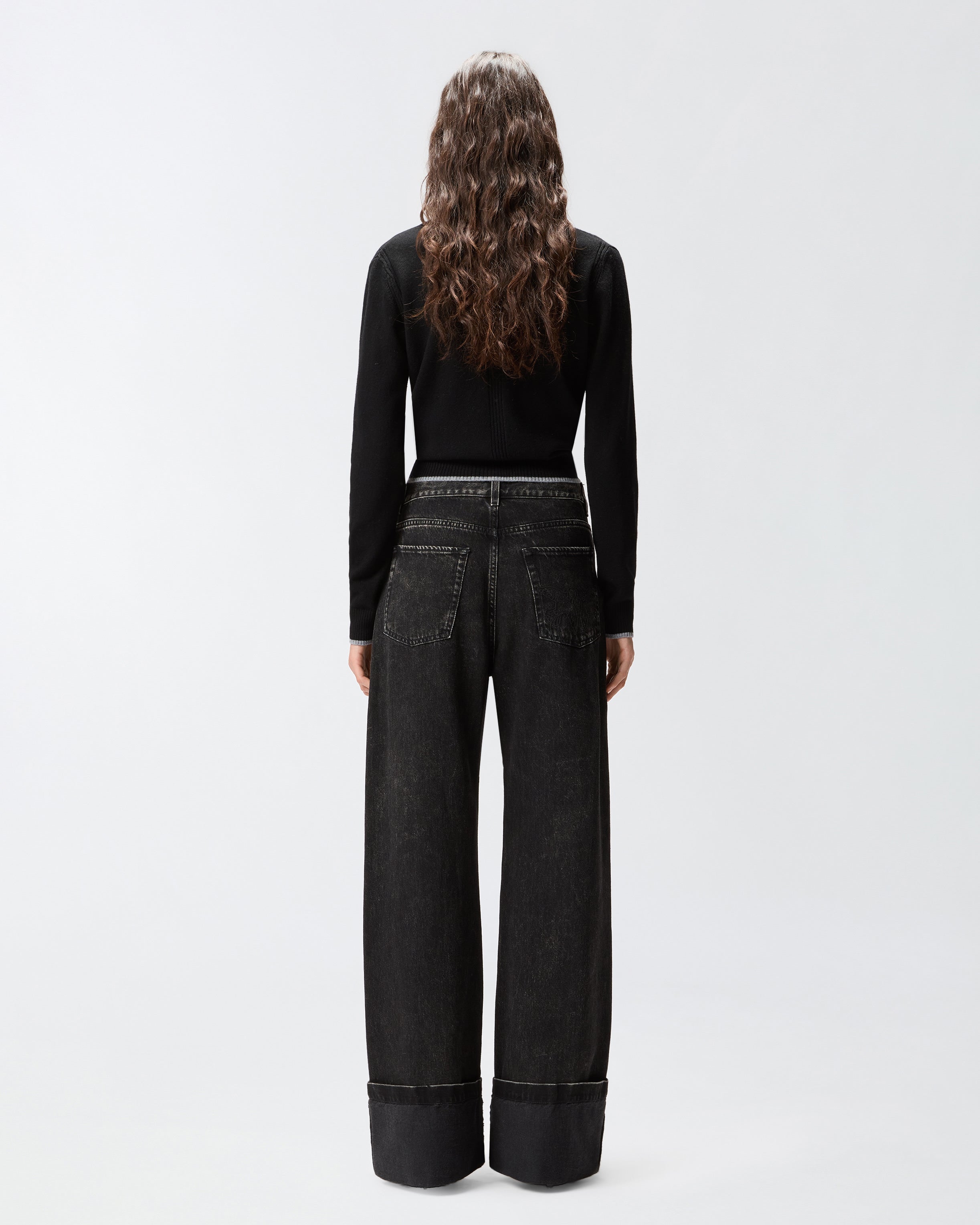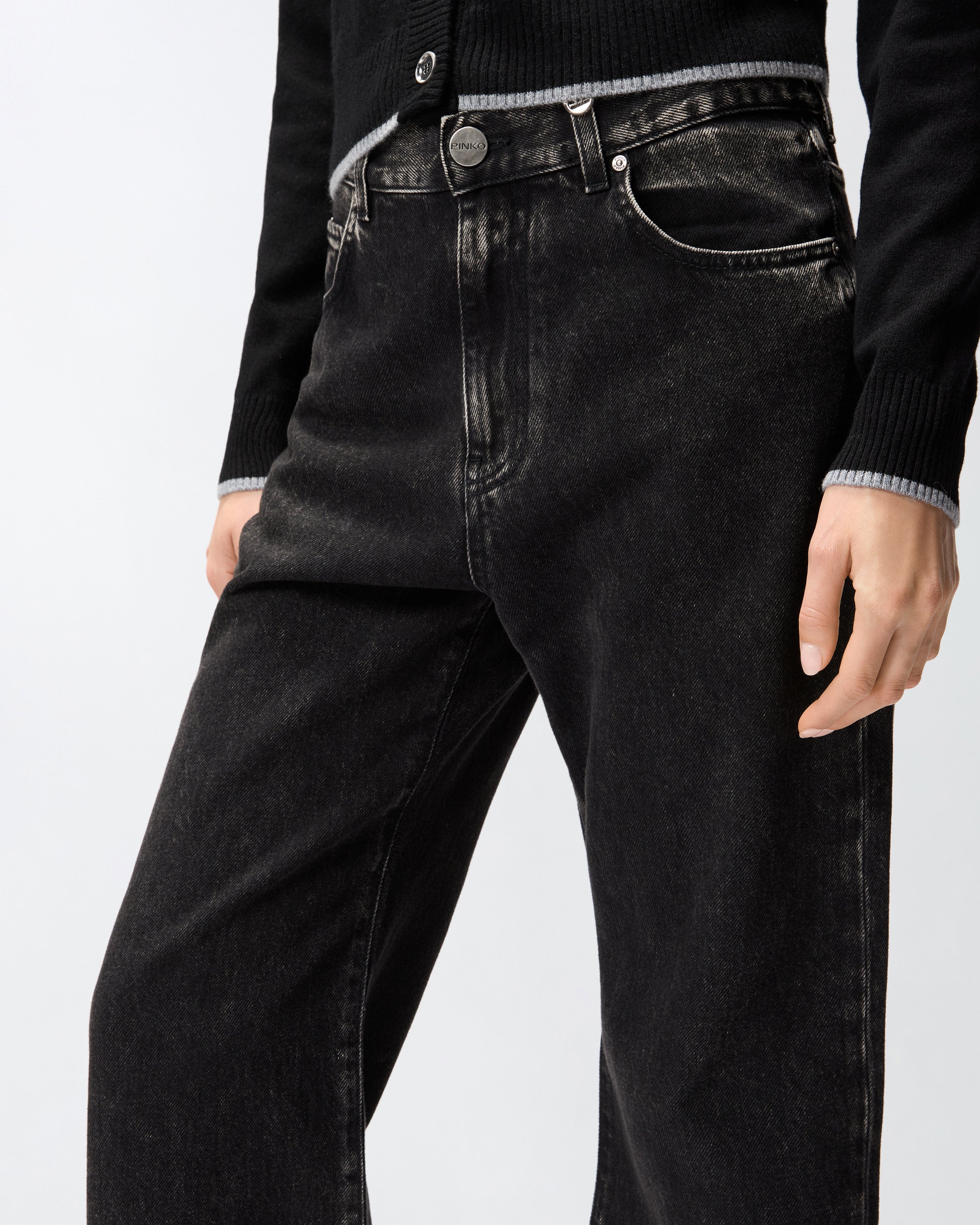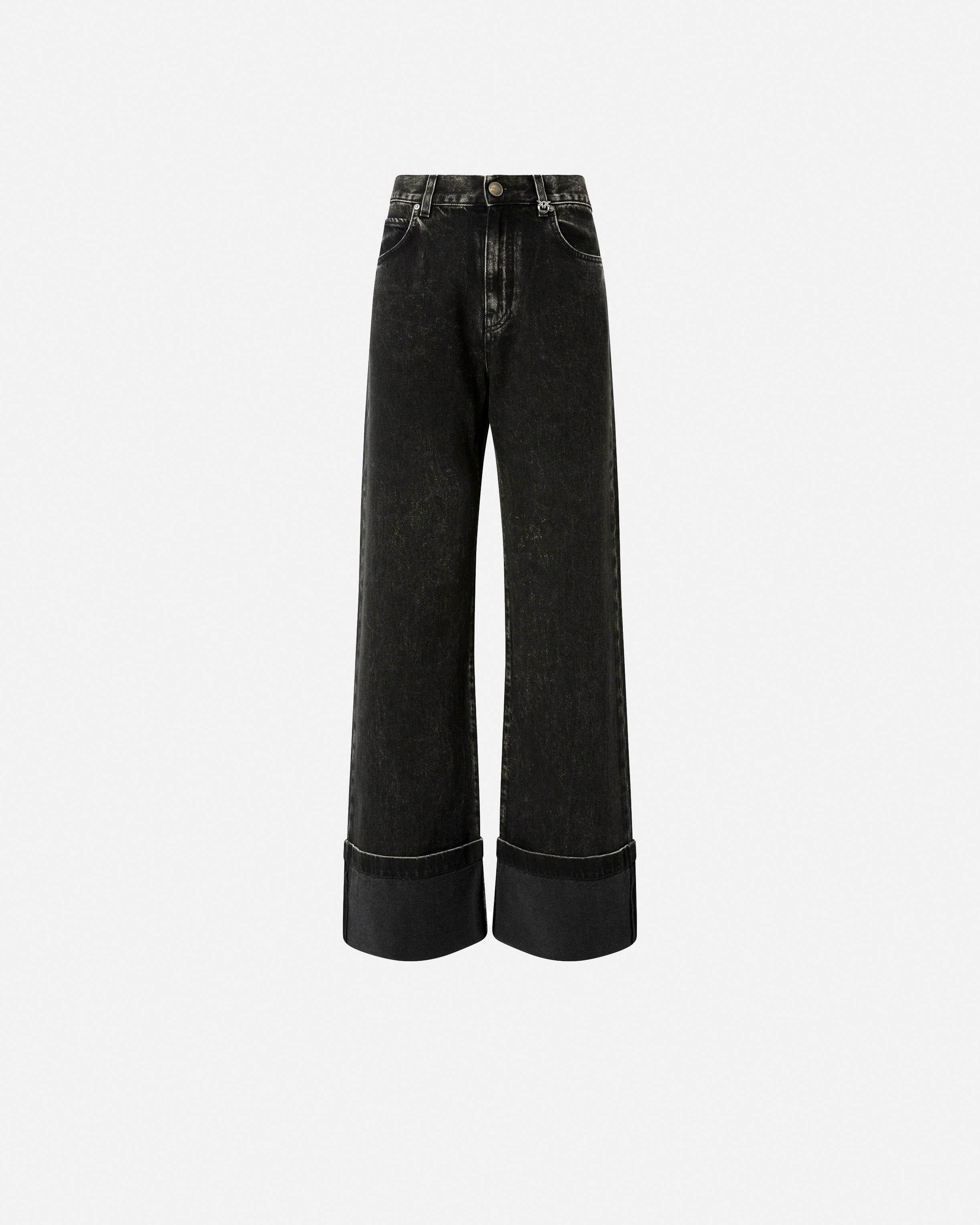 Five-Pocket-Jeans für Damen mit Wide-Leg-Silhouette mit geradem, weitem Bein und fixiertem, umgeschlagenem Saum. Das Kleidungsstück besteht aus schwarzem Denim in Baumwolle und Lyocell für eine fließendere Haptik und wird mit verschiedenen Waschungen behandelt, um den endgültigen Farbton zu erreichen. Um das Design im reinen Stil von PINKO zu personalisieren, finden wir die abnehmbare Schlaufe mit Logo Love Birds. Spielen Sie mit Kombinationen und tragen Sie diese Jeans mit tiefer Taille und niedrigem Schritt für einen maskulineren Look oder kombinieren Sie sie mit feminineren Kleidungsstücken für einen Stil, der auf Kontraste setzt. Gürtelschlaufen und Verschluss vorne mit Knopf und verdecktem Reißverschluss. Das Modell ist etwas weiter als die übliche Größe.
