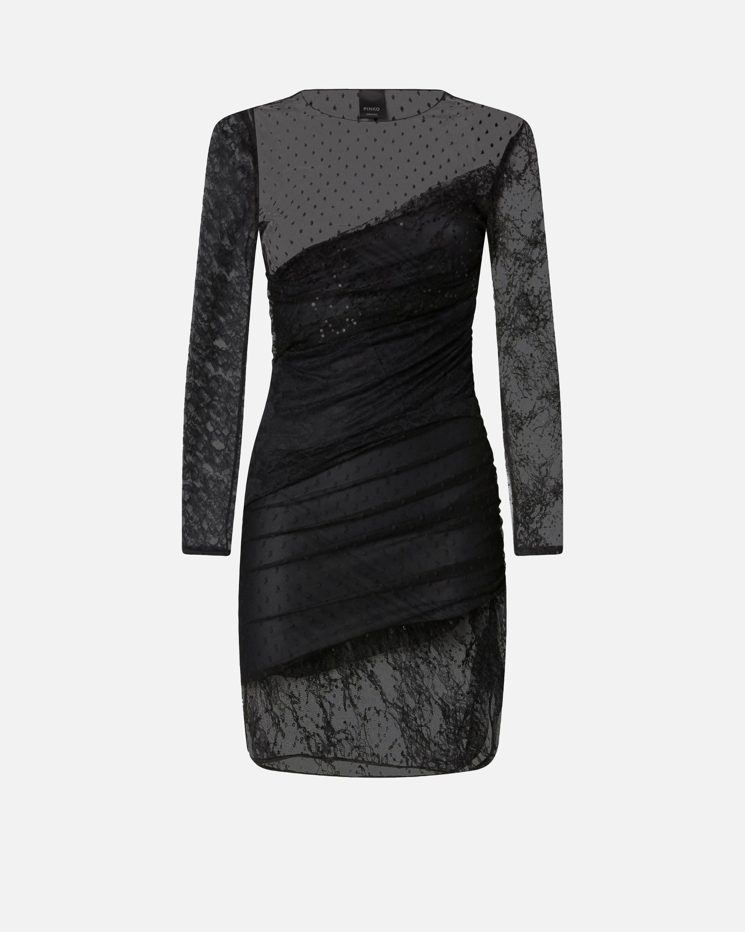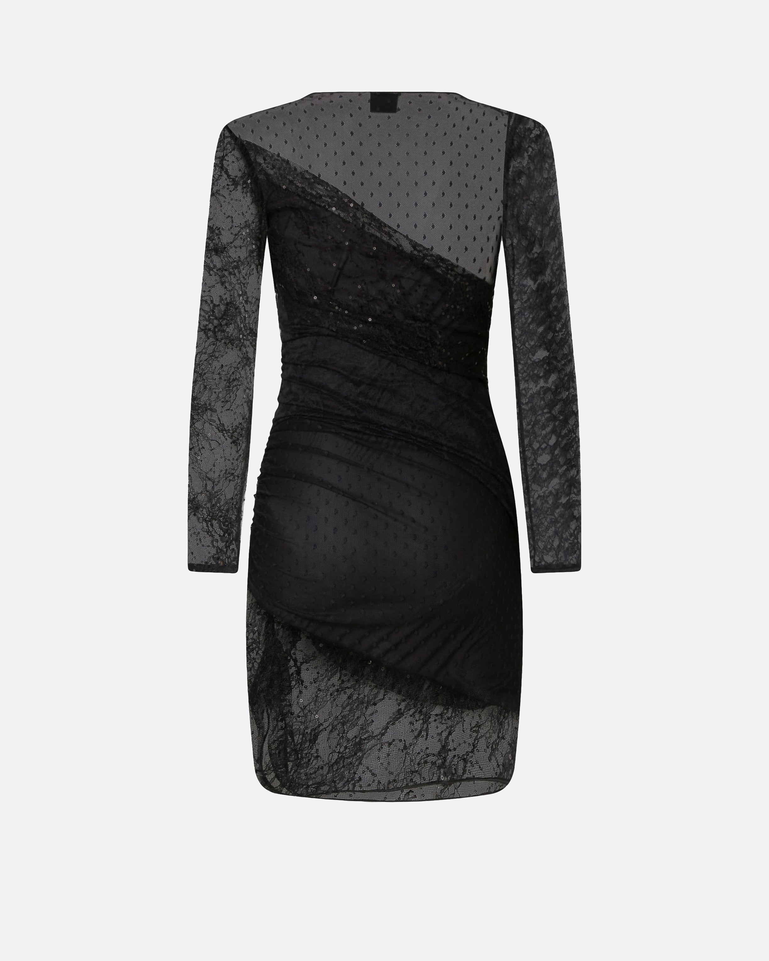 Kurzes, eng anliegendes Kleid aus Spitze in einem außergewöhnlichen Patchwork-Design, das verschiedene Muster miteinander kombiniert. Der Stoff betont die Passform des Kleidungsstücks und garantiert gleichzeitig Komfort und ein perfektes Anpassen an die Figur. Das Design besteht aus drei verschiedenen Spitzenmustern, die jeweils ausgewählt wurden, um ein Spiel aus visuellen Kontrasten zu schaffen, und es zeichnet sich insbesondere durch eine Paillettenstickerei aus. Darüber hinaus schaffen die strategisch angeordneten Drapierungen, die die Silhouette umhüllen, sinnliche Transparenz und betonen die Formen mit einem dynamischen und fließenden Effekt. Erstrahlen Sie bei Ihren besonderen Anlässen und festlichen Abenden mit diesem Abendkleid, das Ihrer Weiblichkeit einen einzigartigen Wert verleiht, insbesondere in Kombination mit einem Paar Pumps mit hohem Absatz.