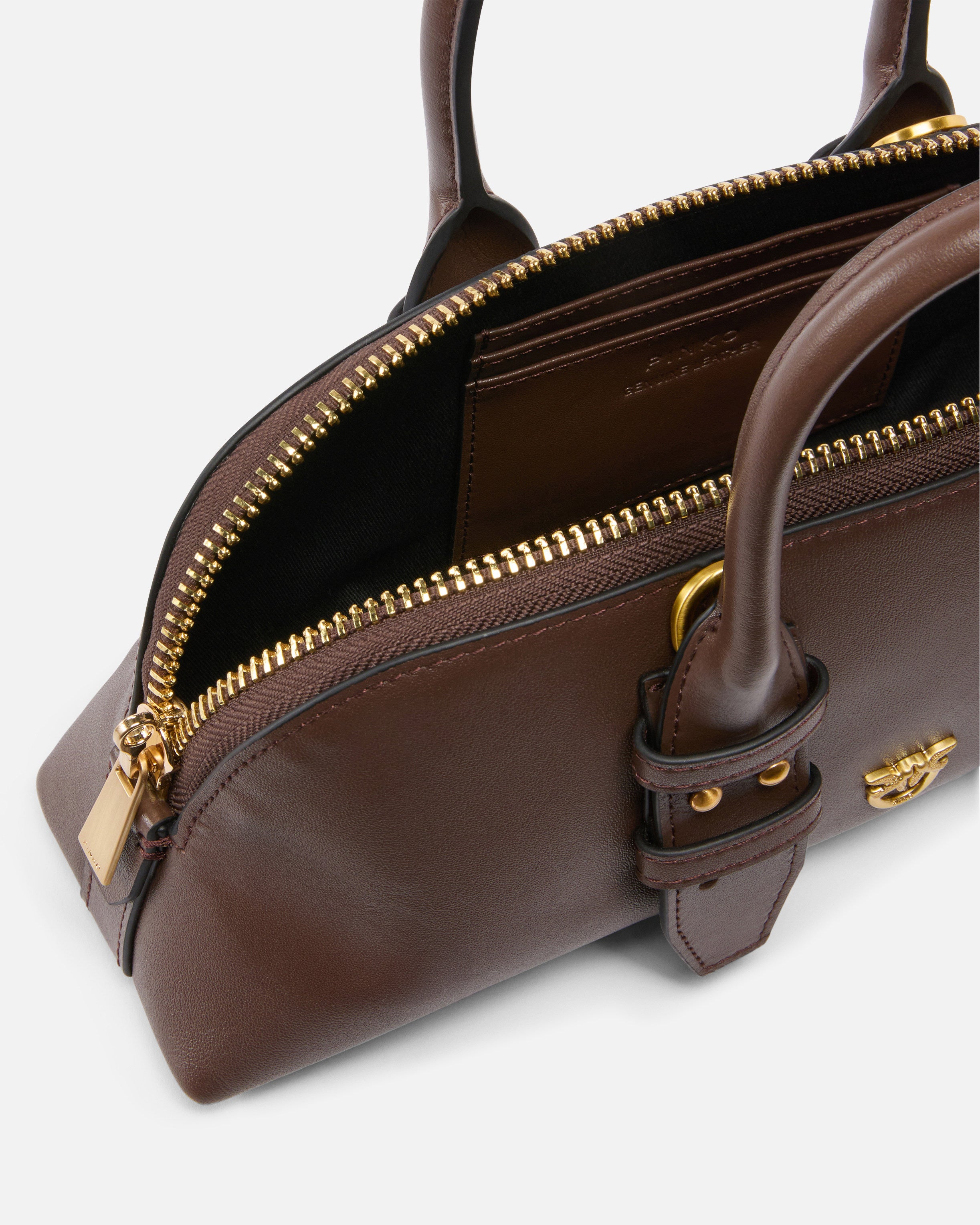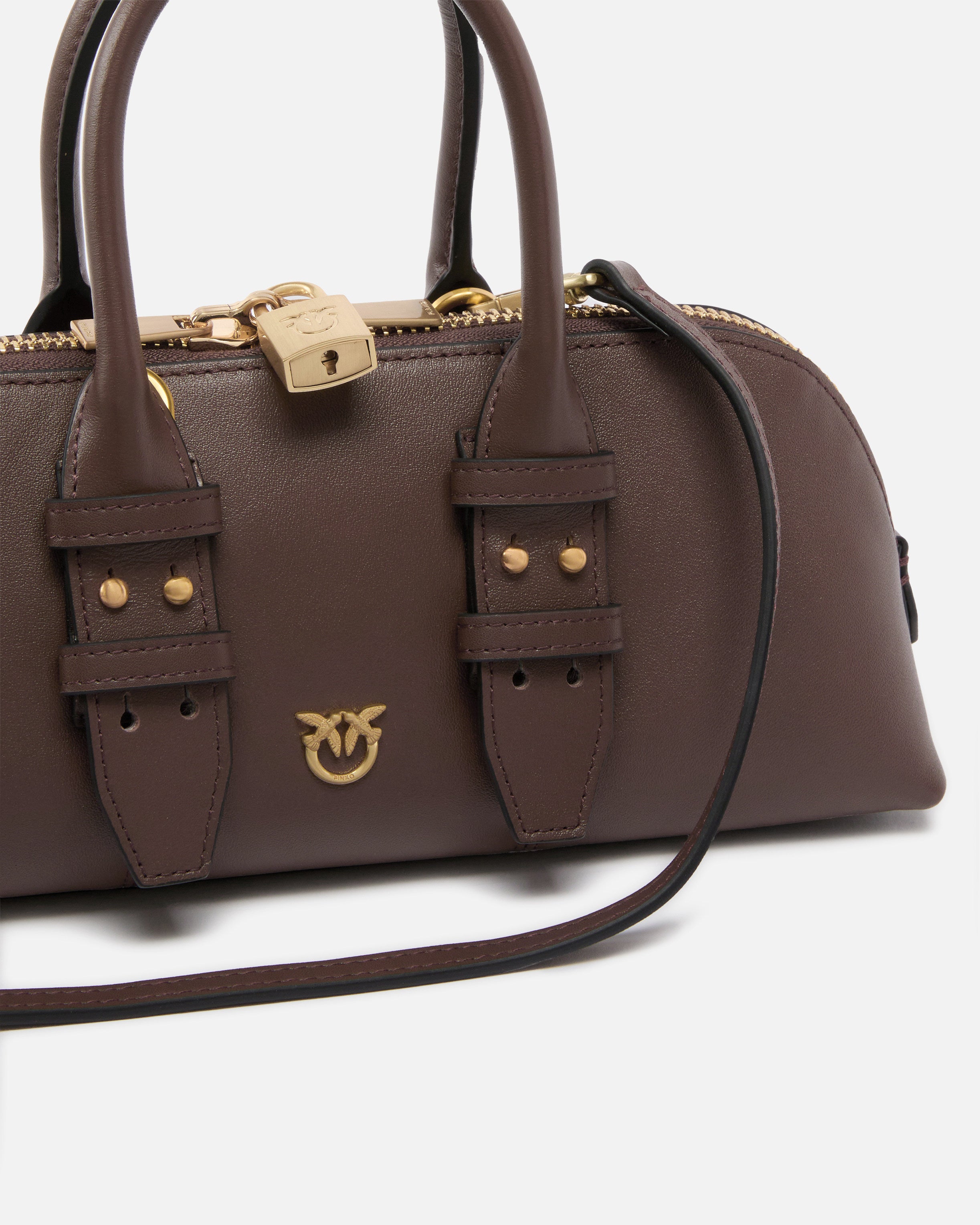 Kleine Bowlingtasche Escape Bag Bag aus weichem Leder mit Innenfutter aus und einer Seitentasche mit Kartenhalter. Dank des verstellbaren, abnehmbaren Schulterriemens aus Leder und des Henkels zum Tragen in der Hand oder über der Schulter ist die Tasche äußerst vielseitig und praktisch. Der obere Verschluss mit Reißverschluss samt doppeltem Schiebergriff ist mit einem neuen Detail personalisiert: ein Vorhängeschloss mit dem ikonischen Logo Love Birds, das dank des Schlüssels im Charm aus Leder, der die Tasche vervollständigt, geöffnet und geschlossen werden kann. Aktivieren Sie Ihre PINKO-Tasche: Halten Sie Ihr Smartphone an die Love-Birds-Stickerei auf der Rückseite der Tasche, um die Echtheit Ihres Produkts zu überprüfen und um ein personalisiertes Erlebnis zu genießen!