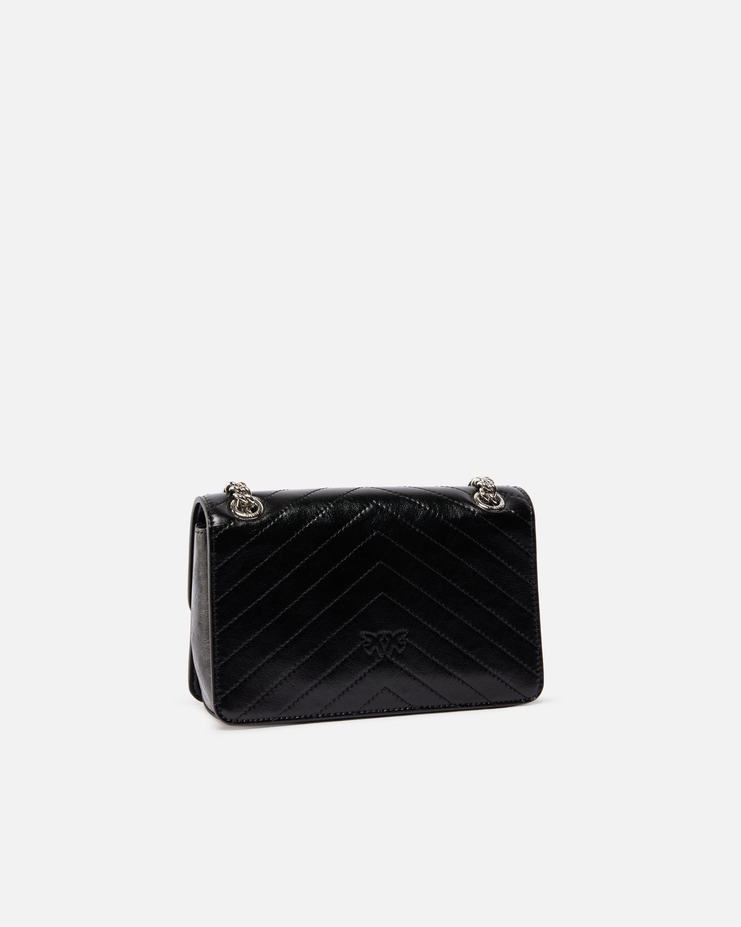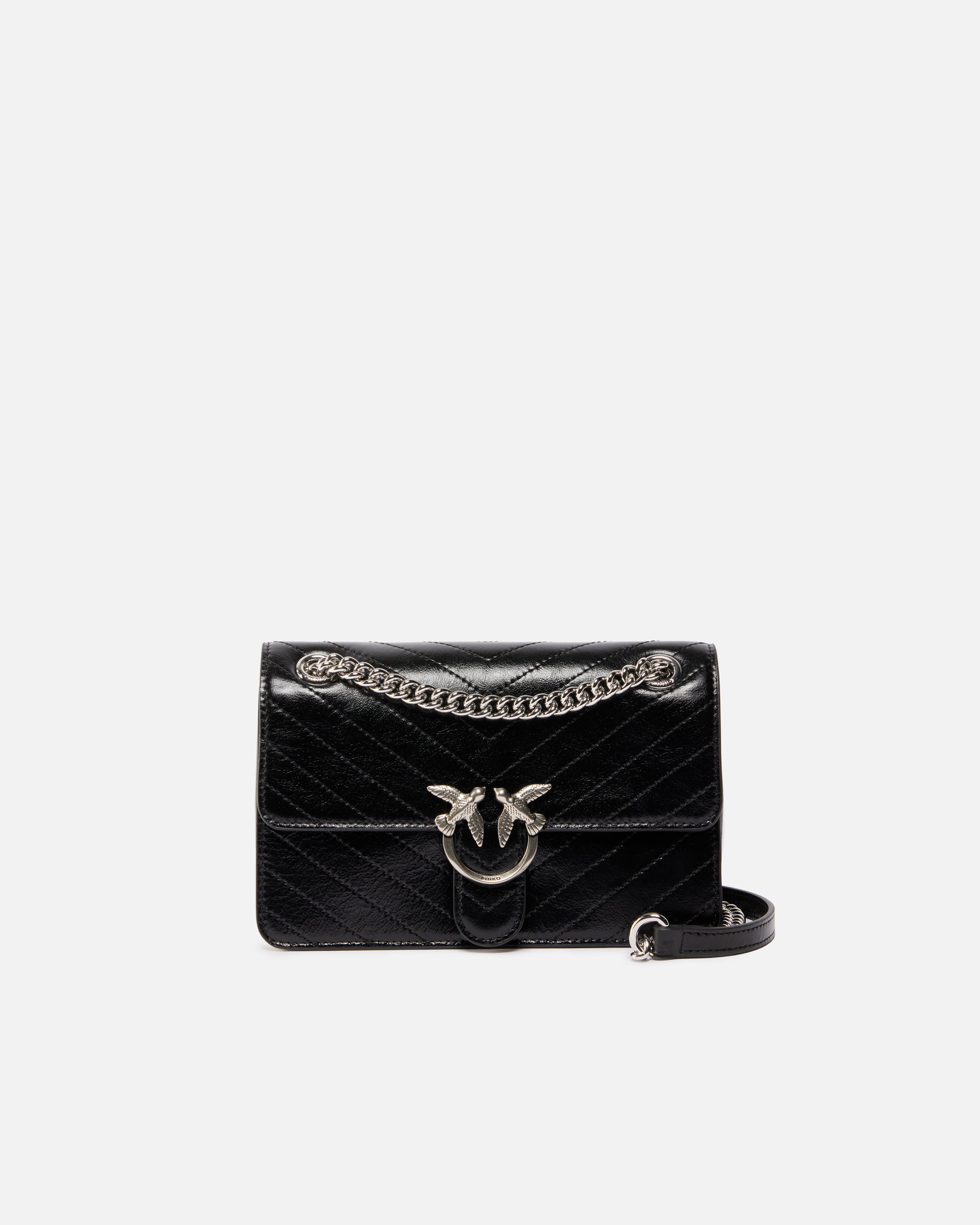 Kleine Mini Love Bag One Light mit leichter Struktur aus Leder mit Wrinkle-Textur, mit einem Chevron-Muster verziert. Das Modell verfügt über einen Schulterriemen in Form einer Kette mit runden Gliedern und ein Schulterpolster aus Leder, mit dem Sie drei verschiedene Tragemöglichkeiten erhalten: in der Hand, quer über den Körper oder über der Schulter. Das Modell ist modern und raffiniert, während die Schnalle Love Birds Diamond Cut am Verschluss mit Lasche den unnachahmlichen Stil von PINKO zum Ausdruck bringt. Das Innere der Tasche ist mit Baumwollgewebe gefüttert und hat ein Seitenfach mit Reißverschluss. Aktivieren Sie Ihre PINKO-Tasche: Halten Sie Ihr Smartphone an die Love-Birds-Stickerei auf der Rückseite der Tasche, um die Echtheit Ihres Produkts zu überprüfen und um ein personalisiertes Erlebnis zu genießen!