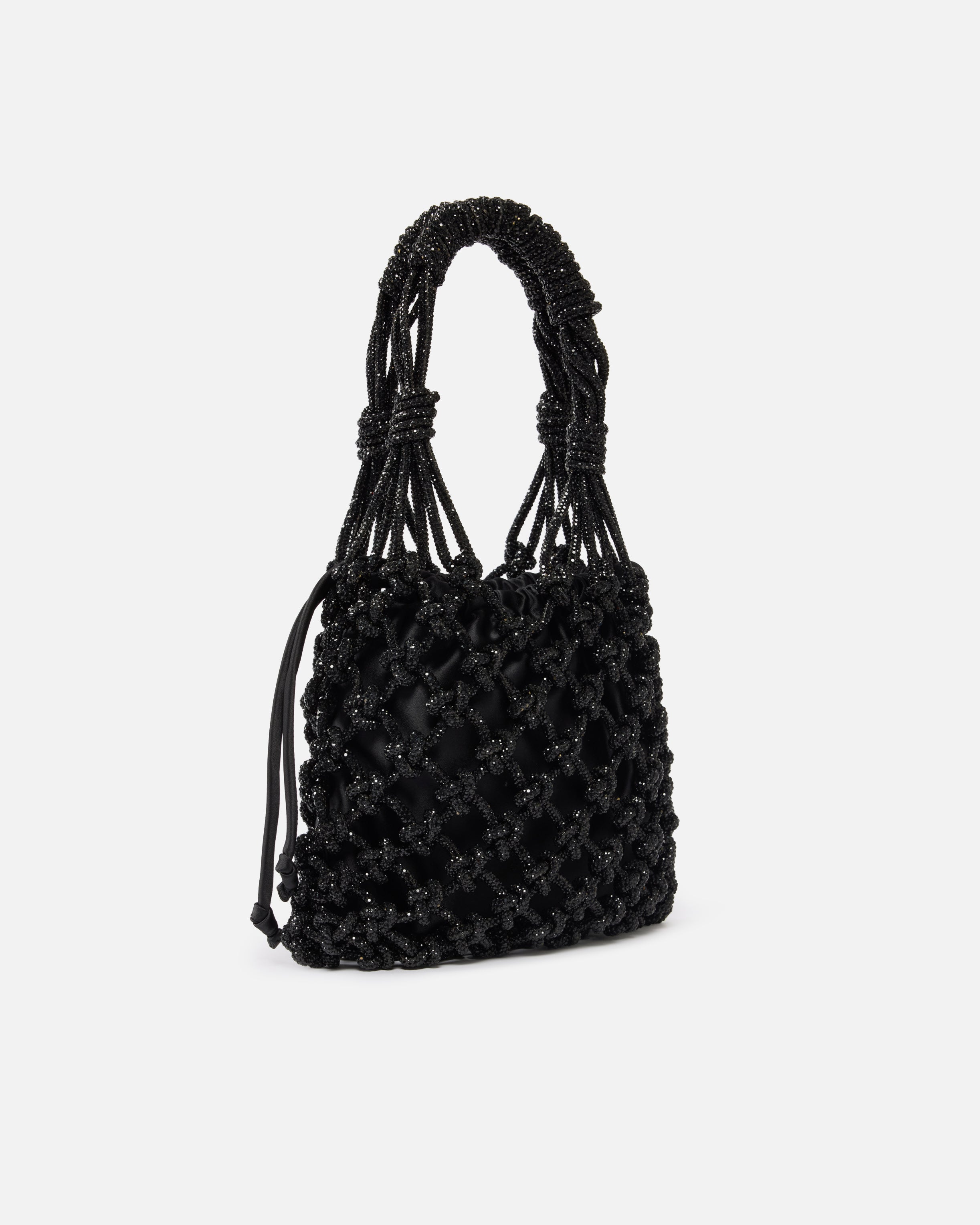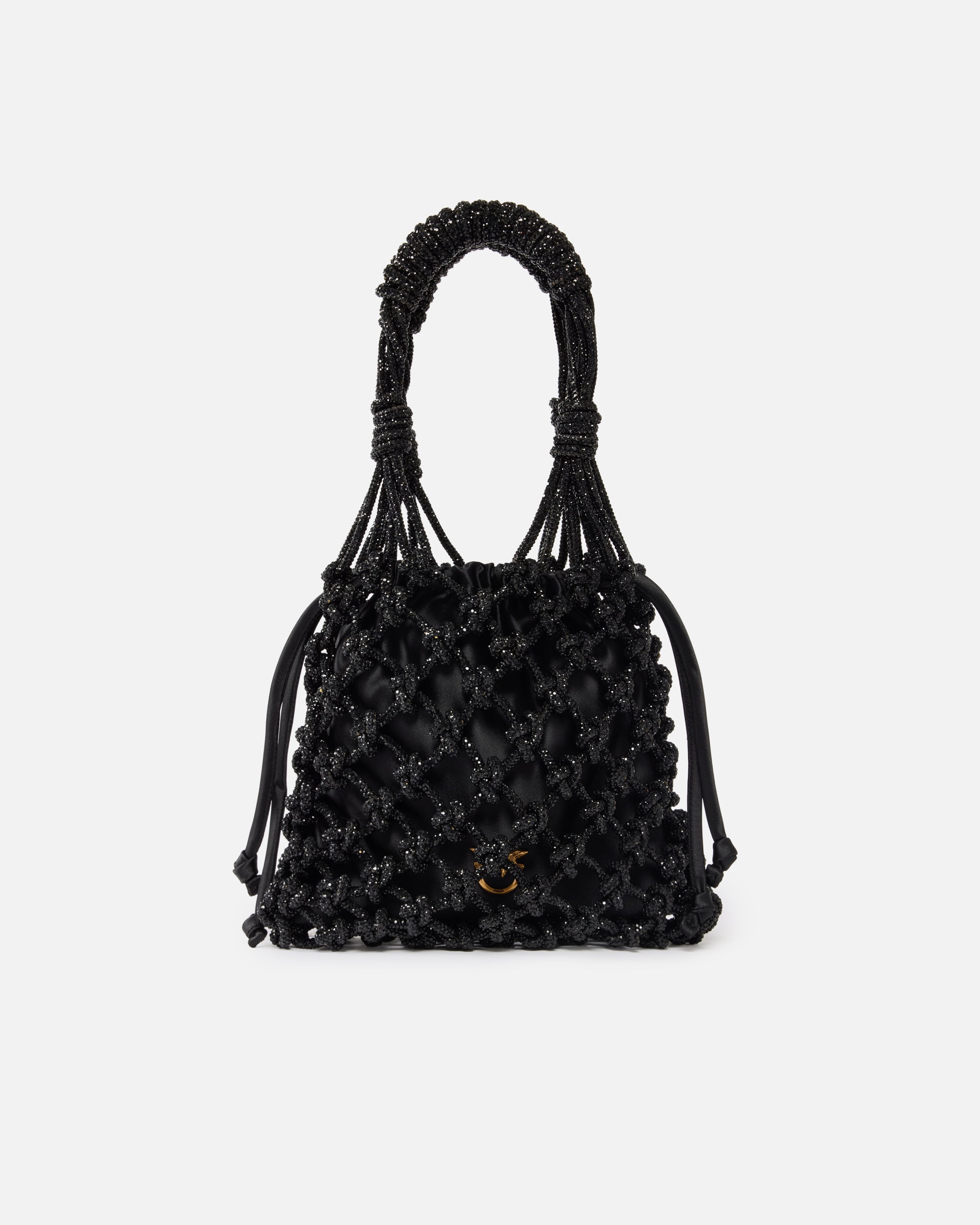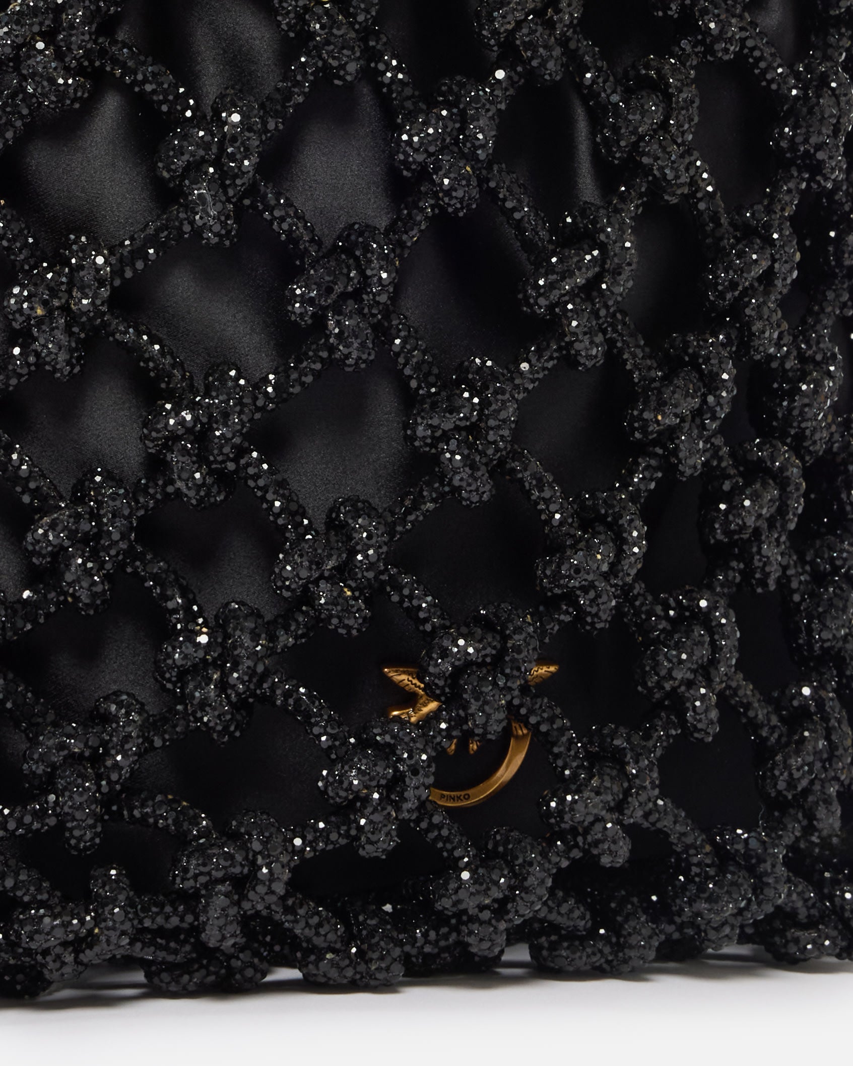 Kleine Schultertasche mit weicher Beutelsilhouette und praktischem Tunnelzugverschluss. Diese Handtasche ist perfekt, um Ihren Outfits einen Hauch von glänzender Originalität zu verleihen. Sie verfügt über einen einfarbigen Innenteil, der durch eine unverwechselbare Plakette mit dem Logo Love Birds ergänzt wird und in einer aufwendigen Netzstruktur enthalten ist, die vollständig mit Mikro-Strasssteinen bedeckt ist. Die kleinen Kristalle verleihen auch der gesamten Oberfläche der beiden oberen Griffe Glanz, die mit verdrehten Details verziert sind und dafür sorgen, dass die Tasche über der Schulter getragen werden kann. Aktivieren Sie Ihre PINKO-Tasche: Halten Sie Ihr Smartphone an die Love-Birds-Stickerei auf der Rückseite der Tasche, um die Echtheit Ihres Produkts zu überprüfen und um ein personalisiertes Erlebnis zu genießen!