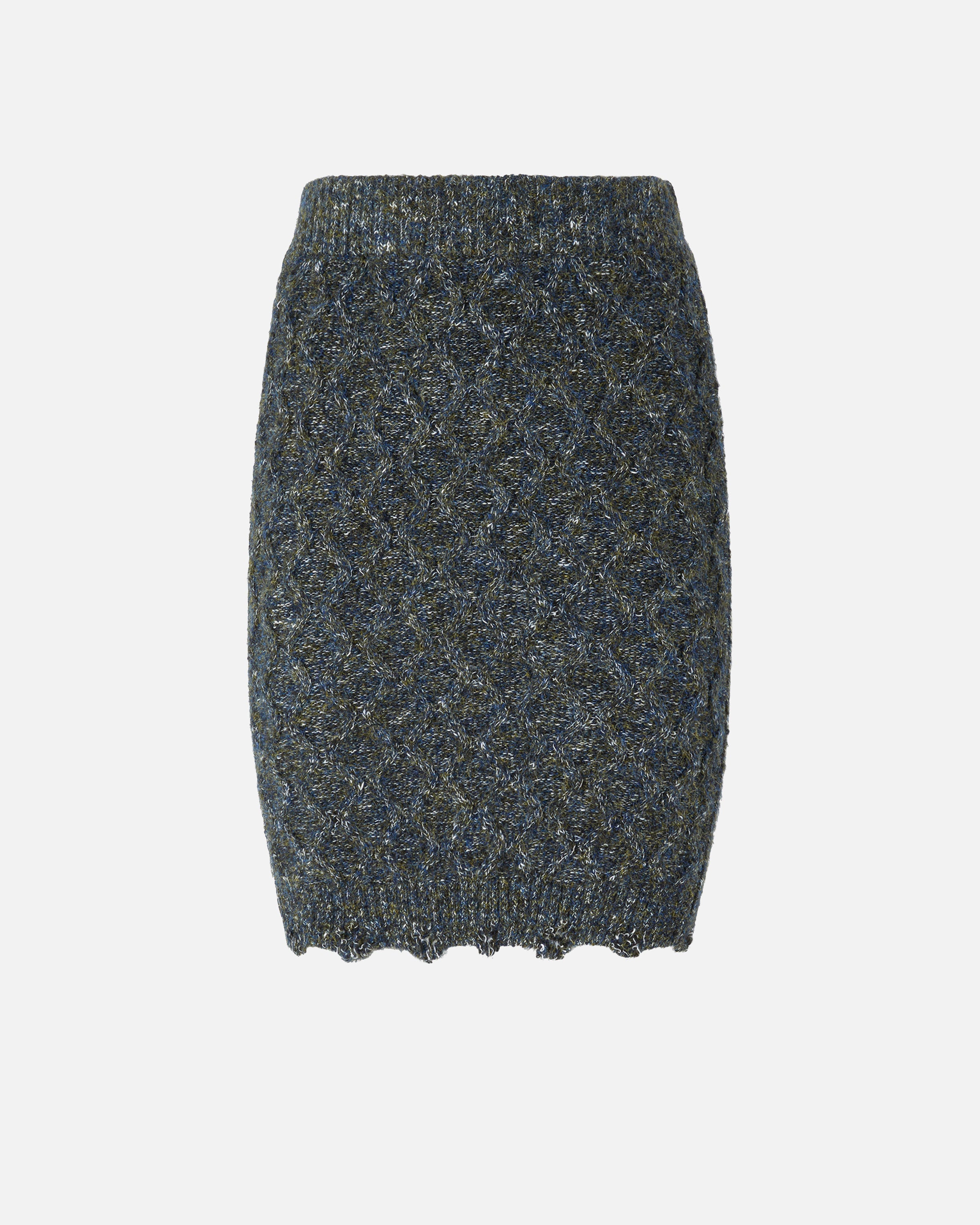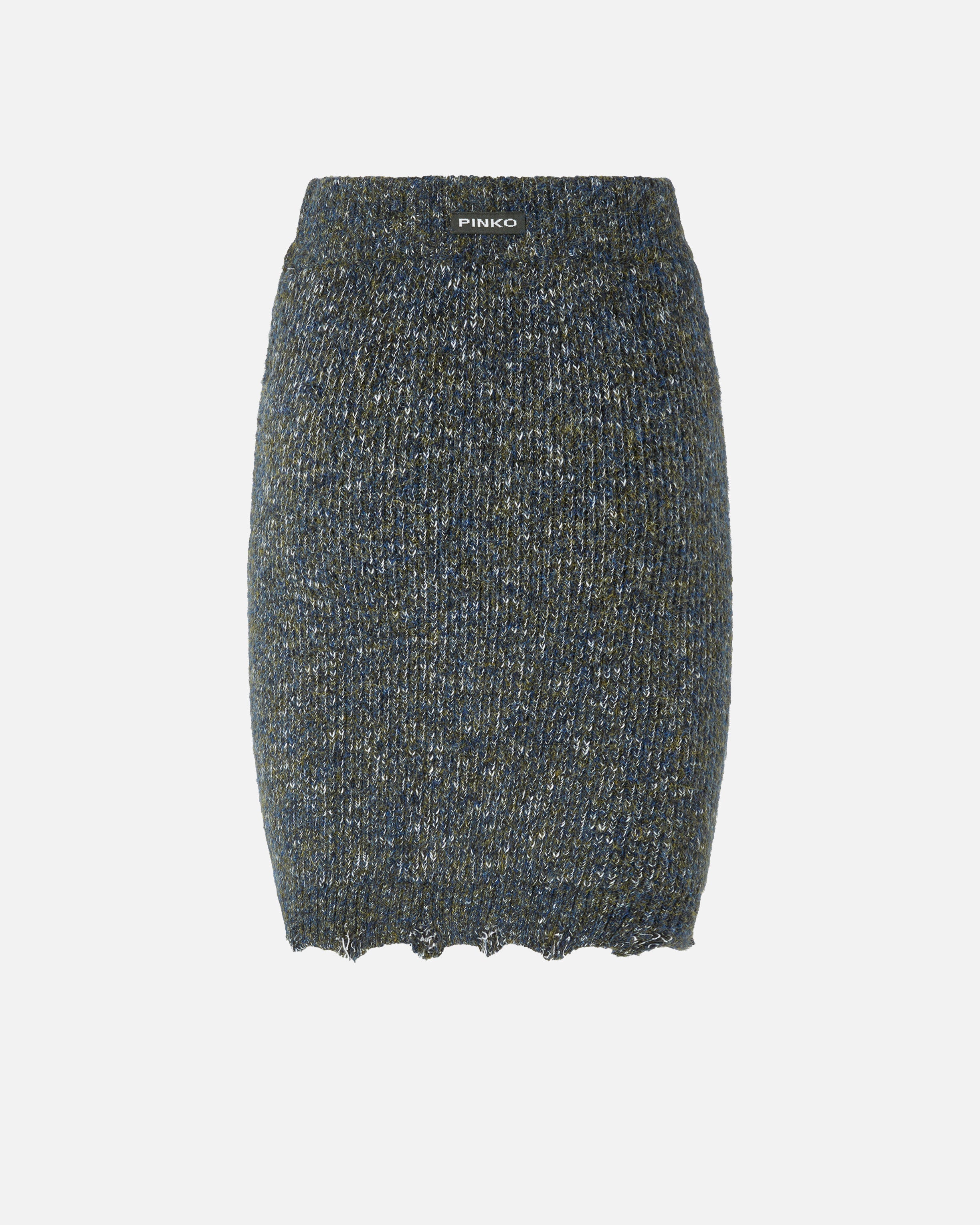 Kurzer Rock in Strick aus verschiedenfarbigen Garnen, der sich durch eine gerippte Verarbeitung auf der Rückseite und ein Zopfmuster auf der Vorderseite auszeichnet, das dem Design Bewegung und Dreidimensionalität verleiht. Der Taillenbund, der durch ein kleines Etikett mit PINKO-Logo als Lettering personalisiert wird, ist elastisch, ebenso wie der Saum, der eine zarte Bogenkante aufweist. Erwärmen Sie Ihre Winteroutfits mit diesem Kleidungsstück, das für einen raffinierten und essentiellen Total Look mit dem passenden Rollkragenpullover kombiniert werden kann. Das Kleidungsstück wurde Veredelungsprüfungen unterzogen, um die mögliche Bildung von Pilling zu minimieren und ein weicheres und haltbareres Gewebe zu gewährleisten.