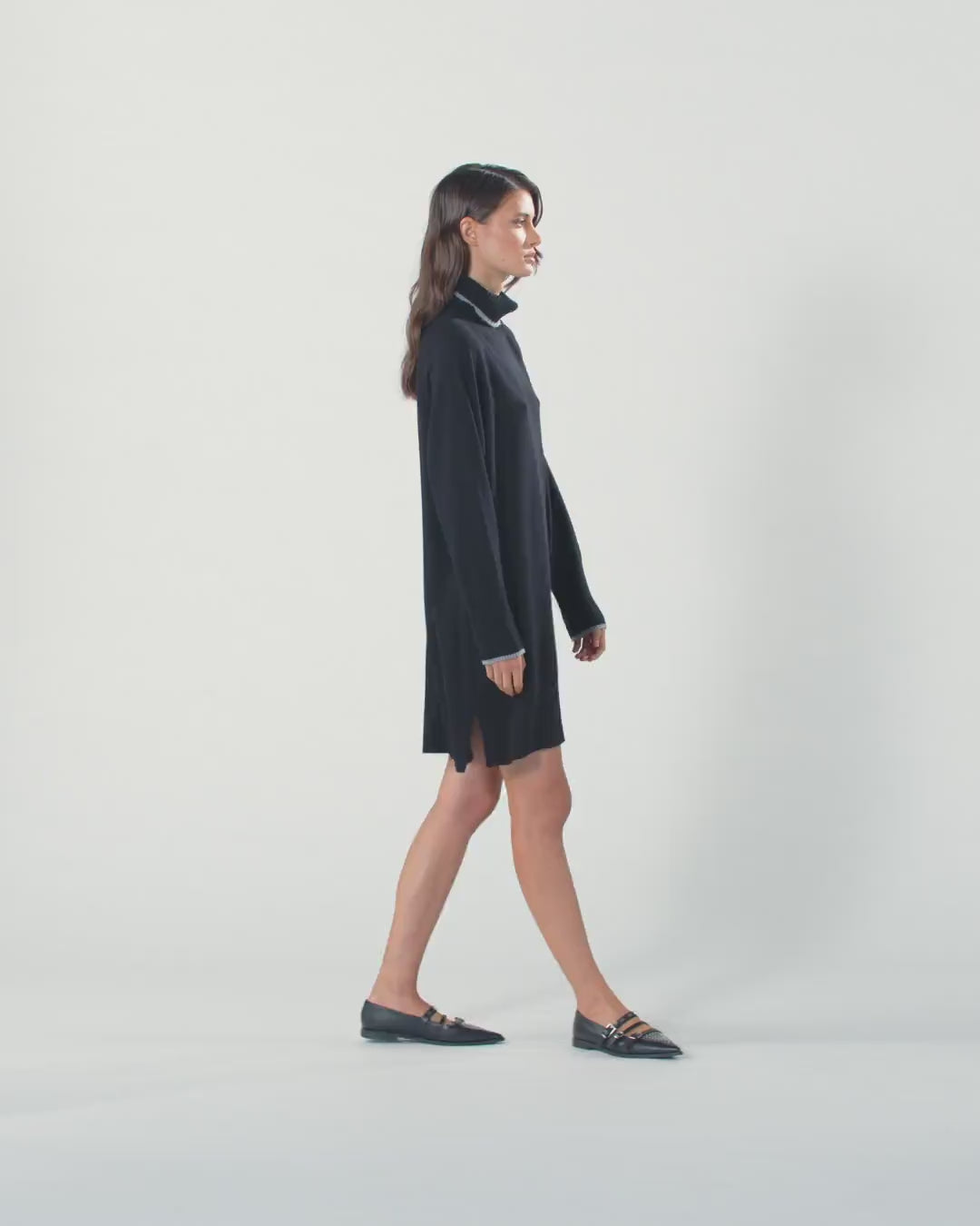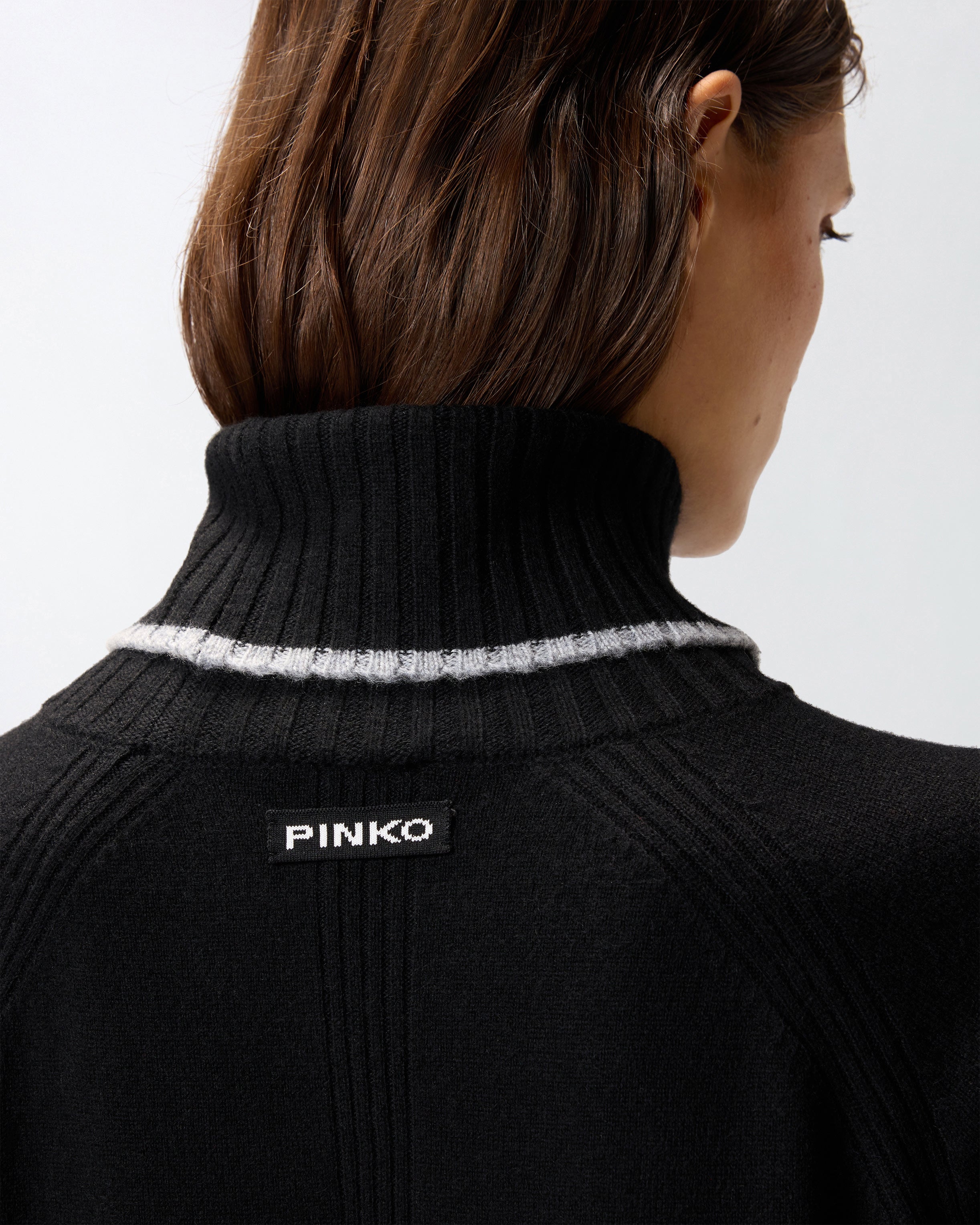 Kurzes Kleid mit weiter Silhouette aus weichem Strick in einer Mischung aus Merinowolle und Kaschmir mit kontrastierenden Säumen an den langen Ärmeln und dem Rollkragen. Das Kleidungsstück wurde Veredelungsprüfungen unterzogen, um die mögliche Bildung von Pilling zu minimieren und ein weicheres und haltbareres Gewebe zu gewährleisten. Kragen, Saum und Bündchen sind gerippt, während das Etikett Ton in Ton mit dem PINKO-Logo als Lettering im Nacken alles abrundet.